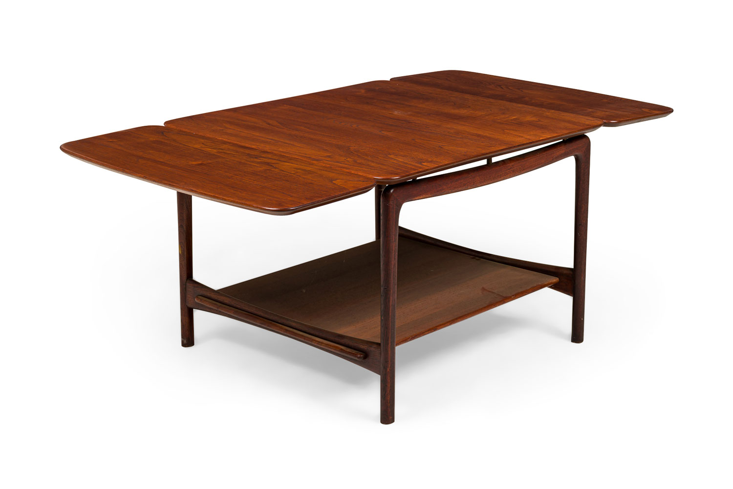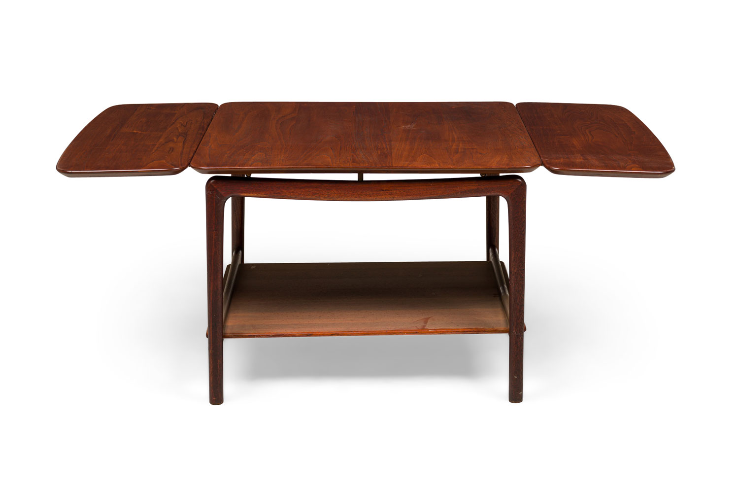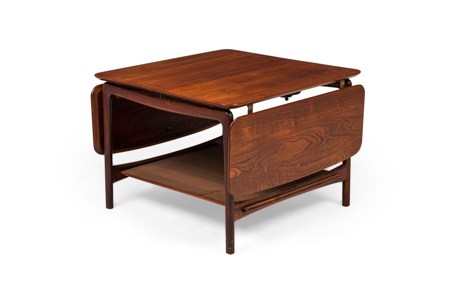 Danish Mid-Century square teak end/side table with two drop leaves, supported by a four legged frame with a bottom stretcher shelf.(Similar tables: DUF0381, DUF0382)