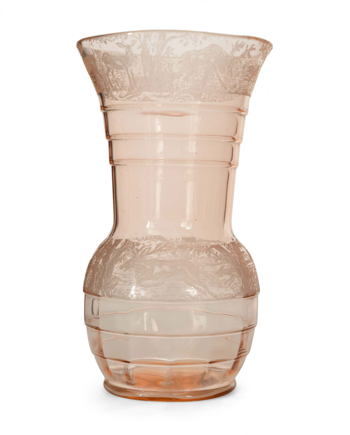 Vintage urn-shaped pink-tinted glass vase with a wide, flared neck, ribbing on neck and base, and an engraved hunt scene with elks and wolves