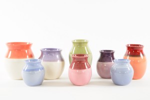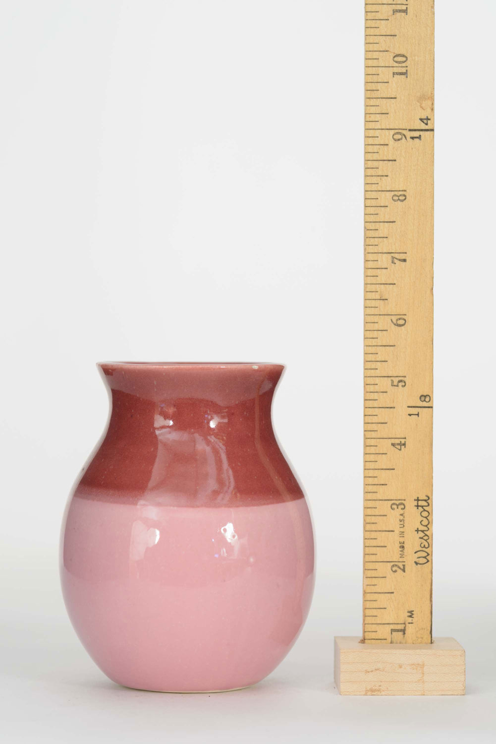 Bulbous-shaped, rose-colored glazed ceramic vase with maroon glaze on top third