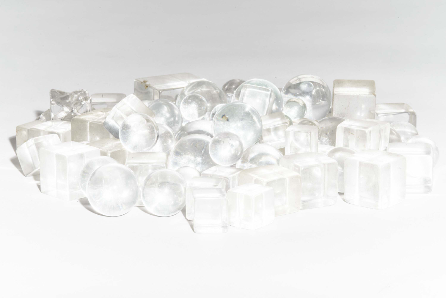 Assorted size clear plastic ice cubes and spheres (0.50-1.25 inches)