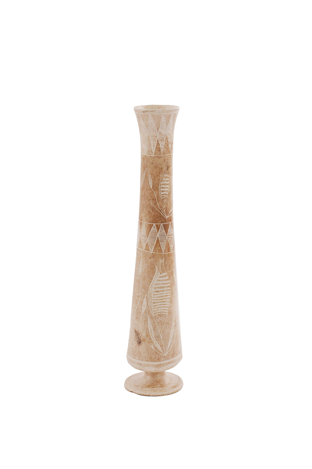 Polished sandstone vase with a tapered body, fluted rim, and circular foot featuring an etched primitive design of corn and fish (Similar vases: BIN047A, BIN047B)