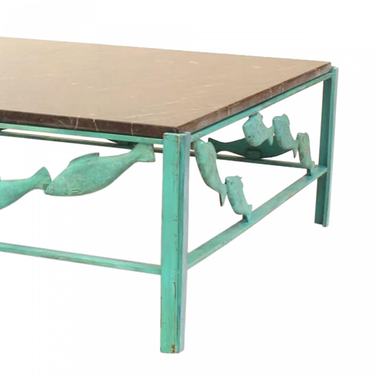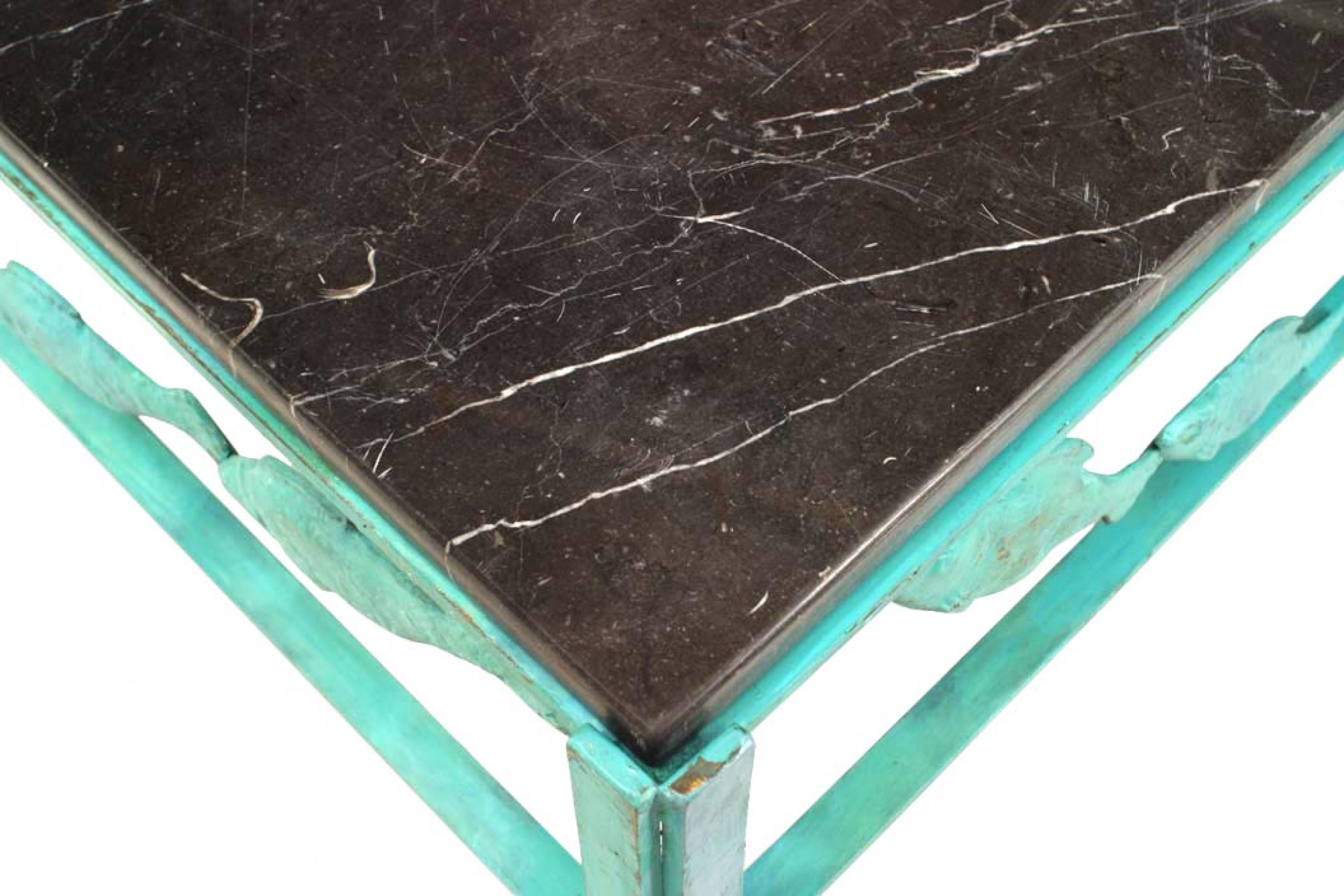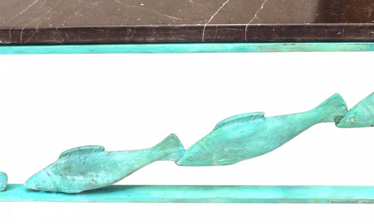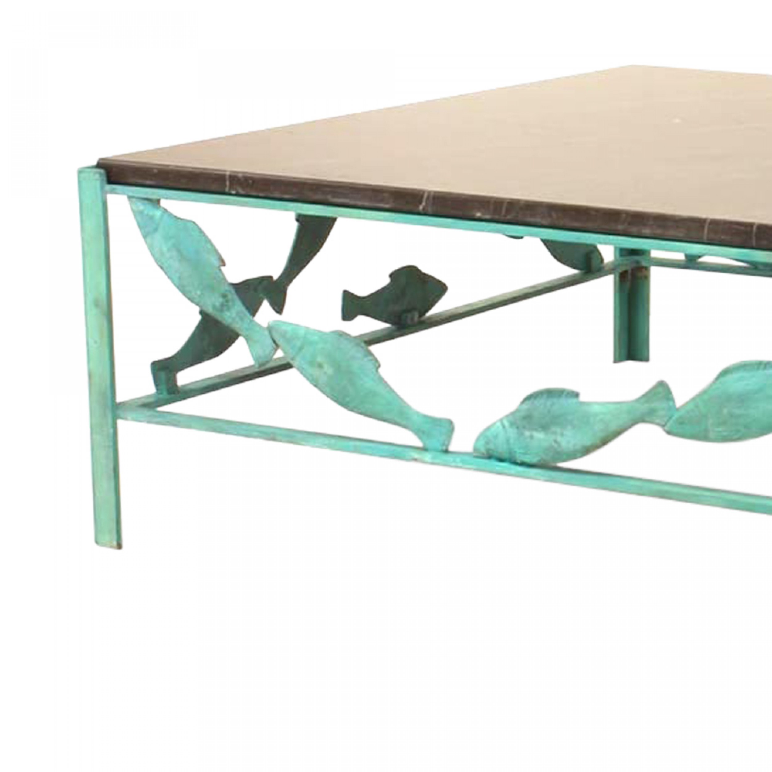 French Modern Design bronze verdigris patina square coffee table with fish design on apron and a black marble top. (by JACQUES DUFRESNE)