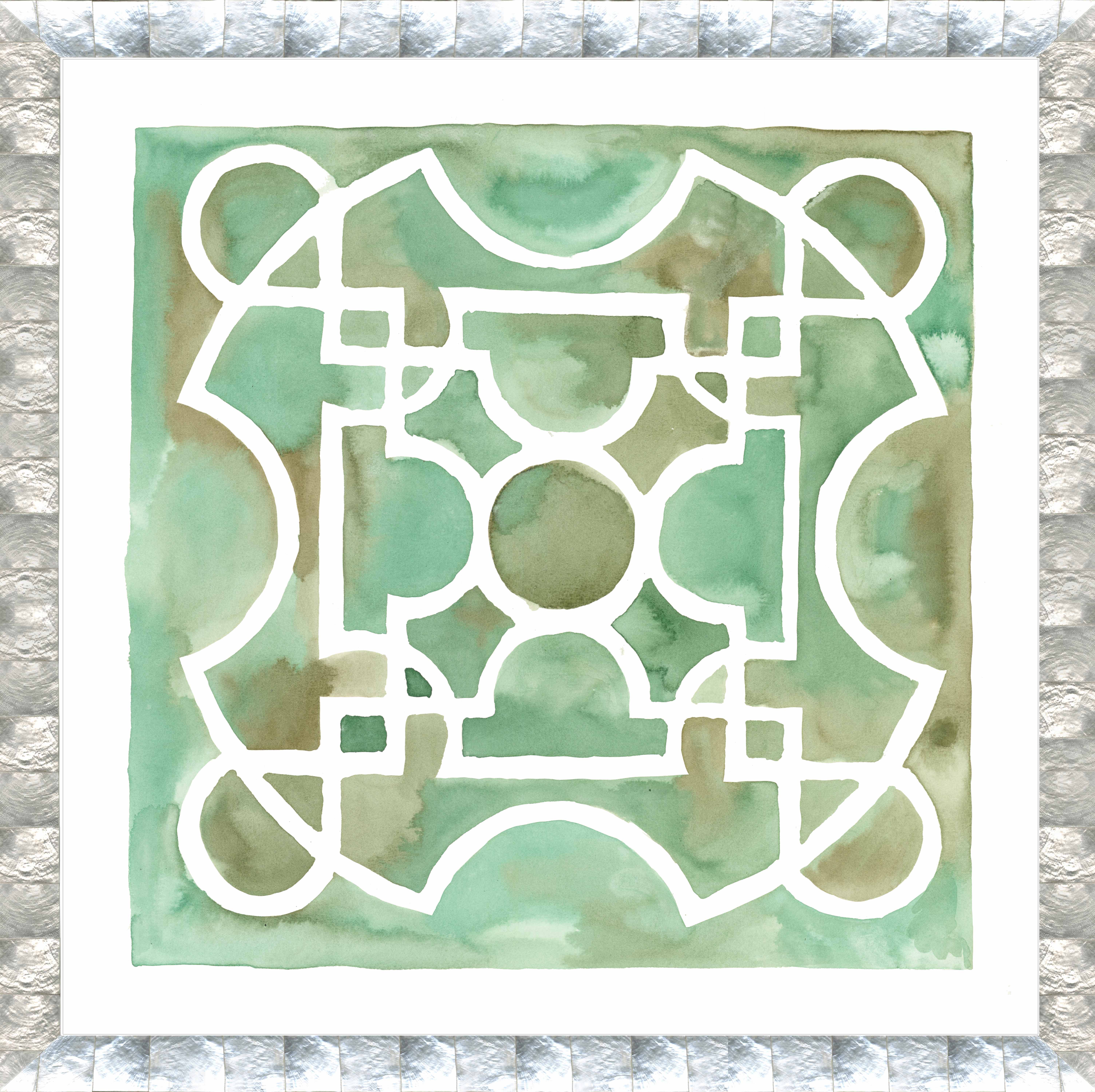 Contemporary print of a watercolor painting of a garden plot in green and white in a faux gray stone frame (Companion pieces: 061575, 061576, 061577)