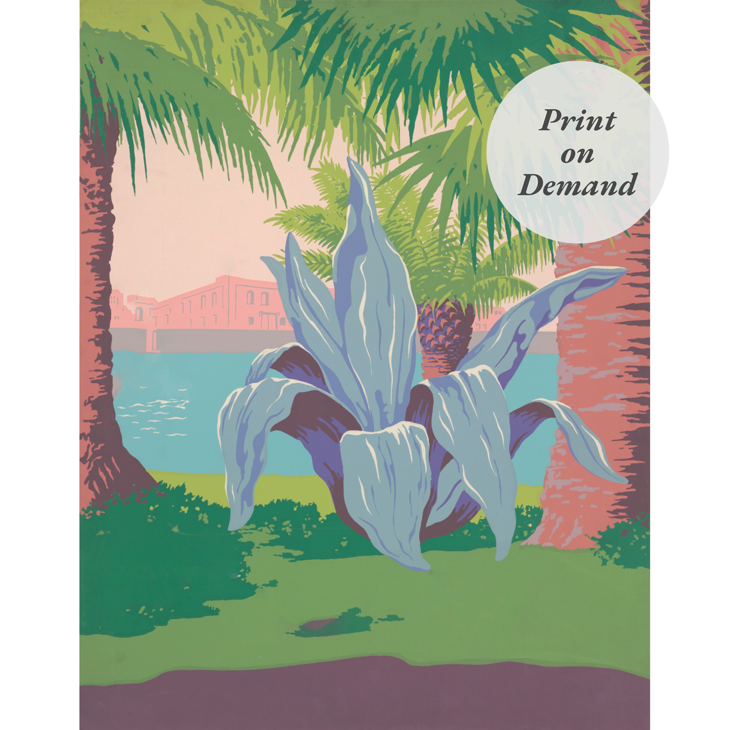 Mid-Century Mid Century style lithograph of a canal scene with several palm trees and century plant.