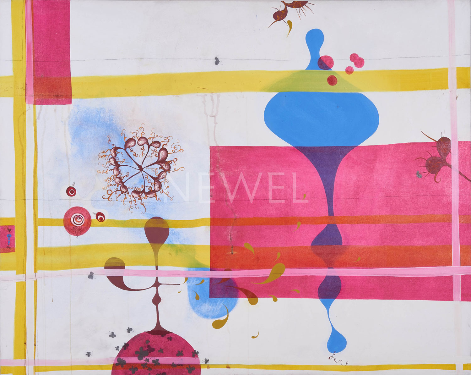 Contemporary abstract painting of multicolored shapes titled, "Process Curl" on canvas (Similar pieces: AAP136, AAP137, AAP139, AAP140)