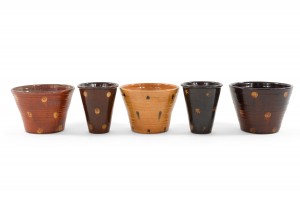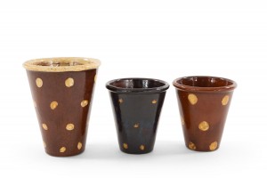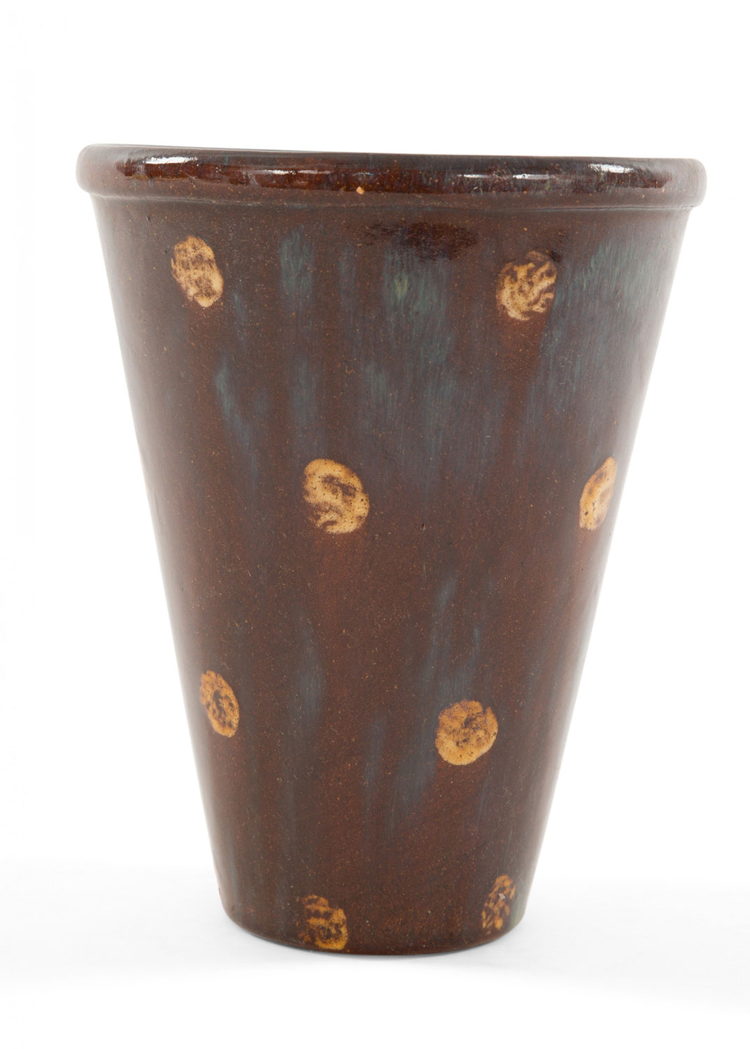 Tapered, dark purple glazed ceramic cachepot with cupped rim and yellow polka dots (Related item: MP2060T, MP2060S)