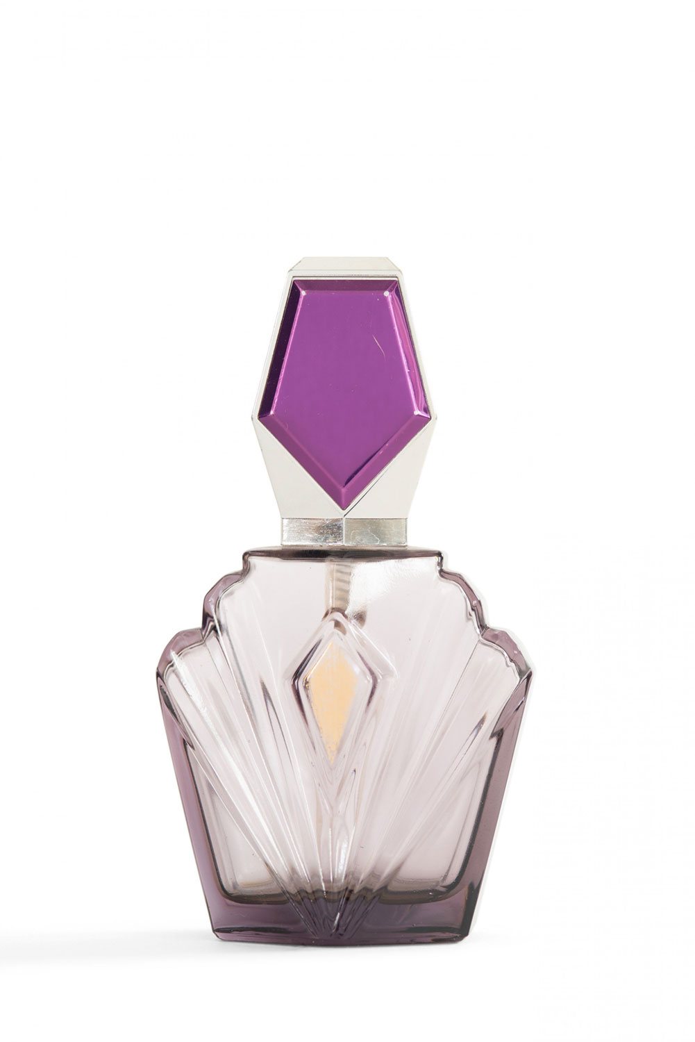 Purple-tinted glass perfume bottle with geometric design and a matching metallic plastic top