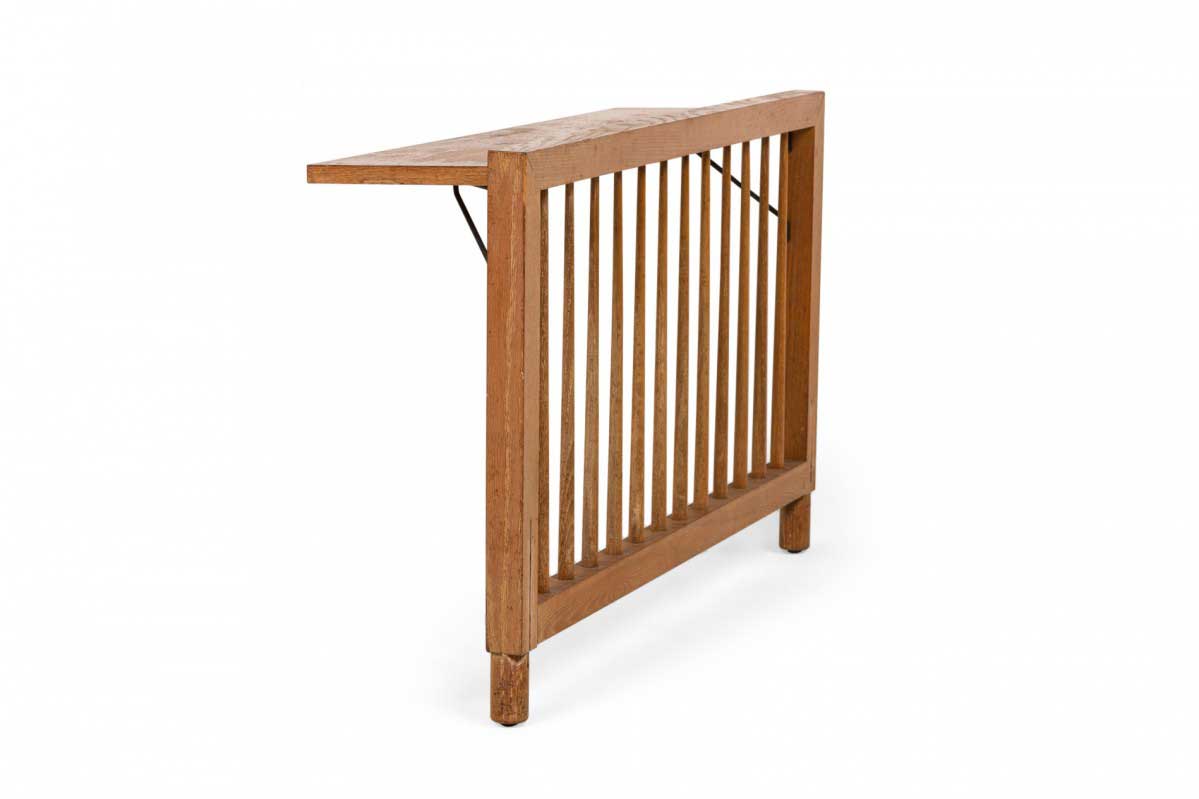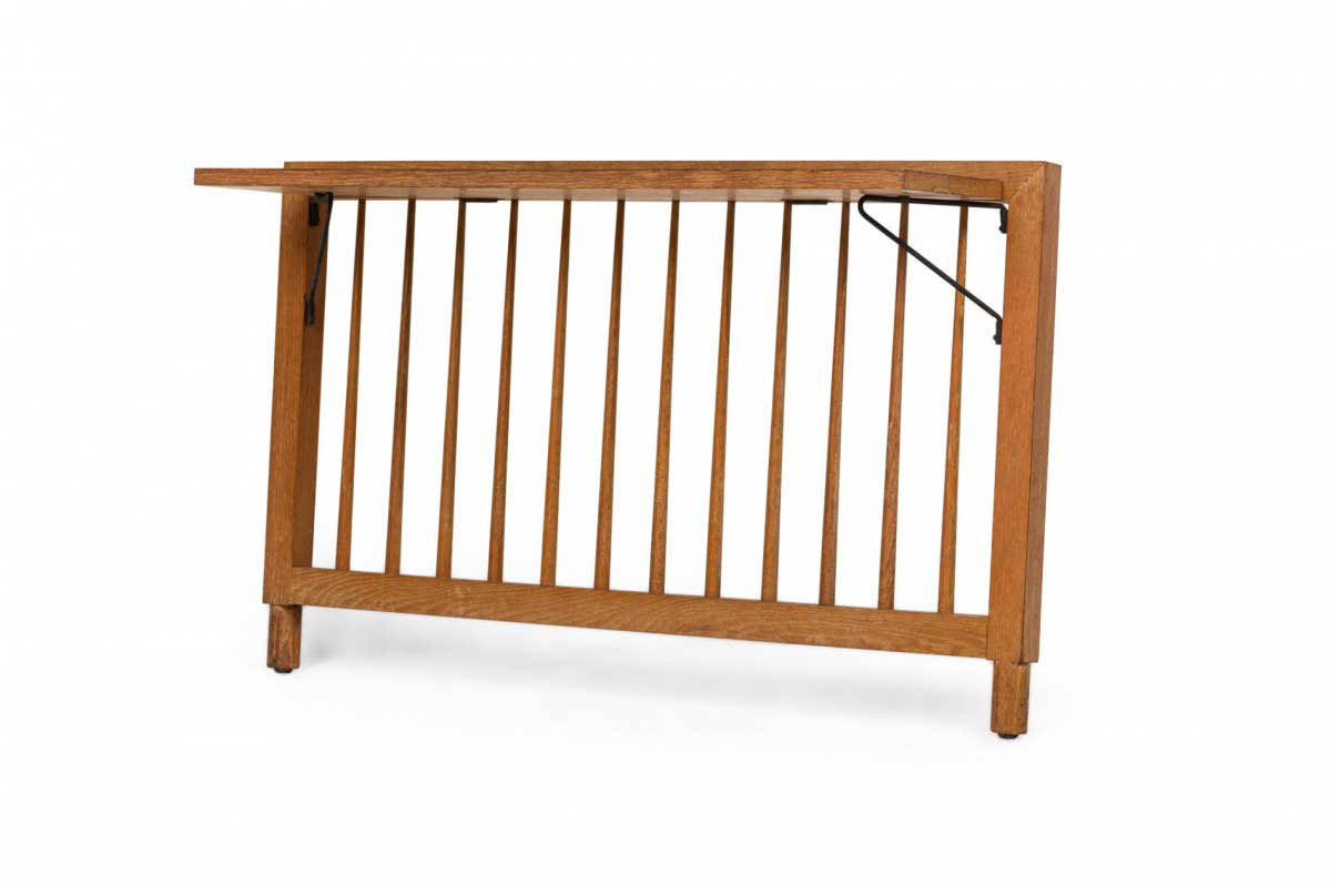 Mid-Century American (circa early 1950s) single-size spindle style wooden head and footboard with extending shelf in a streamlined, functional style with a proprietary orange wash finish which allows the wood grain to show through.(Companion piece: DUF0919)