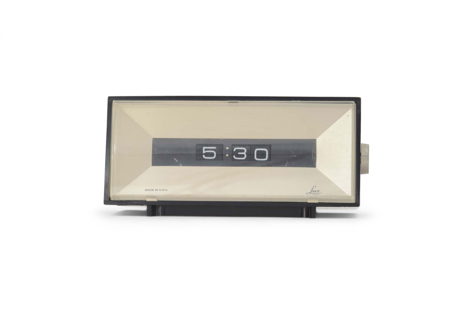 Rectangular black plastic alarm clock with a silver metal face and white numbers