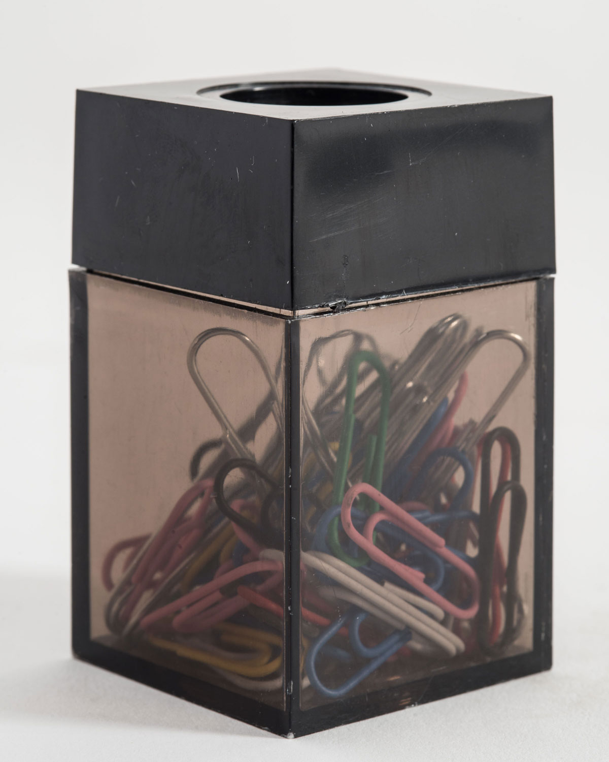 Rectangular black plastic magnetic paper clip holder with assorted paper clips