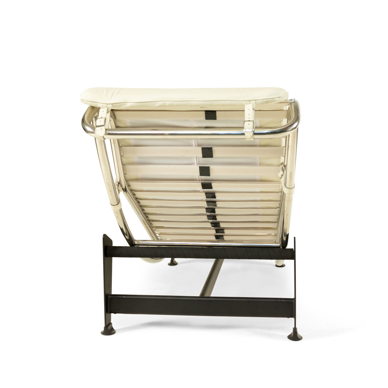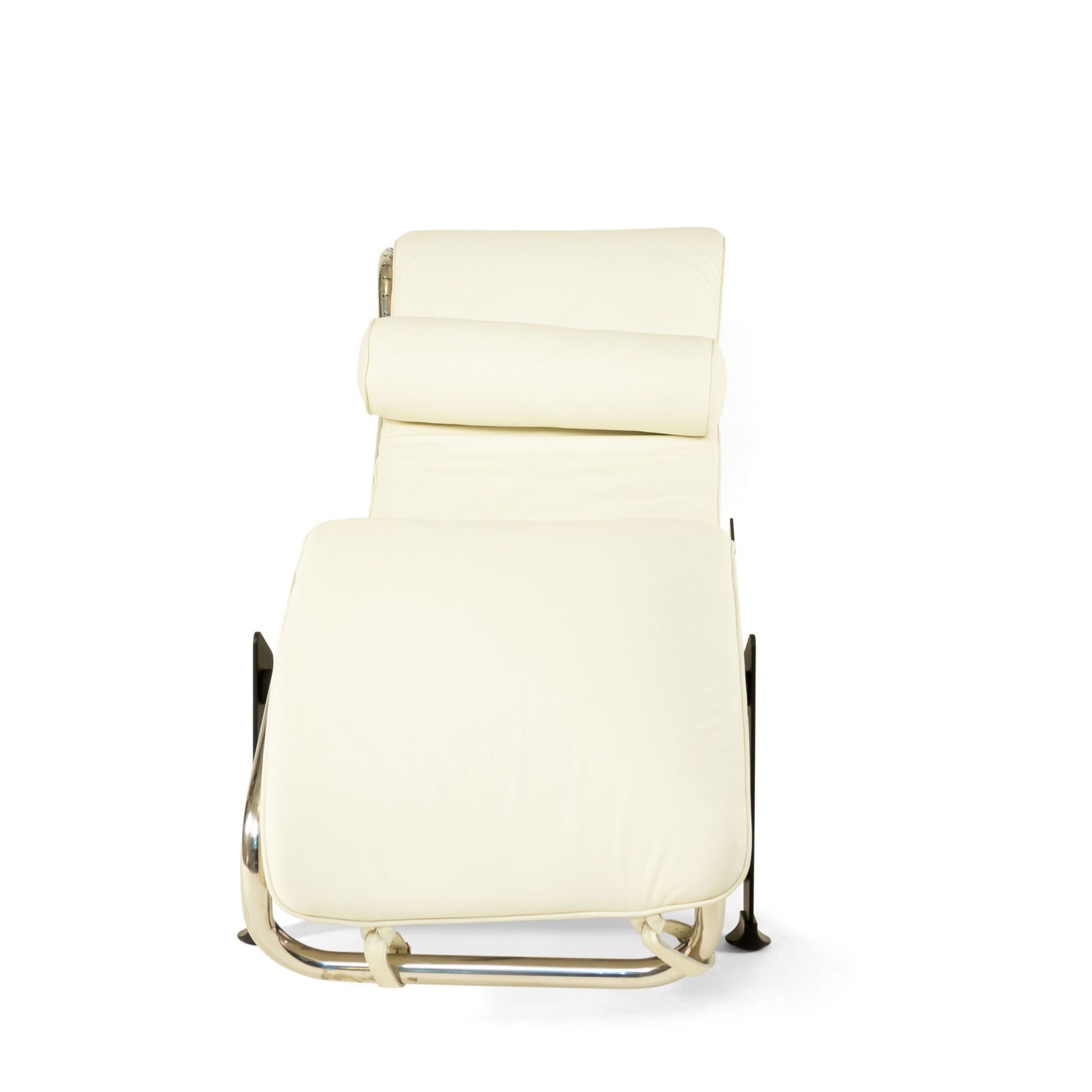 Mid-Century modern style chaise. A polished stainless steel contoured shaped frame under a WHITE leather cushion with a bolster head rest cushion