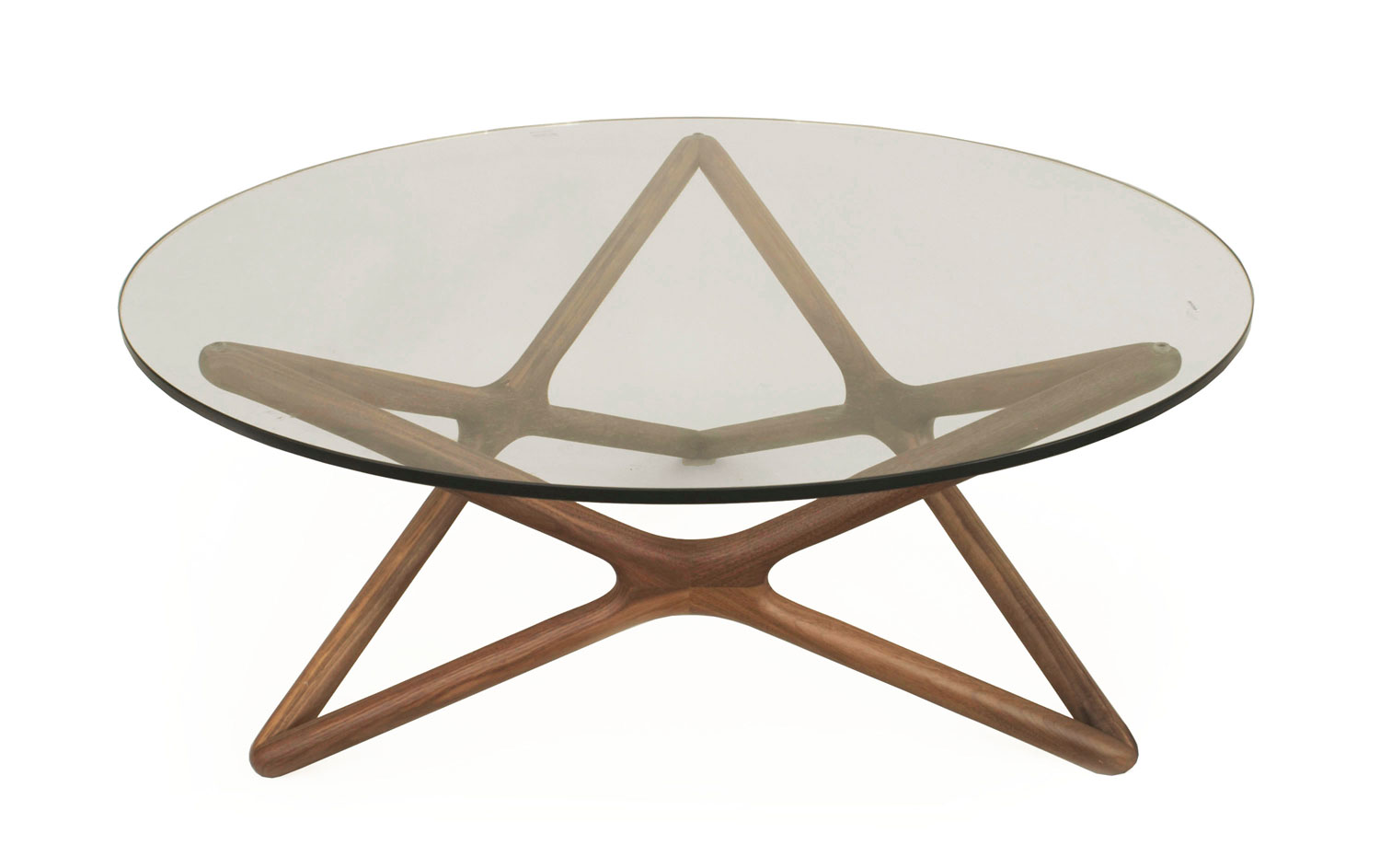 American Mid-Century modern style solid walnut and glass coffee table with a six-pointed star frame base and a half-inch thick round glass top. (Related item: JPB026)