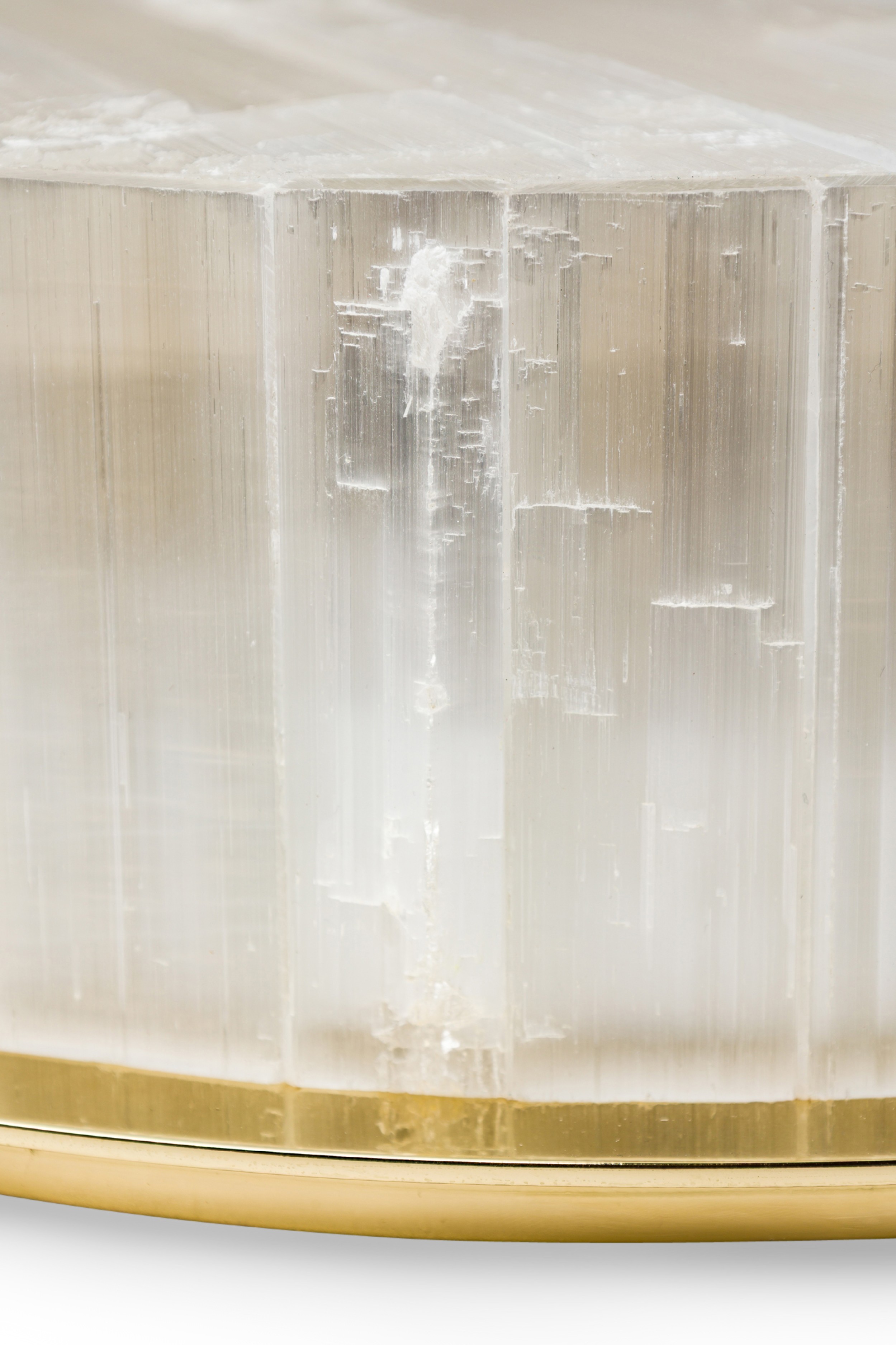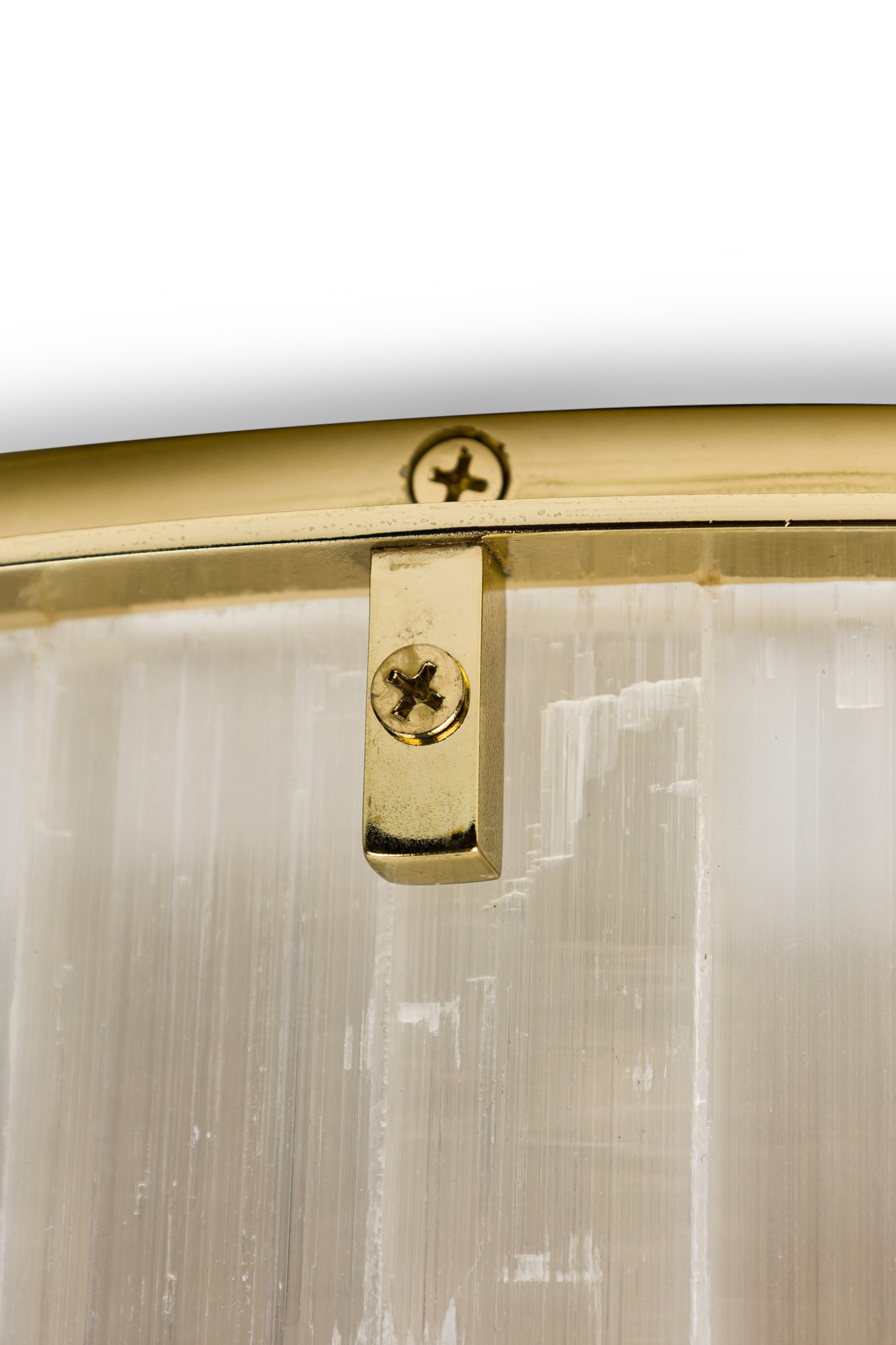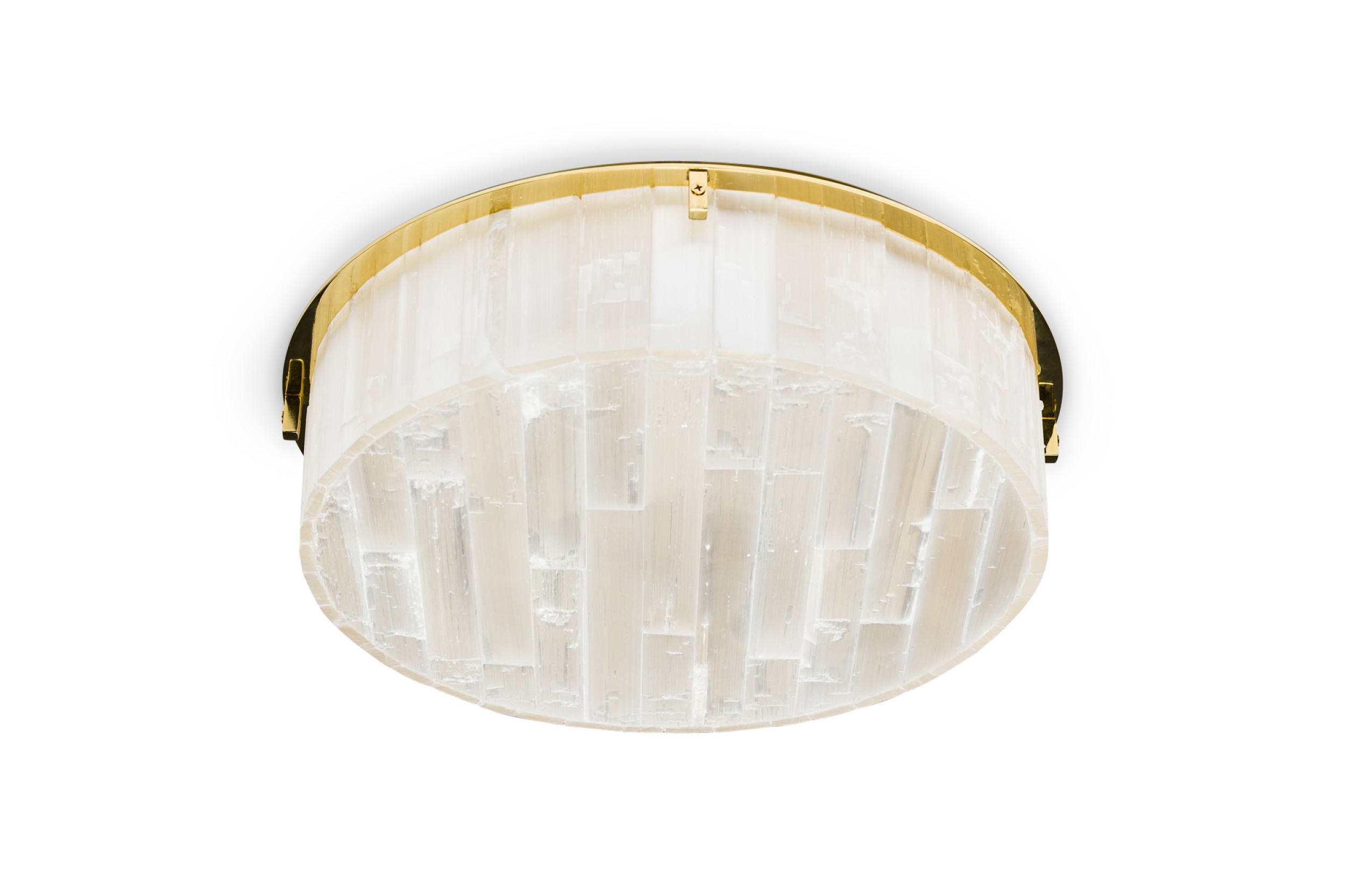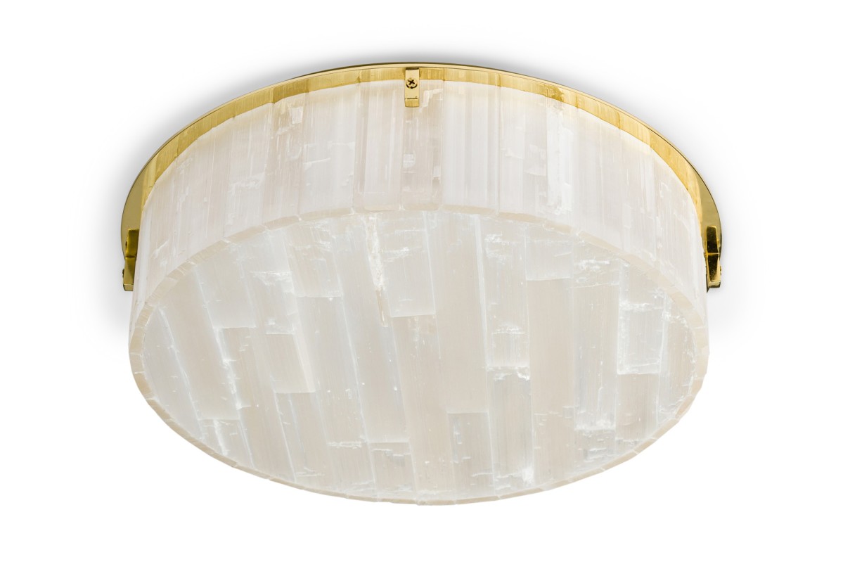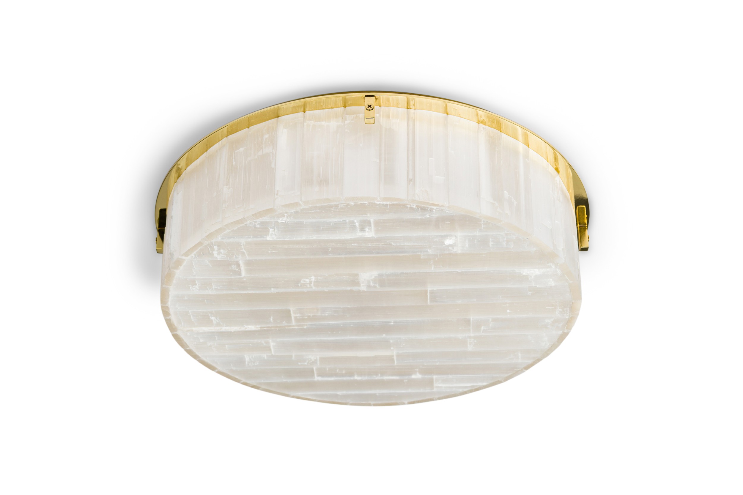American contemporary "Litalla" round chiseled selenite ceiling fixture with narrow vertical panel design supported by 4 polished brass "L" brackets originating from a housing plate