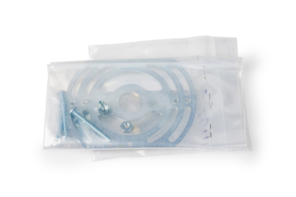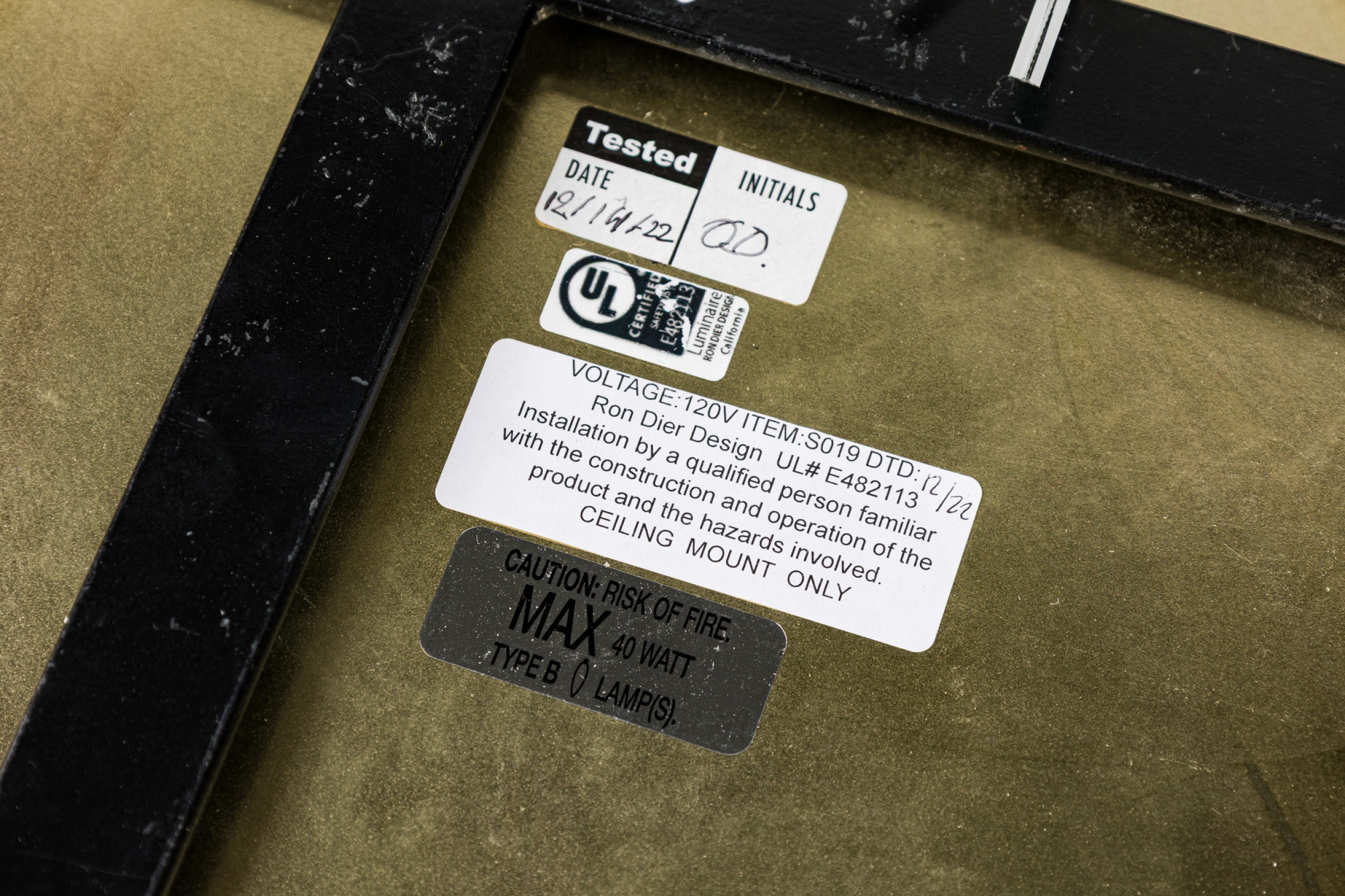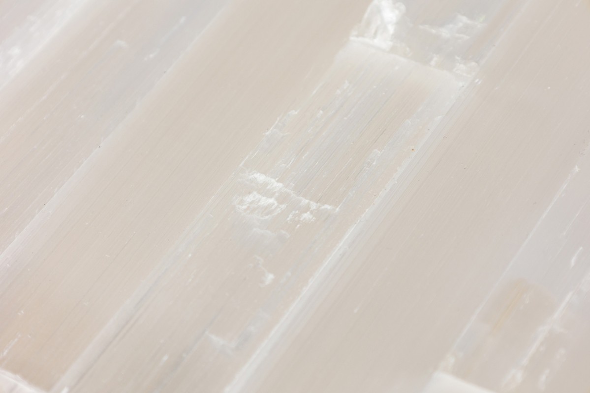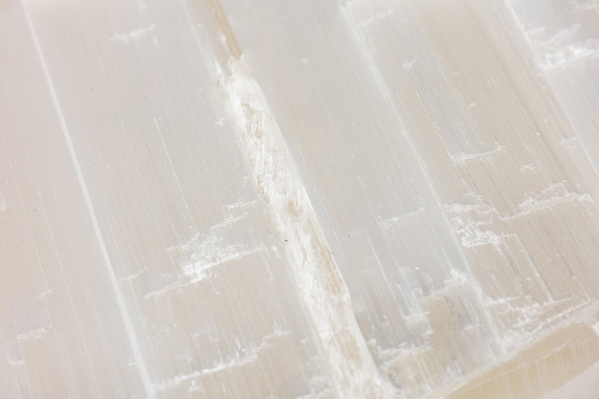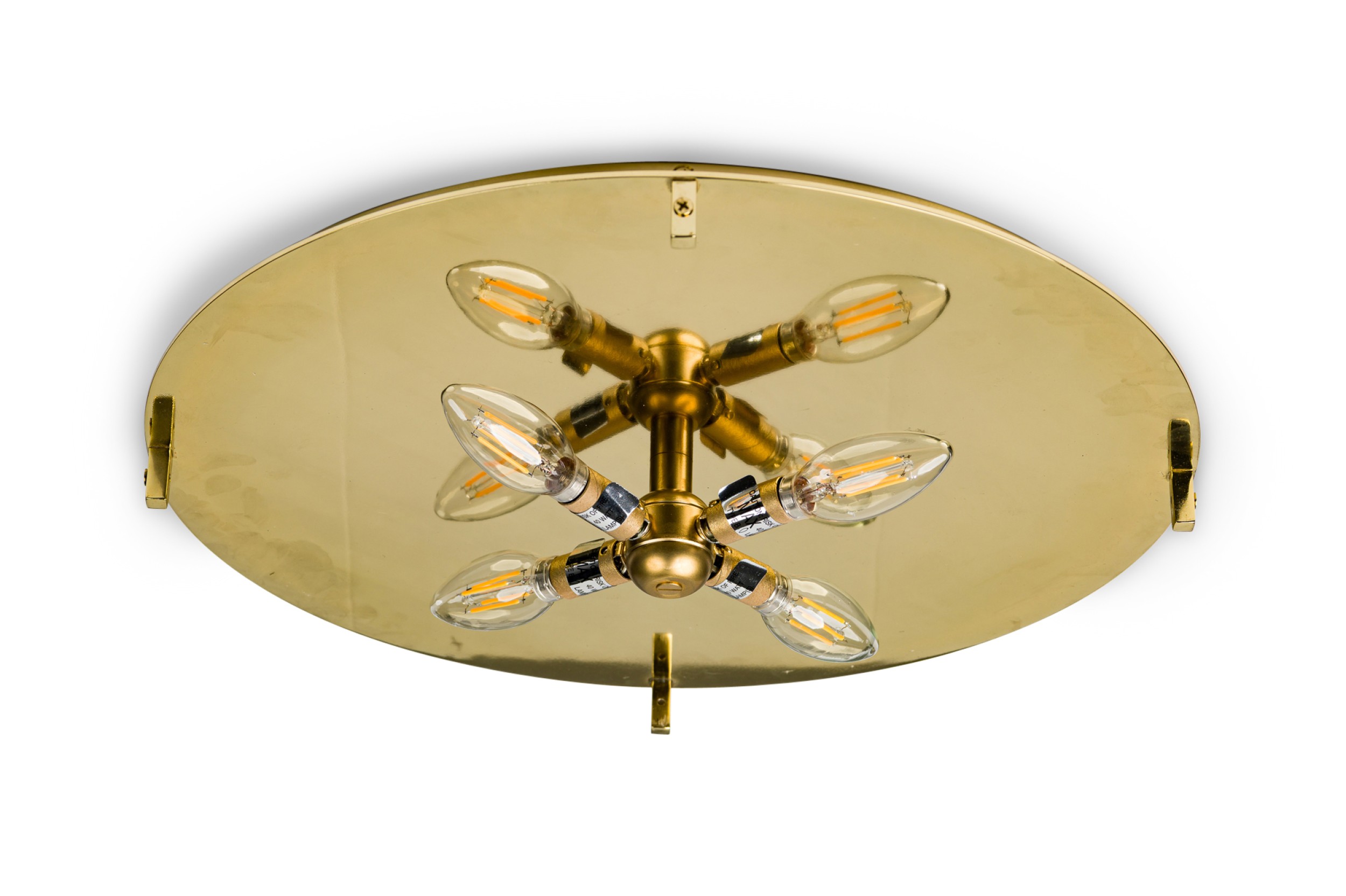 American contemporary "Litalla" round chiseled selenite ceiling fixture with narrow vertical panel design supported by 4 polished brass "L" brackets originating from a housing plate