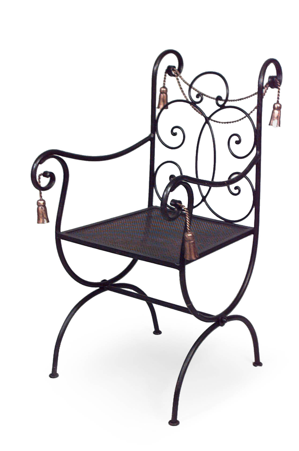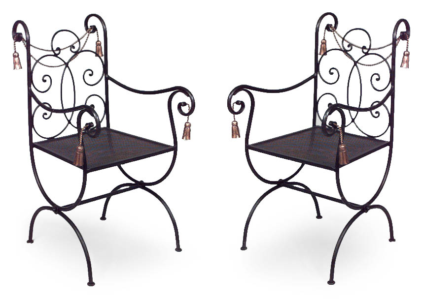 2 rope and tassel design black and gold painted iron arm chairs with cross legs (20th Cent.) (PRICED EACH)