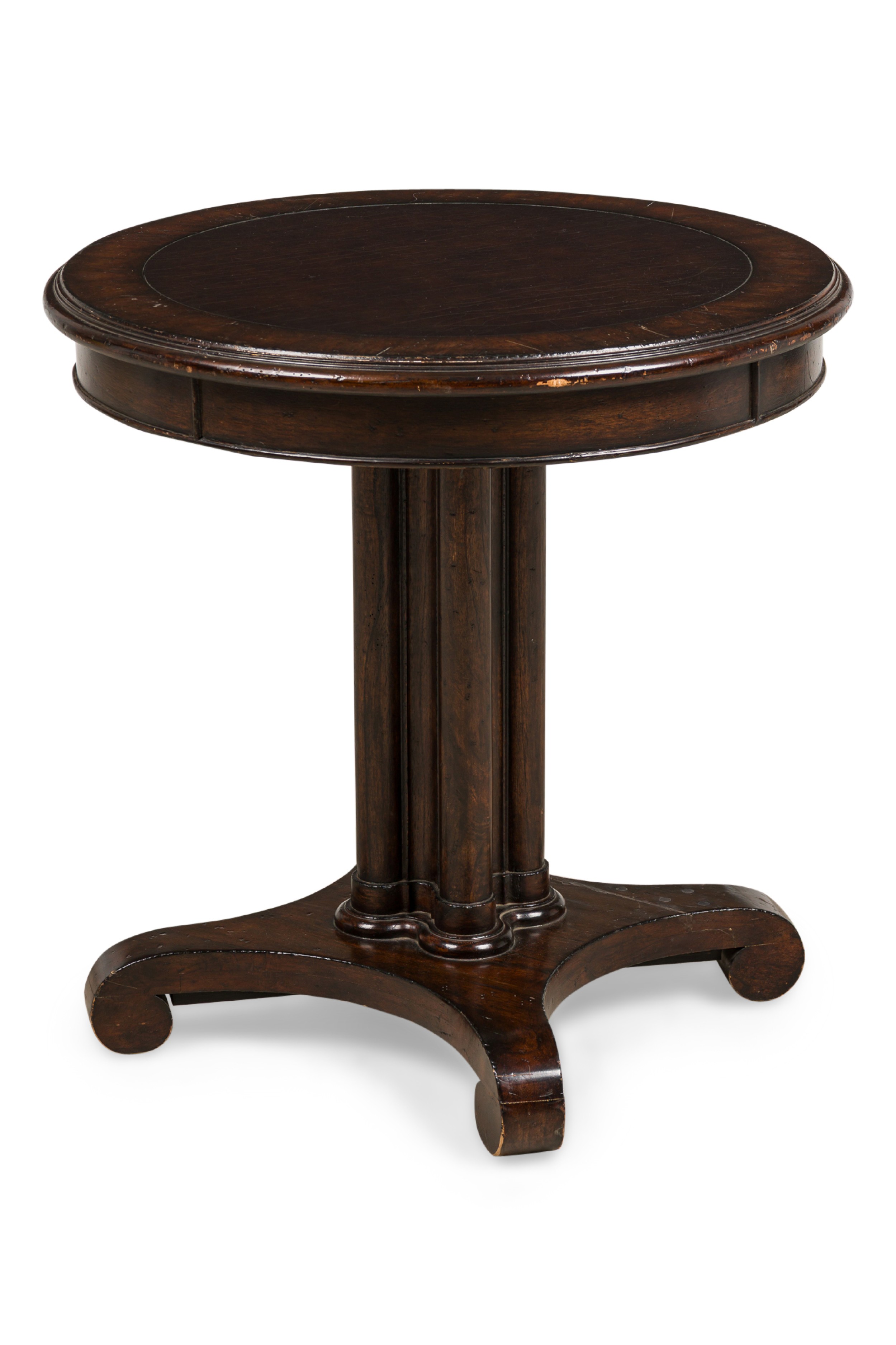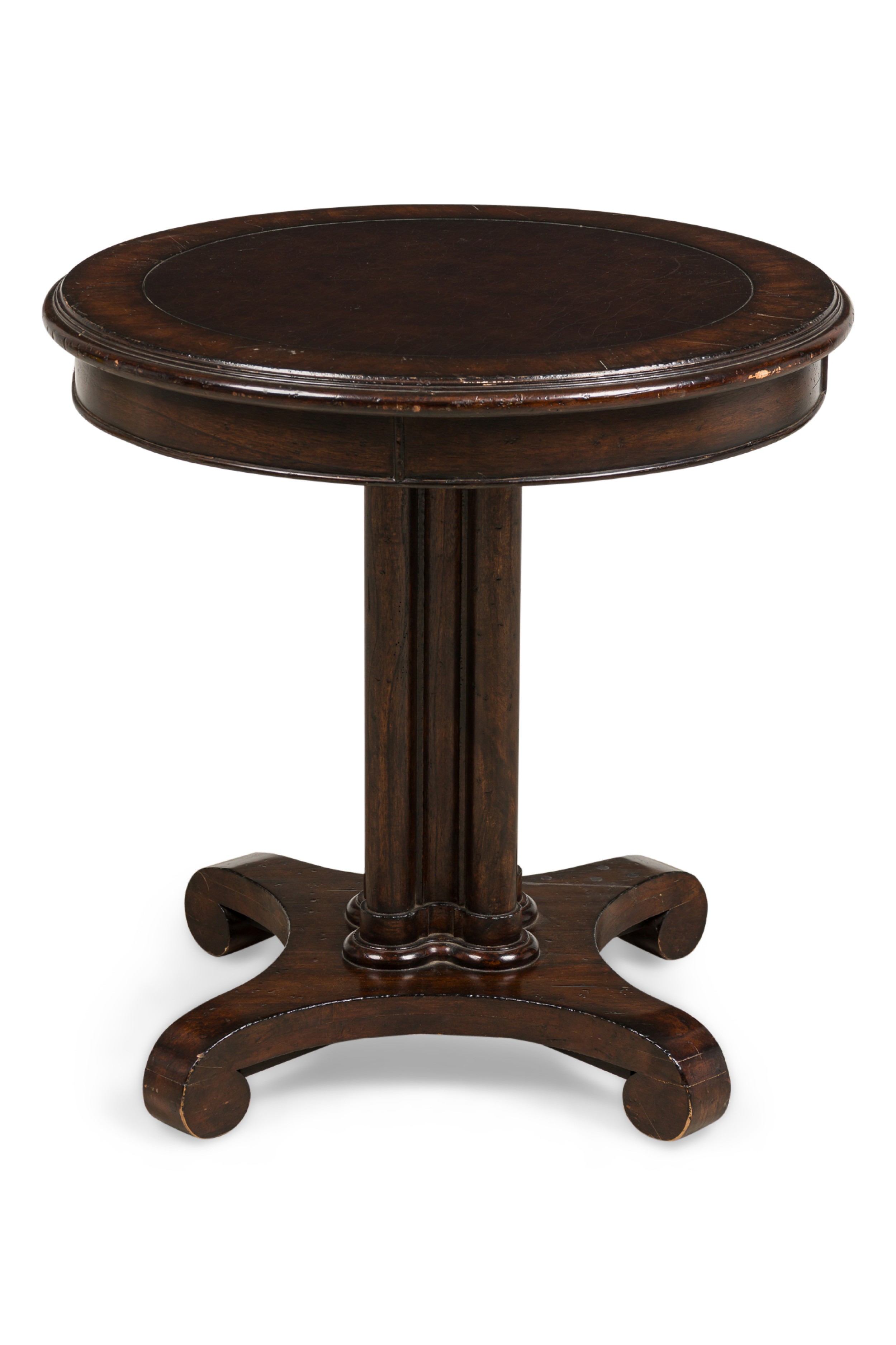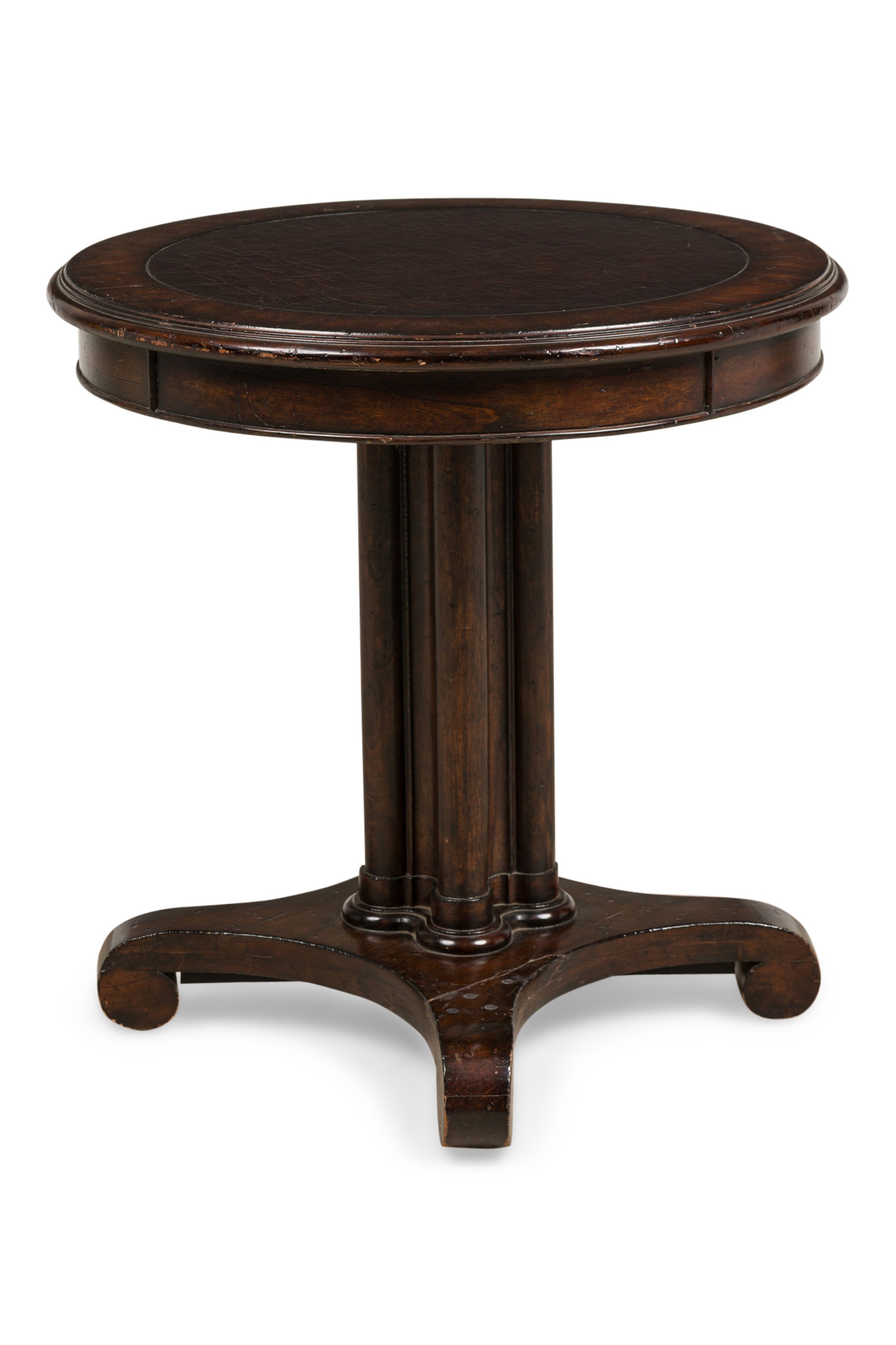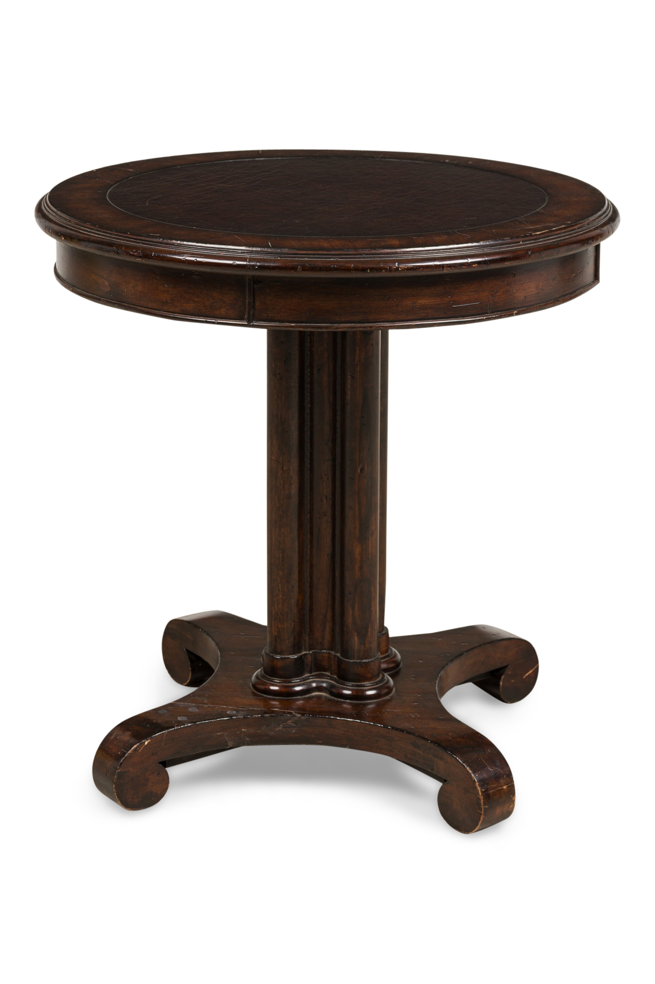 English Regency style round center / end table in a dark brown wood top with leather inlay supported by fluted pedestal base atop 4 scroll feet