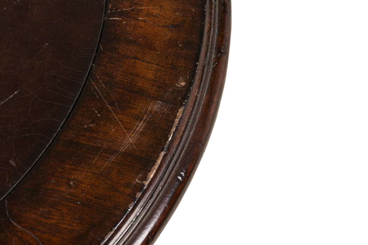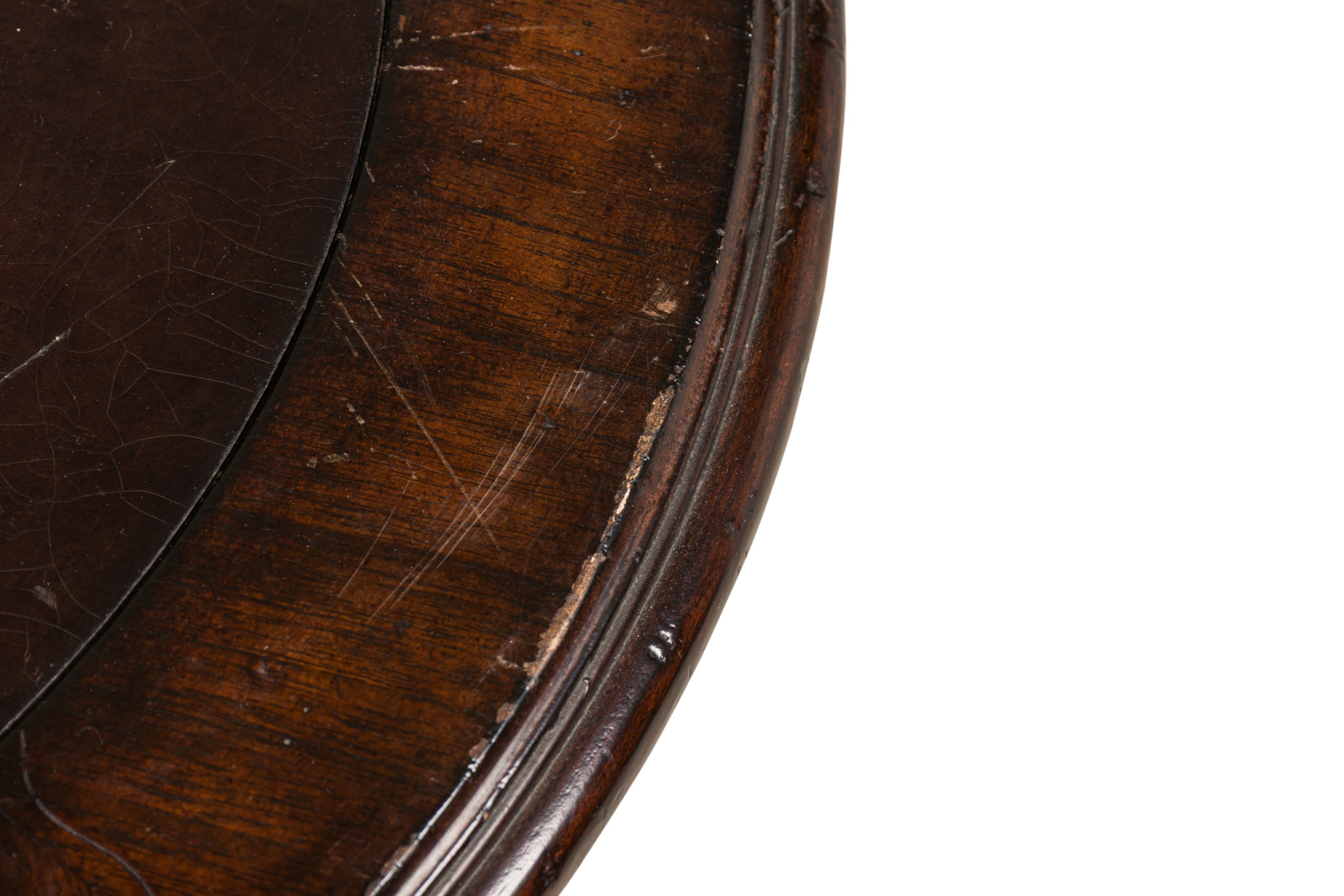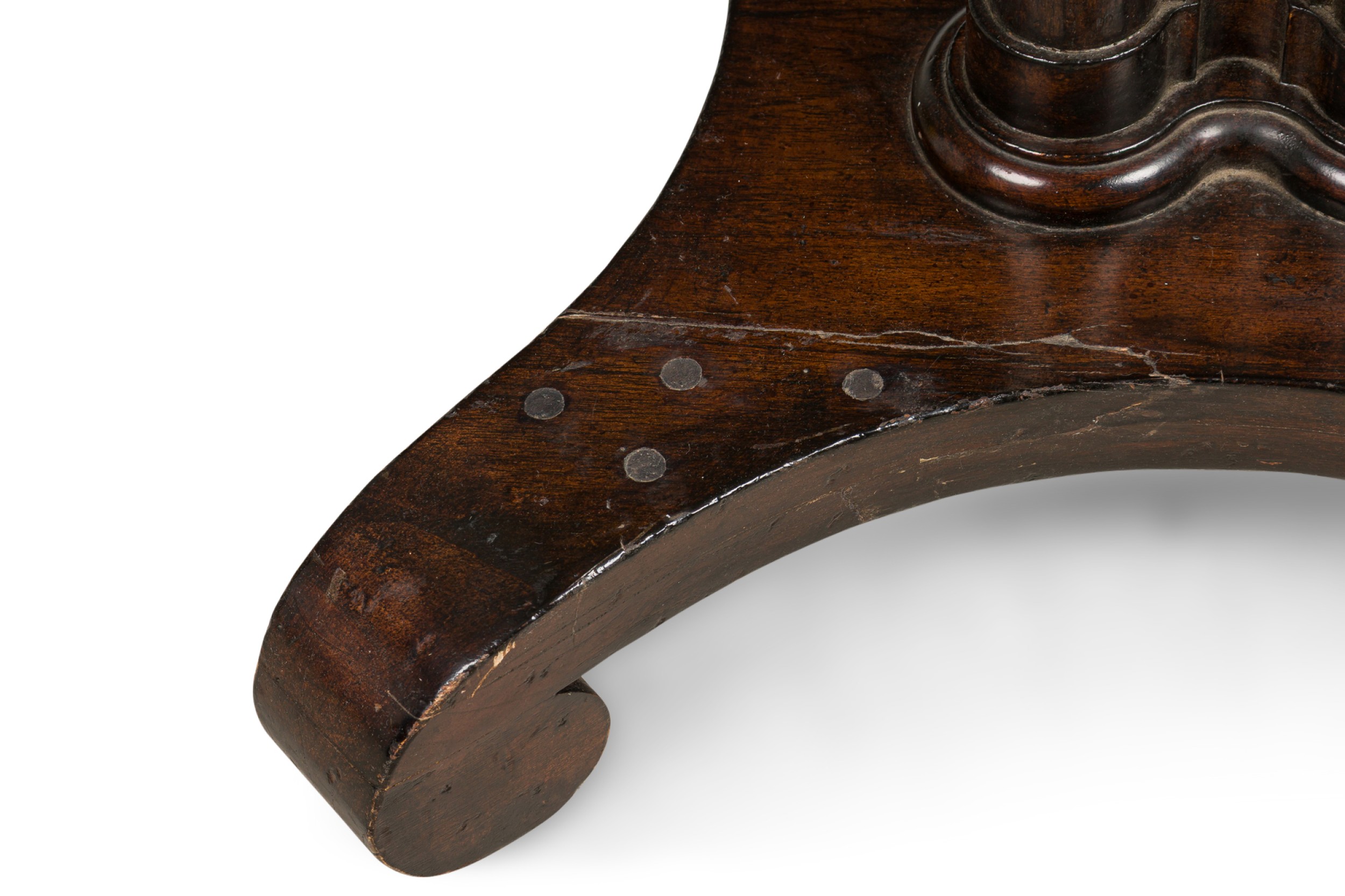 English Regency style round center / end table in a dark brown wood top with leather inlay supported by fluted pedestal base atop 4 scroll feet