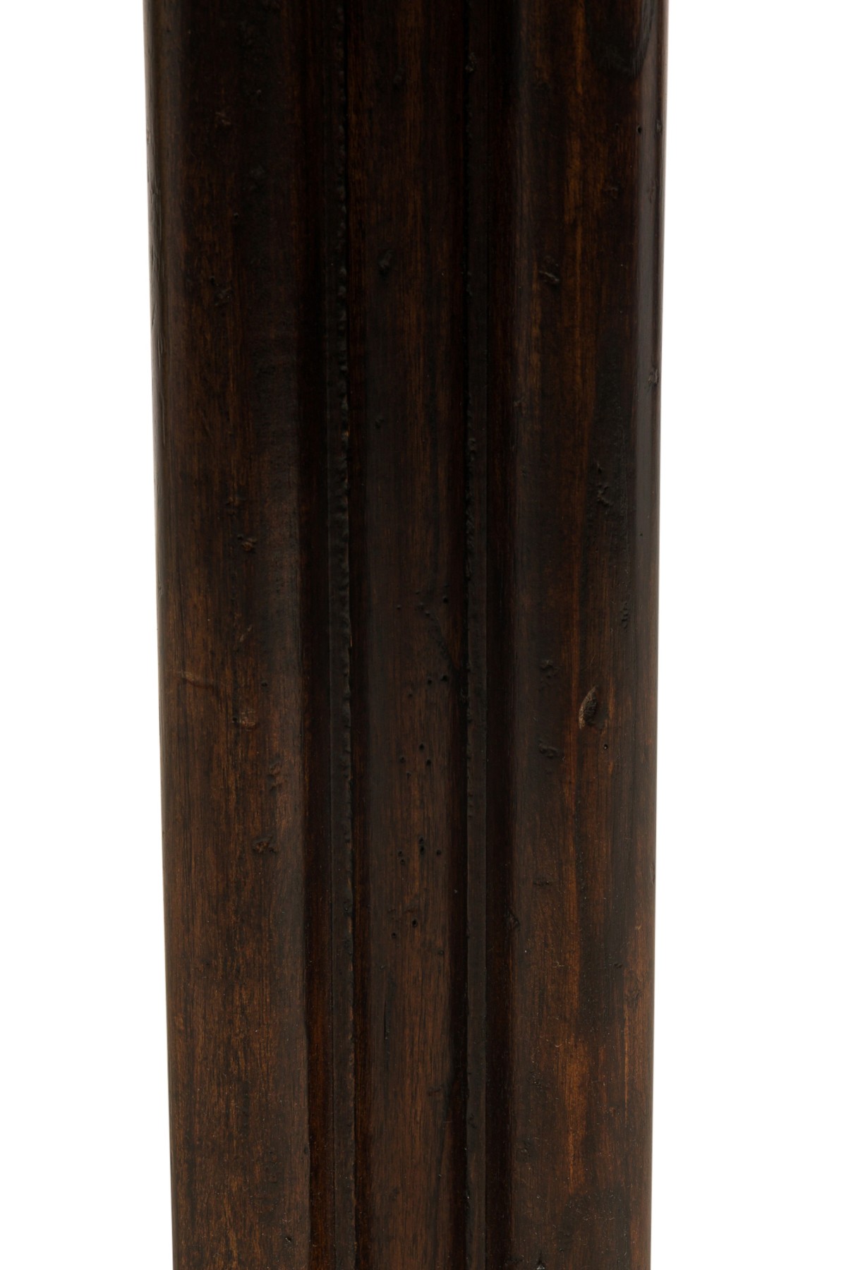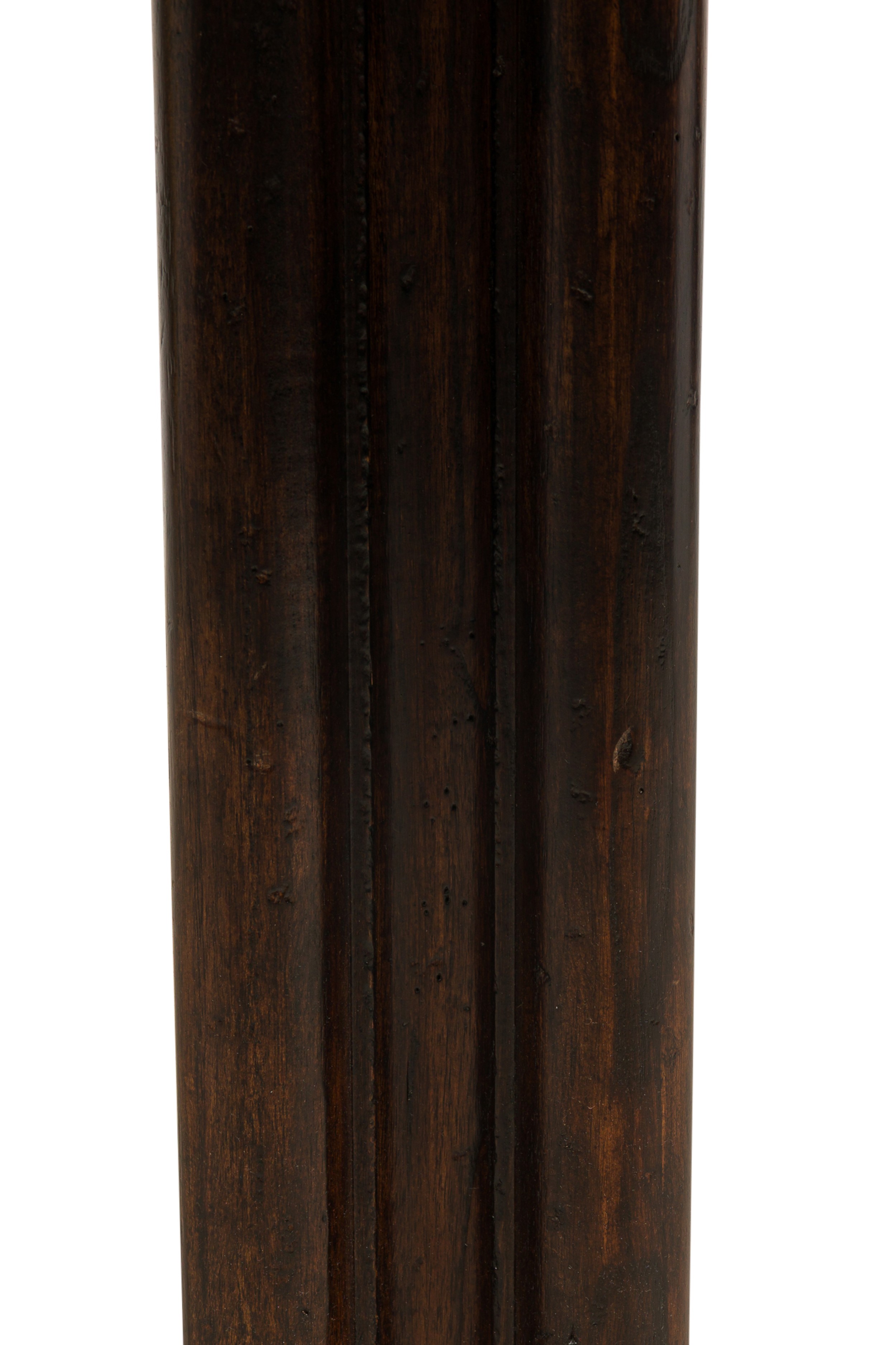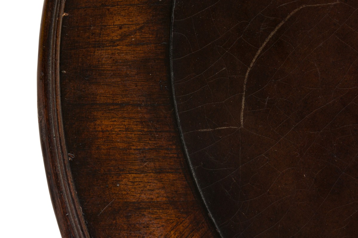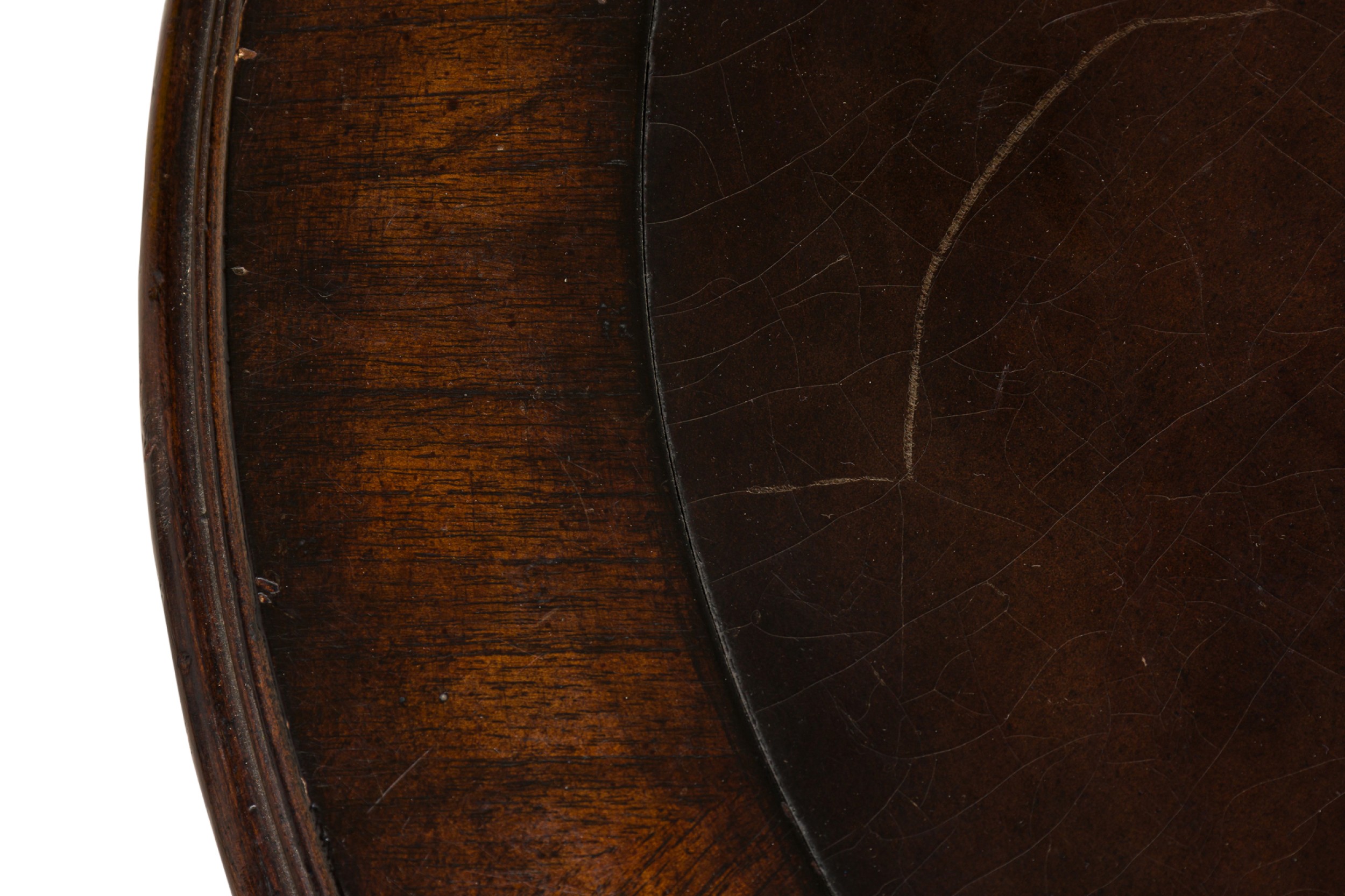 English Regency style round center / end table in a dark brown wood top with leather inlay supported by fluted pedestal base atop 4 scroll feet