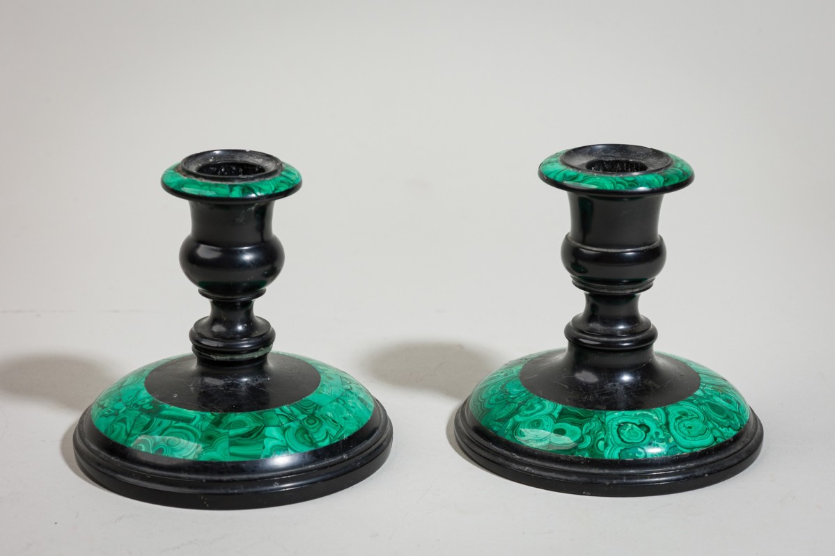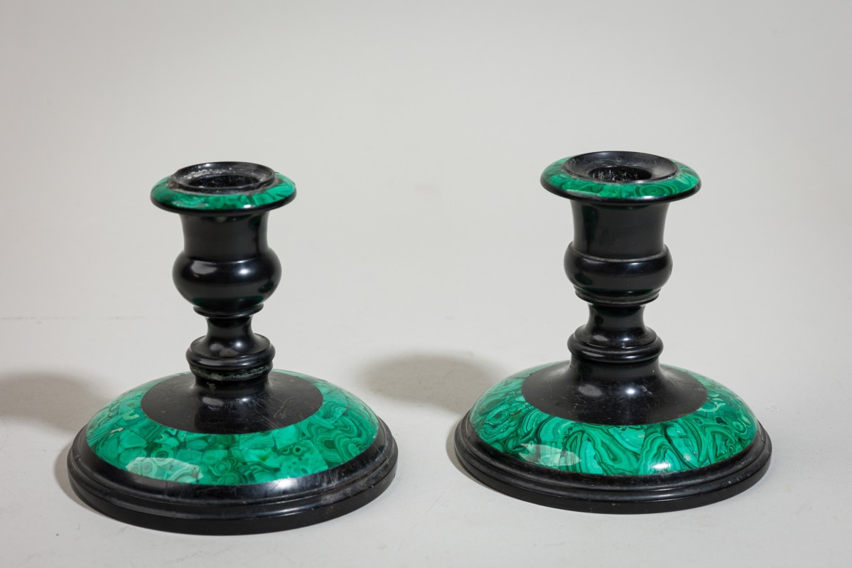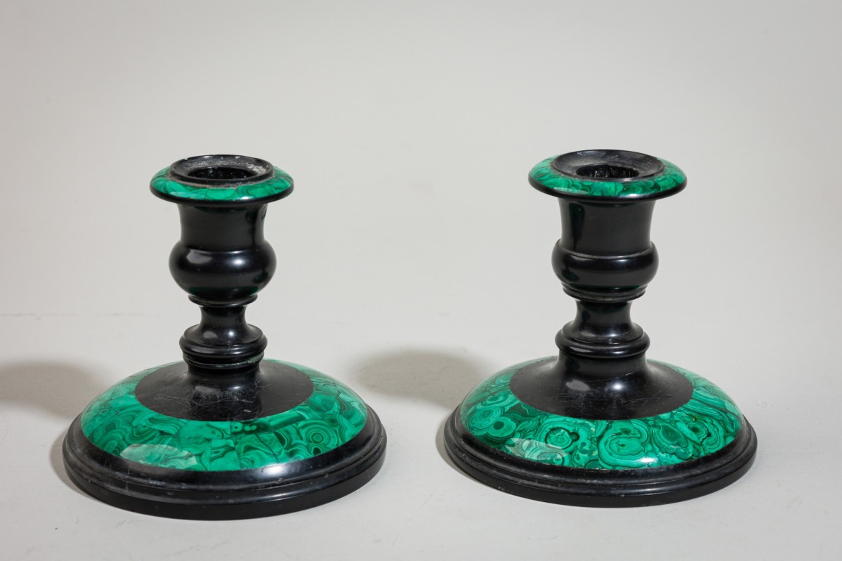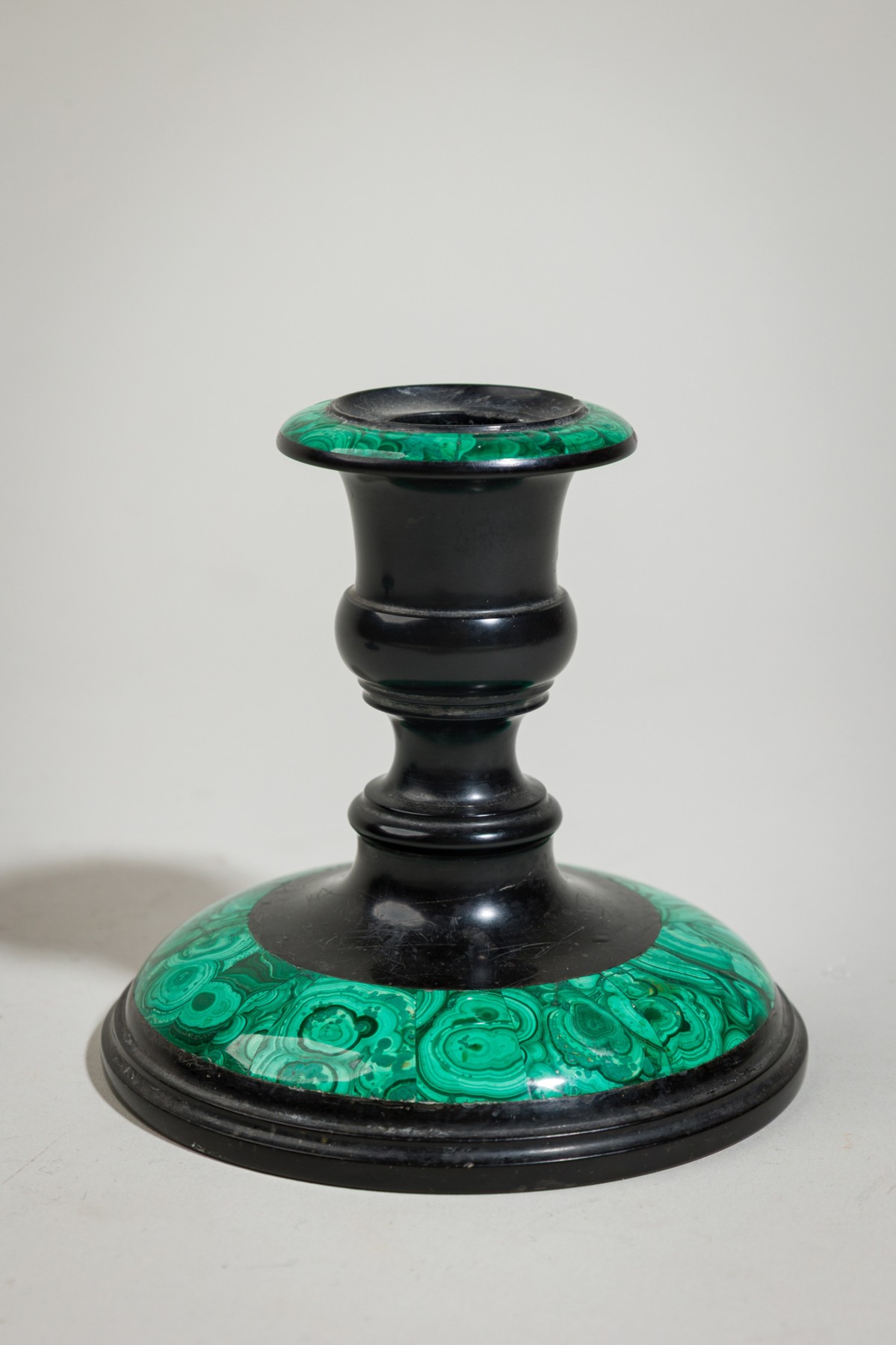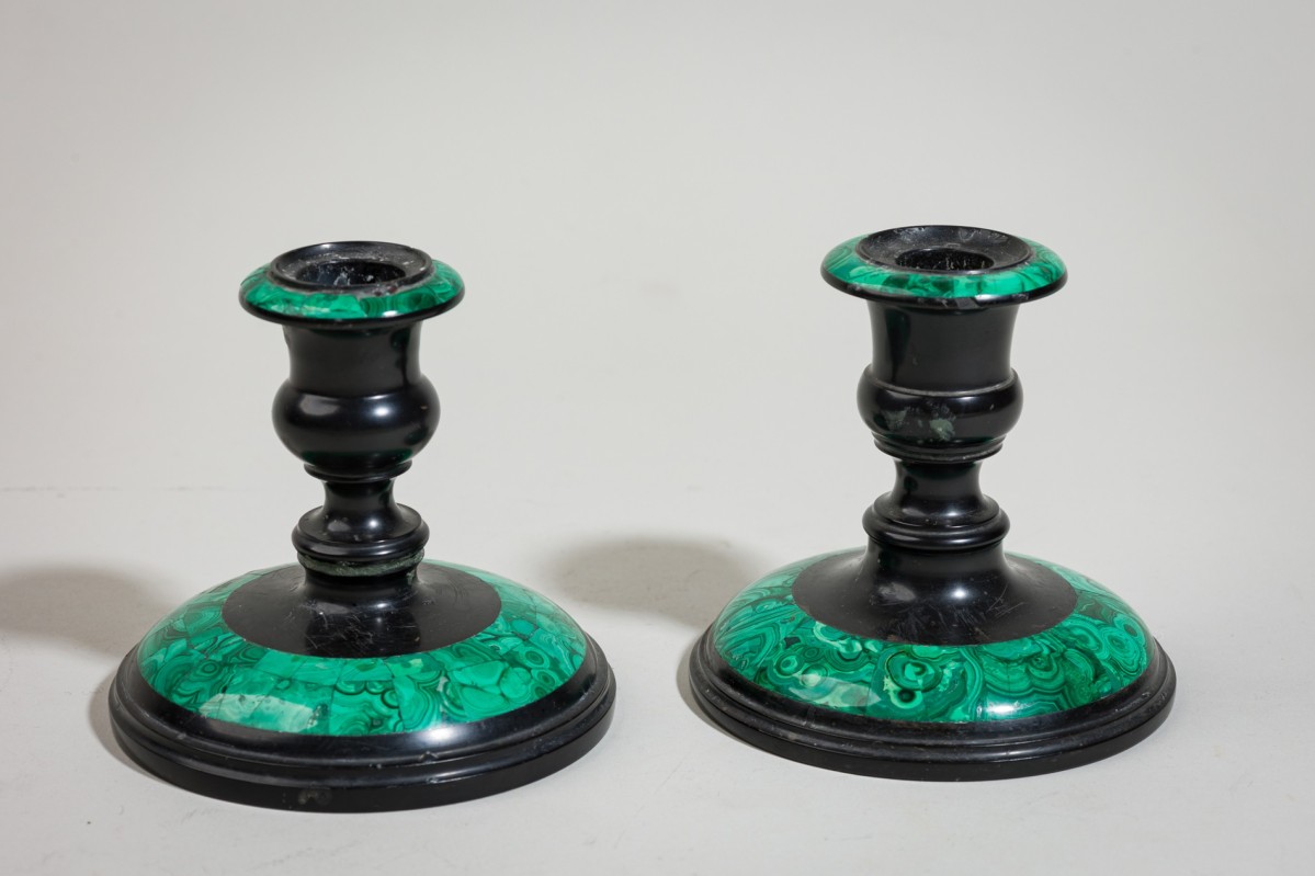 PAIR of Russian (19/20th Century) round black marble candlesticks with malachite inlay trim. (PRICED AS PAIR)