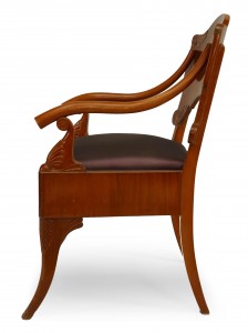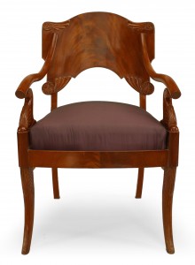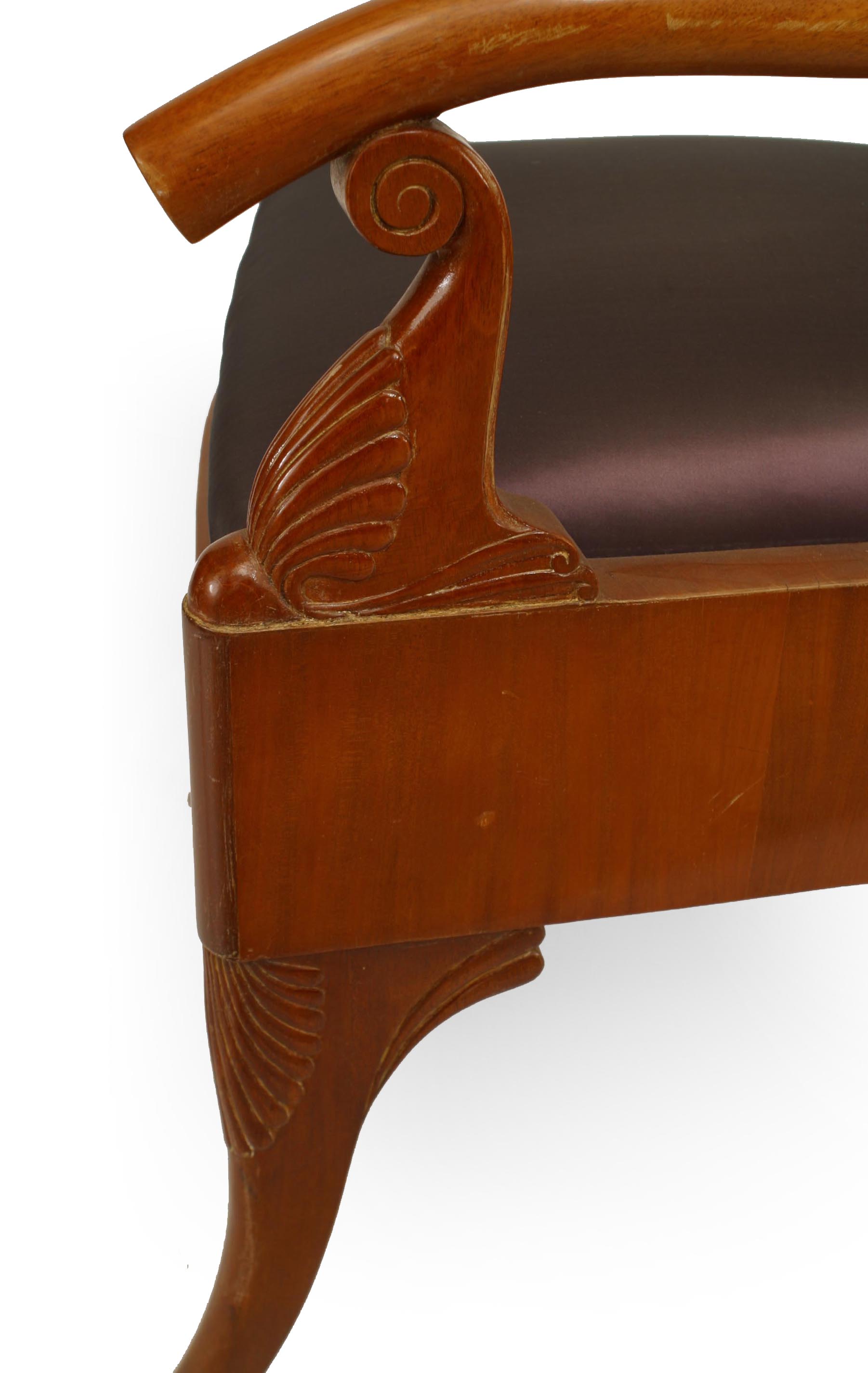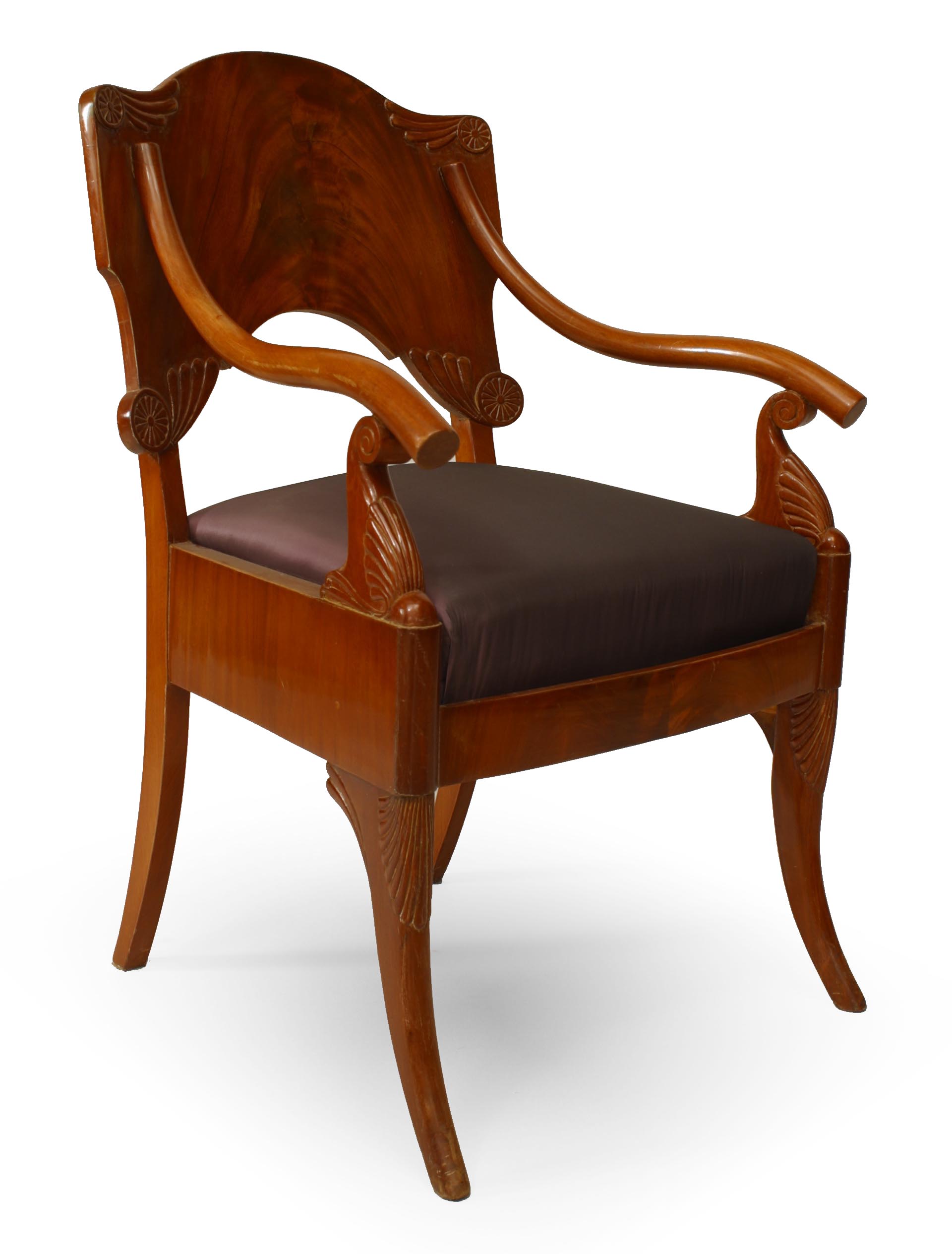 2 Russian (1st ½ 19th Cent) mahogany arm chairs with upholstered seat & carved foliate & rosettes on corner of back with sabre form front legs (PRICED EACH) (Matching 6 SIDE CHAIRS: REG0922)