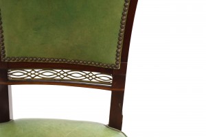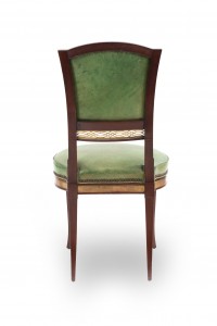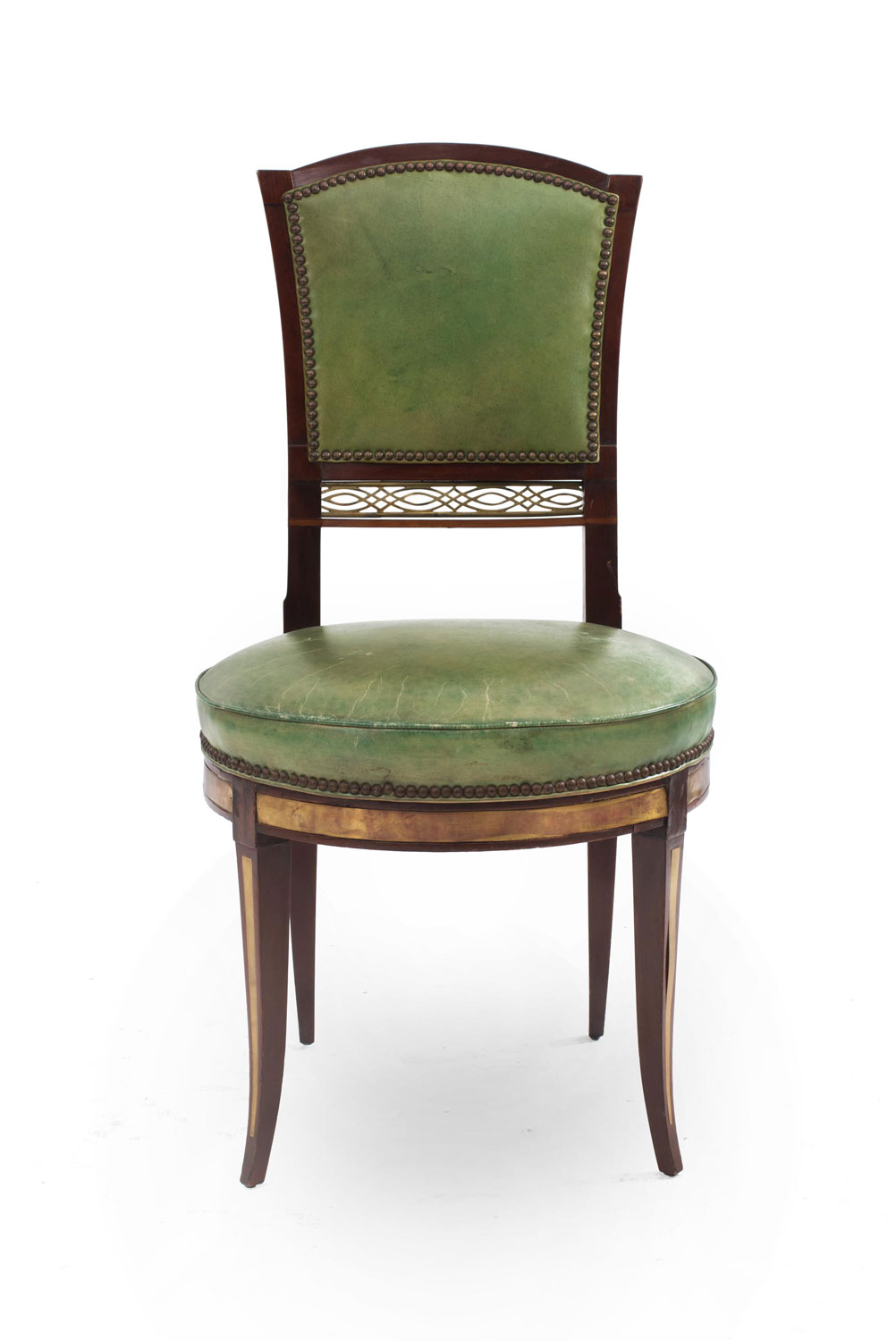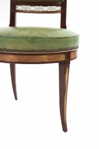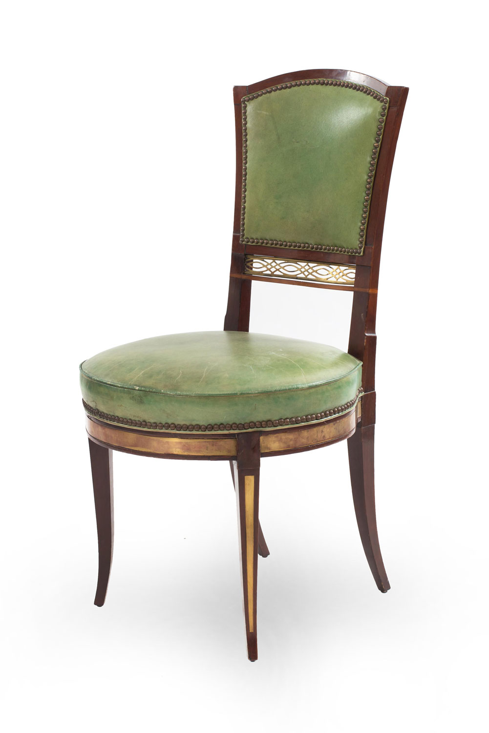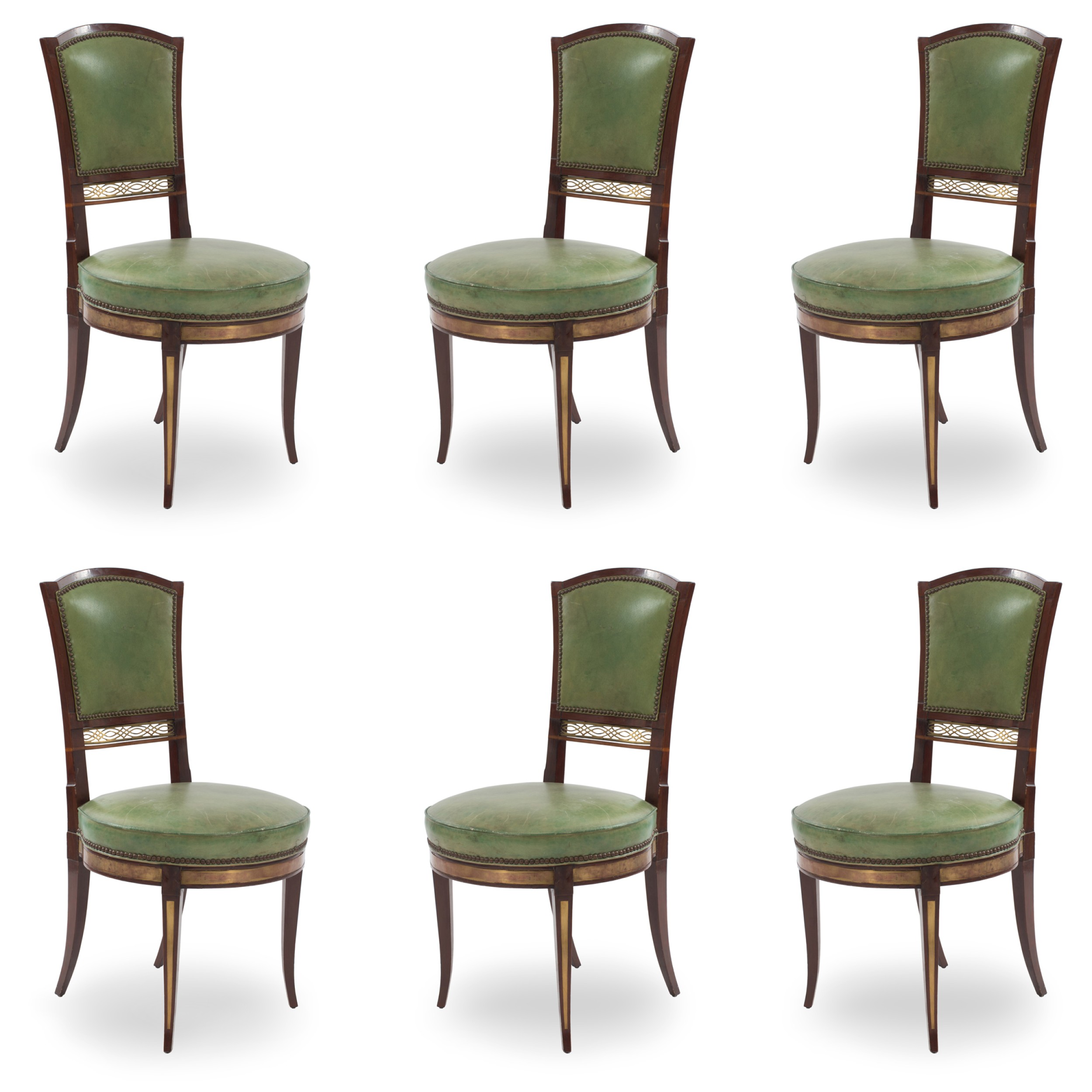 8 Russian Neo-classic mahogany & brass mounted side chairs with green leather upholstered seats & backs and brass filigree panel and fruitwood inlaid trim (early 19th Cent) (PRICED EACH)