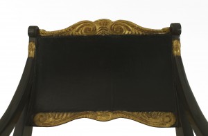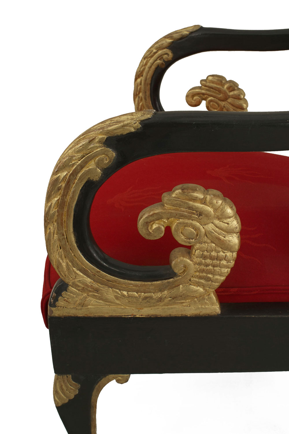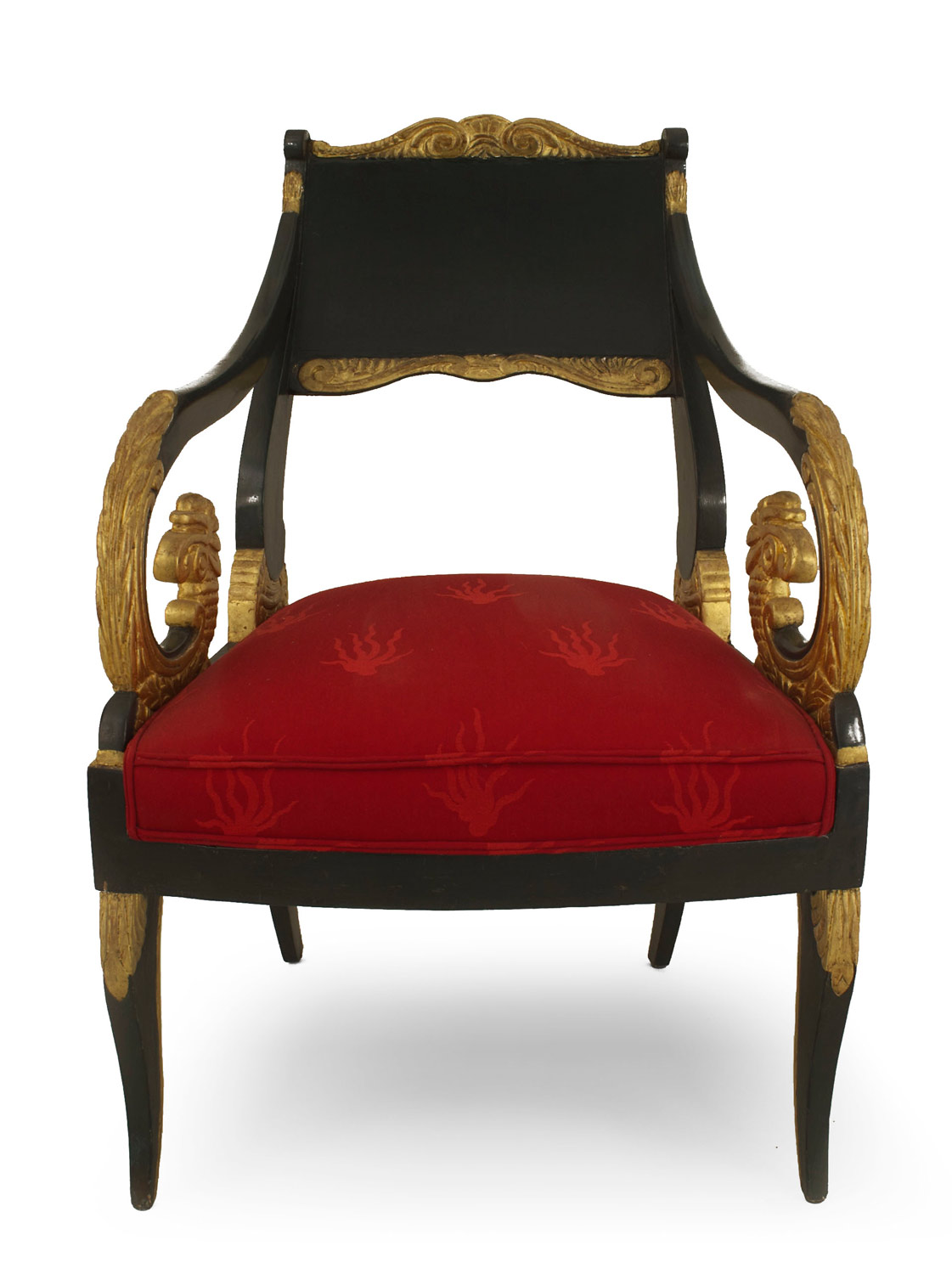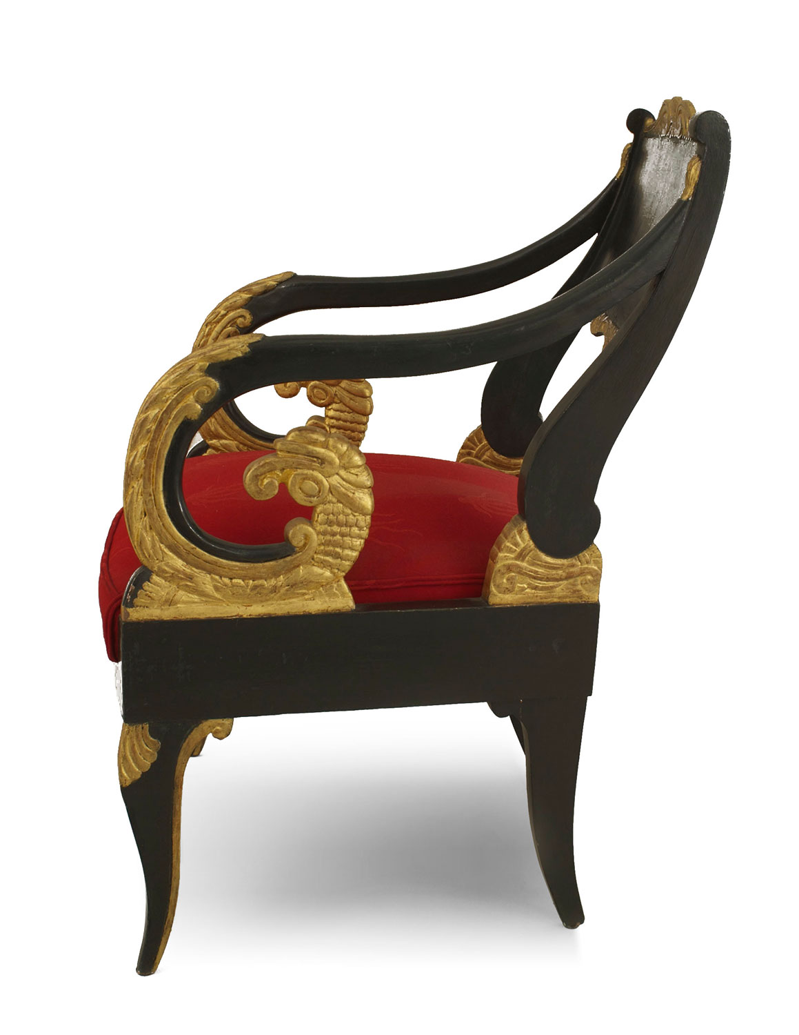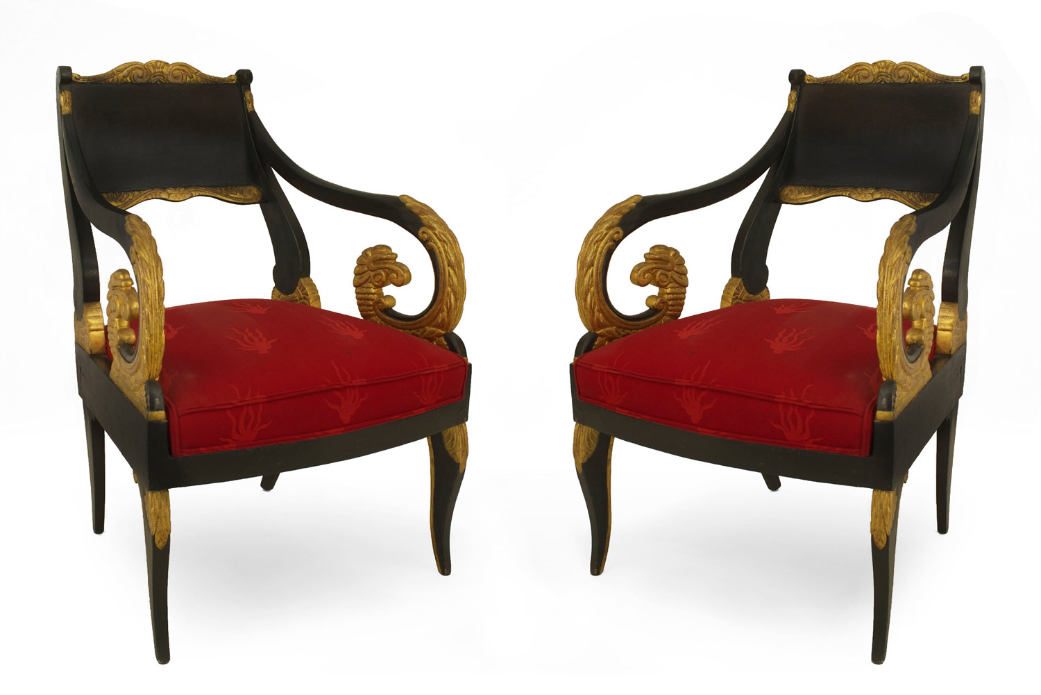 2 Russian Neoclassic (early 19th Century) parcel gilt and dark green painted armchairs with scrolled arms and red damask silk upholstered seats. (PRICED EACH) (Similar to: 018681A)