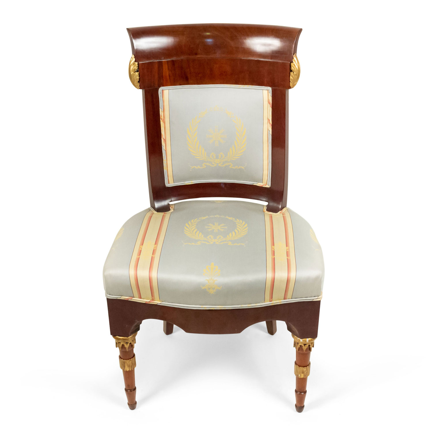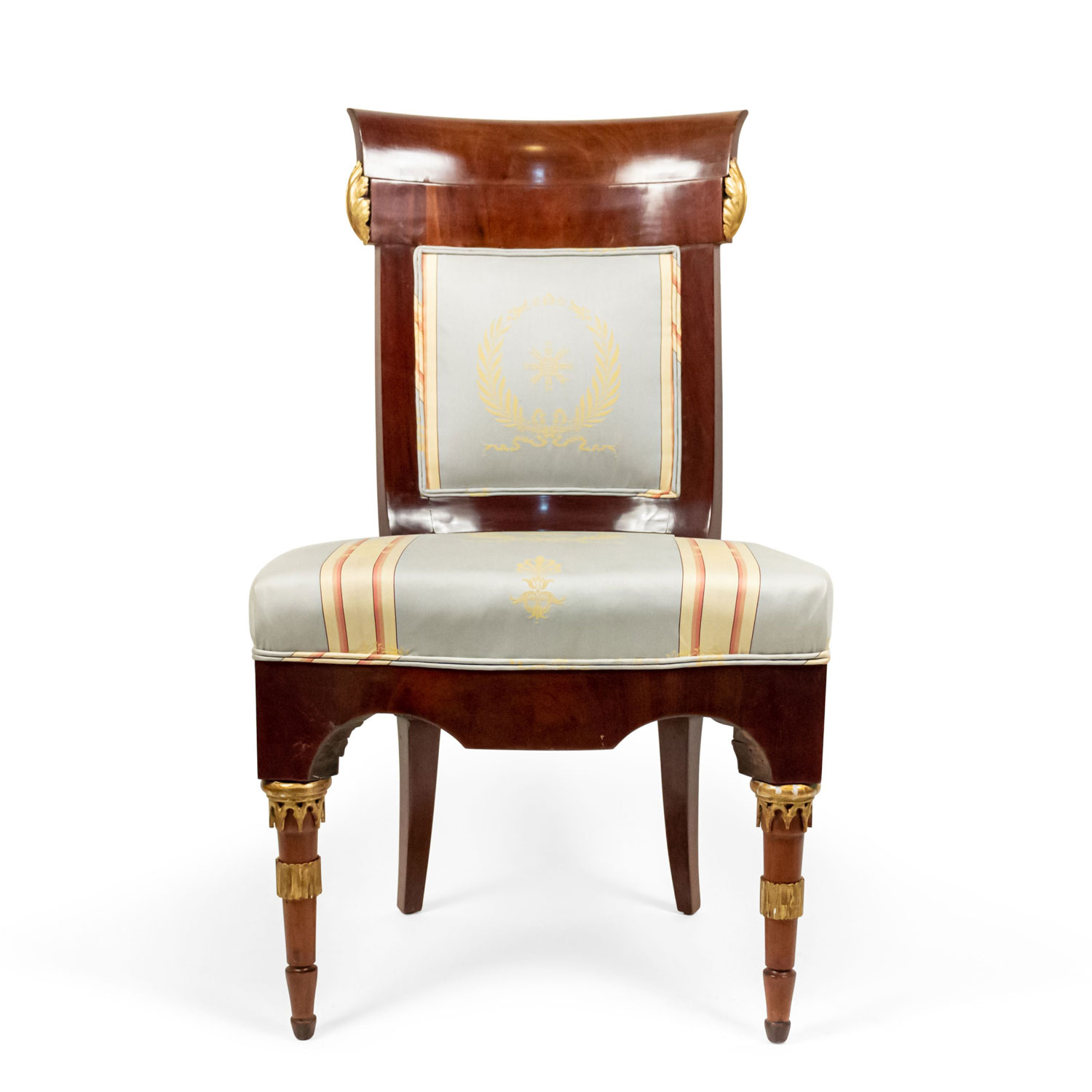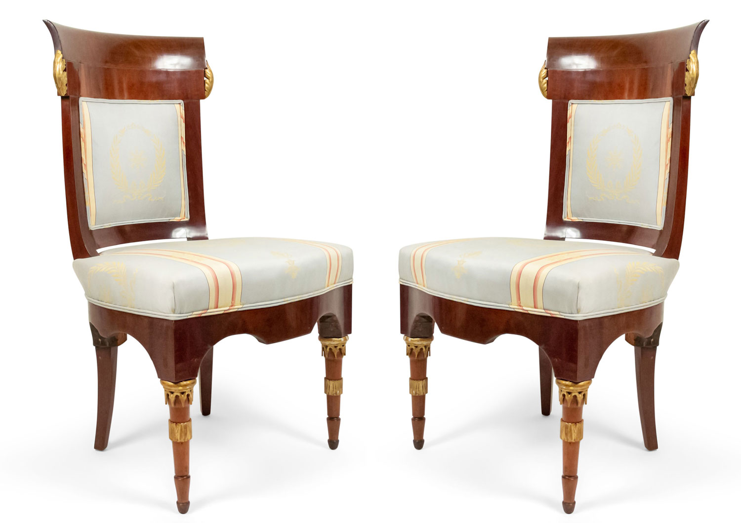 2 Russian Neoclassic parcel gilt mahogany side chairs with light blue and cream striped upholstery (19th Cent). (2 - PRICED EACH) (See also: matching sofa: 035770A, 6 matching armchairs: 035770B)