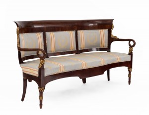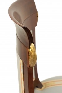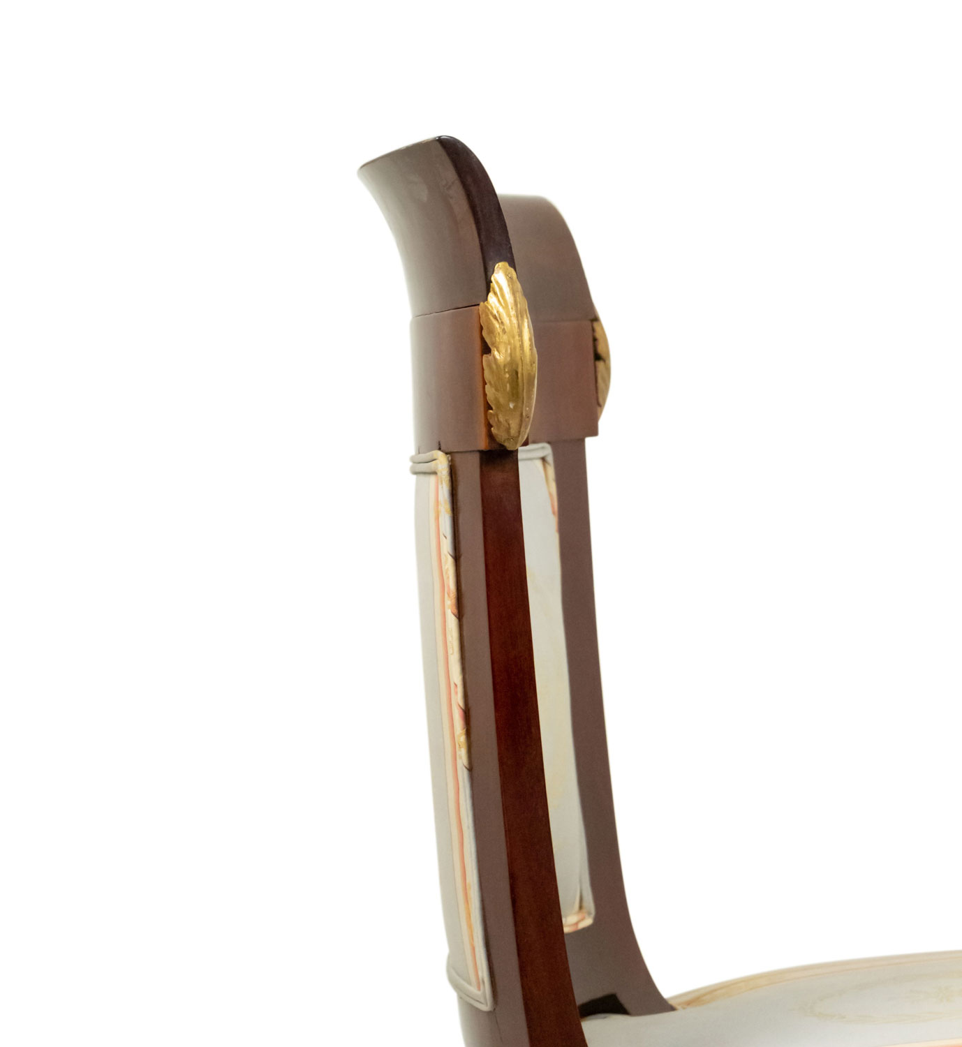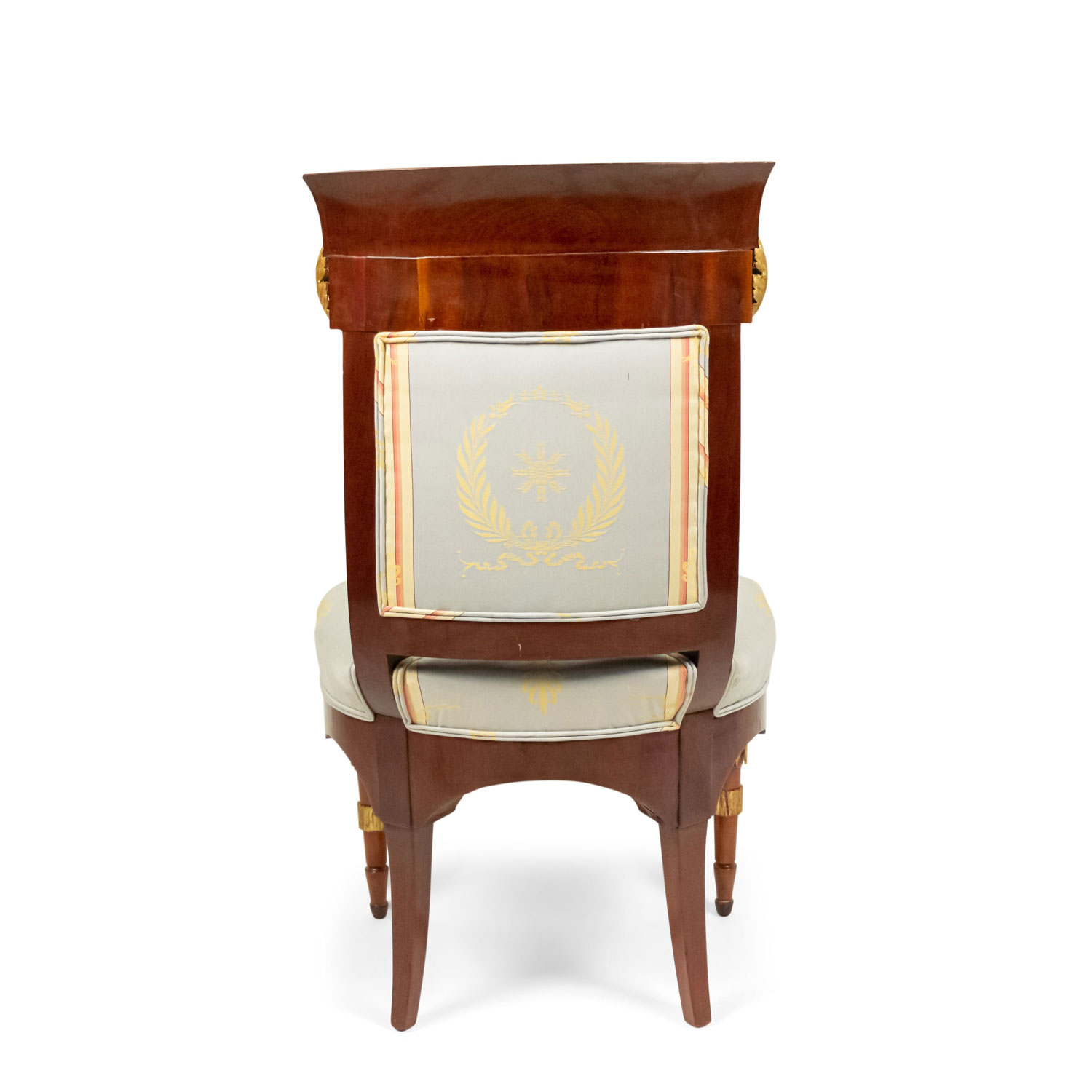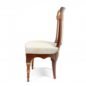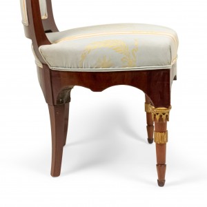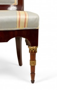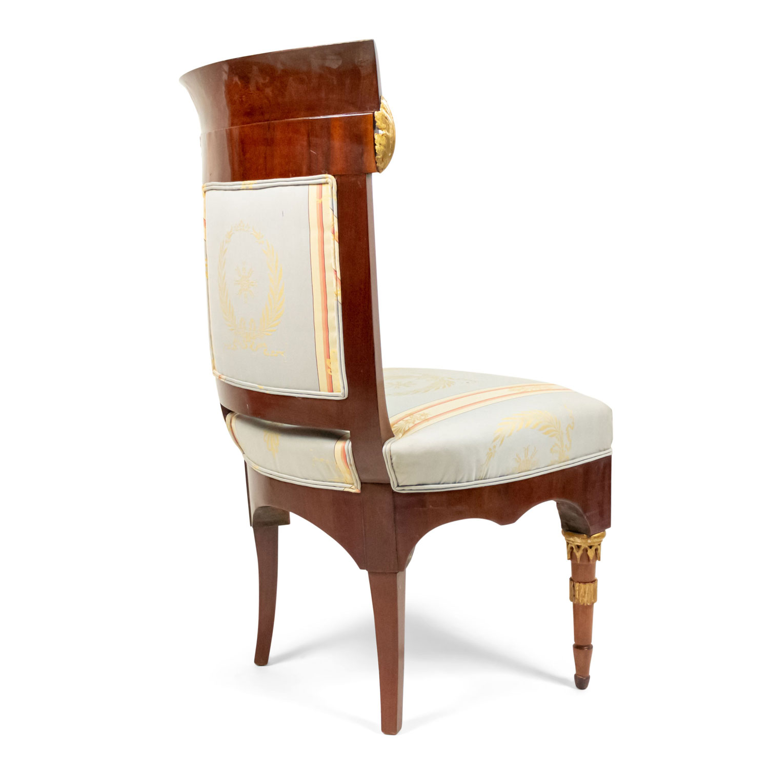 2 Russian Neoclassic parcel gilt mahogany side chairs with light blue and cream striped upholstery (19th Cent). (2 - PRICED EACH) (See also: matching sofa: 035770A, 6 matching armchairs: 035770B)