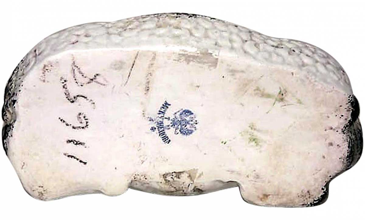 3 Russian (Late 19th/20th Century) covered glazed porcelain boxes in the form of reclining black and white ram (Kusnetzoff Factory)(PRICED EACH)