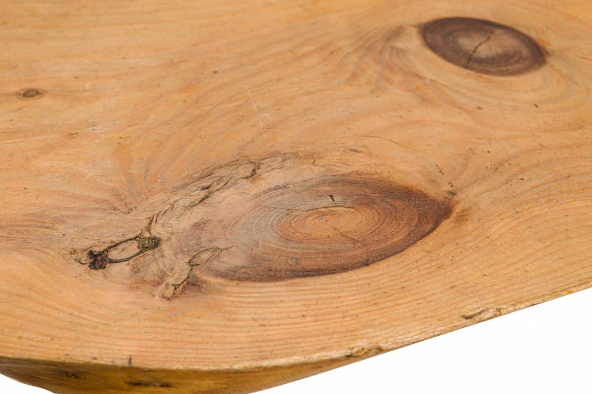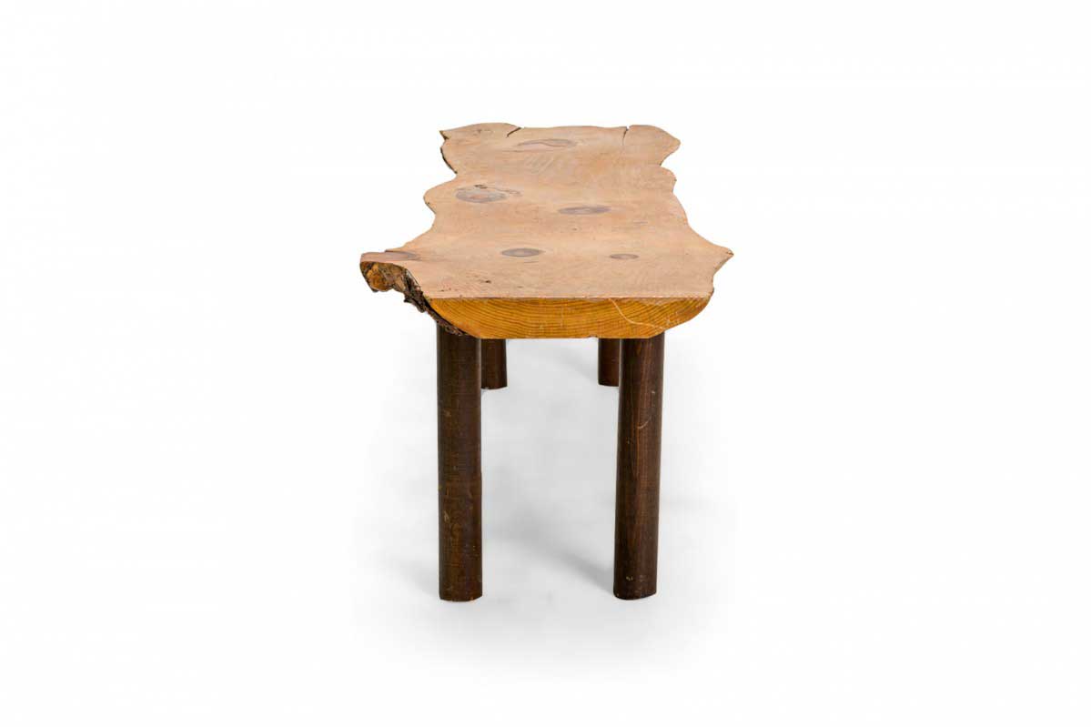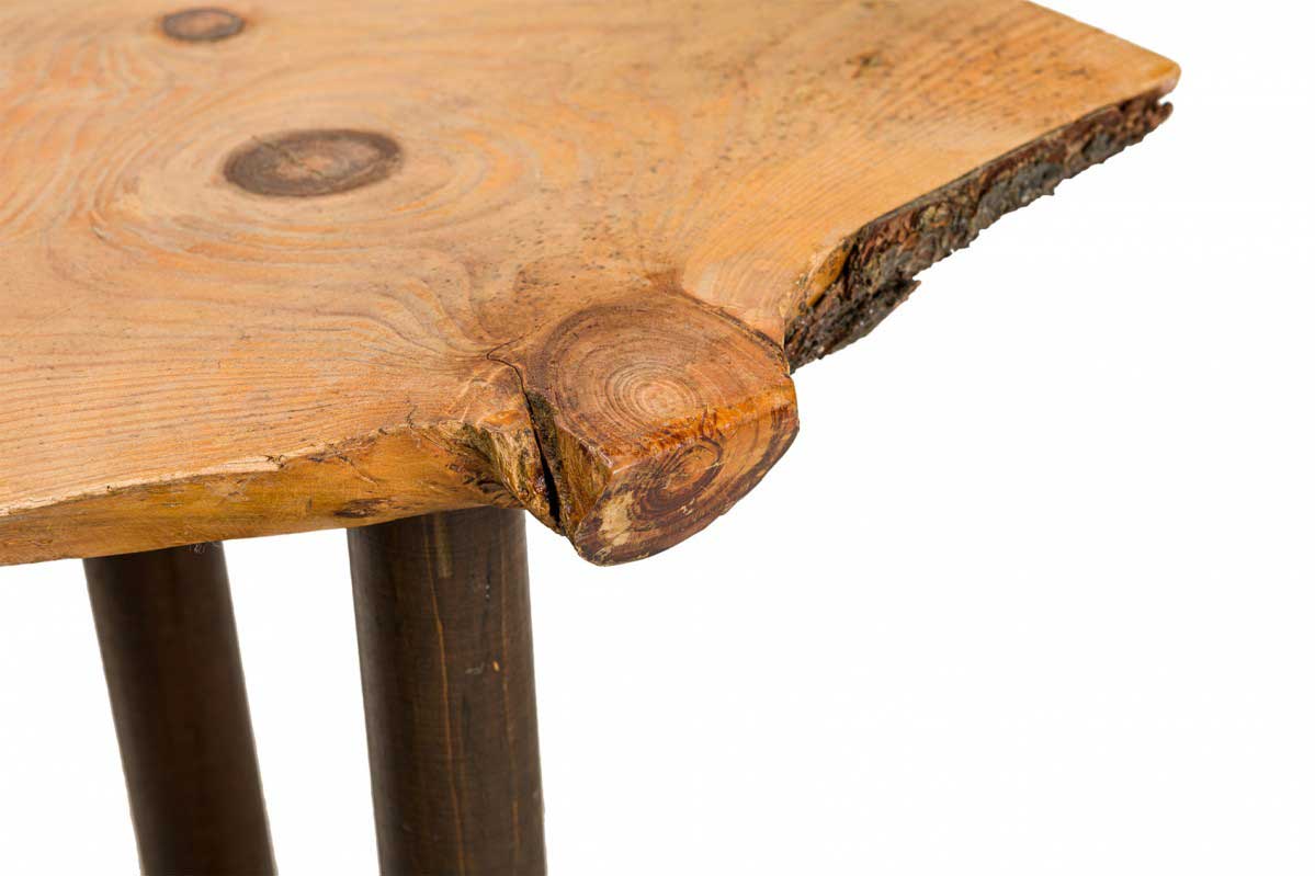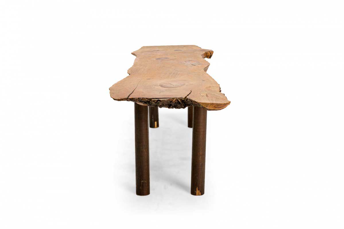 American Country Rustic Adirondack style (20th Century) rectangular free form knotty pine bench with bark trim resting on 4 cylindrical black legs