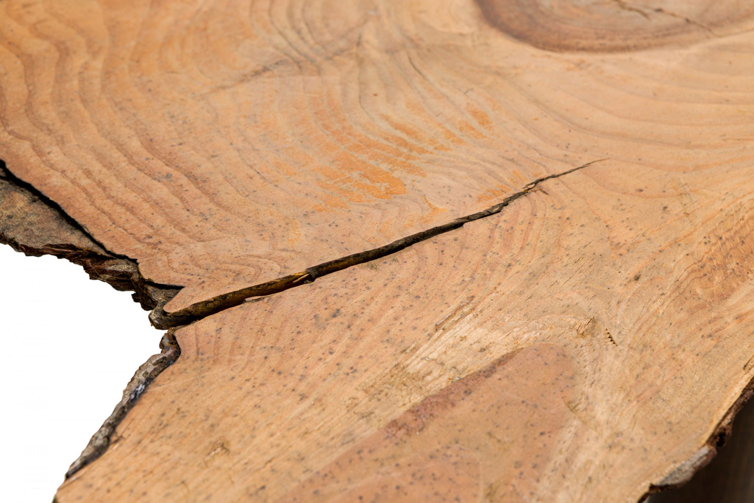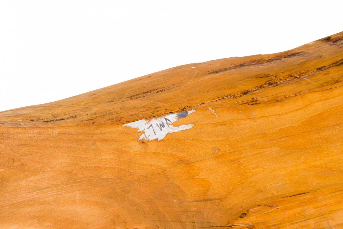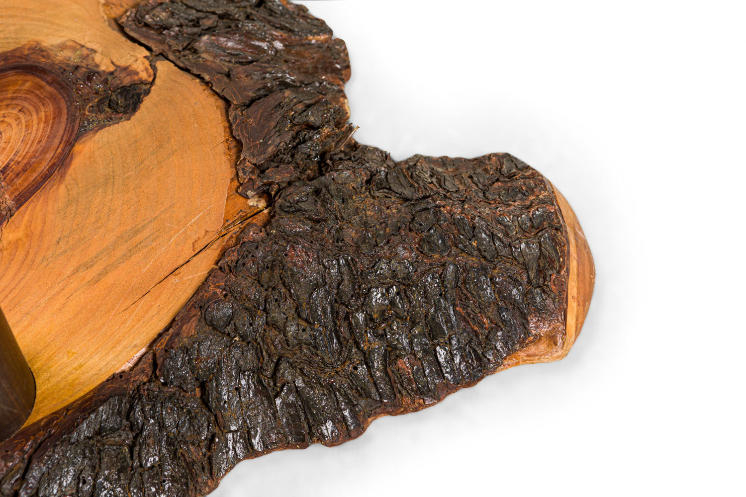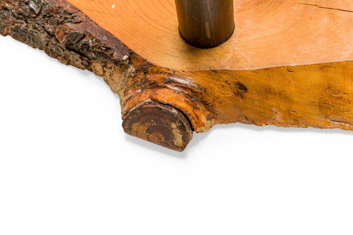 American Country Rustic Adirondack style (20th Century) rectangular free form knotty pine bench with bark trim resting on 4 cylindrical black legs