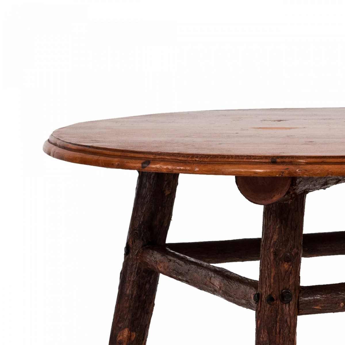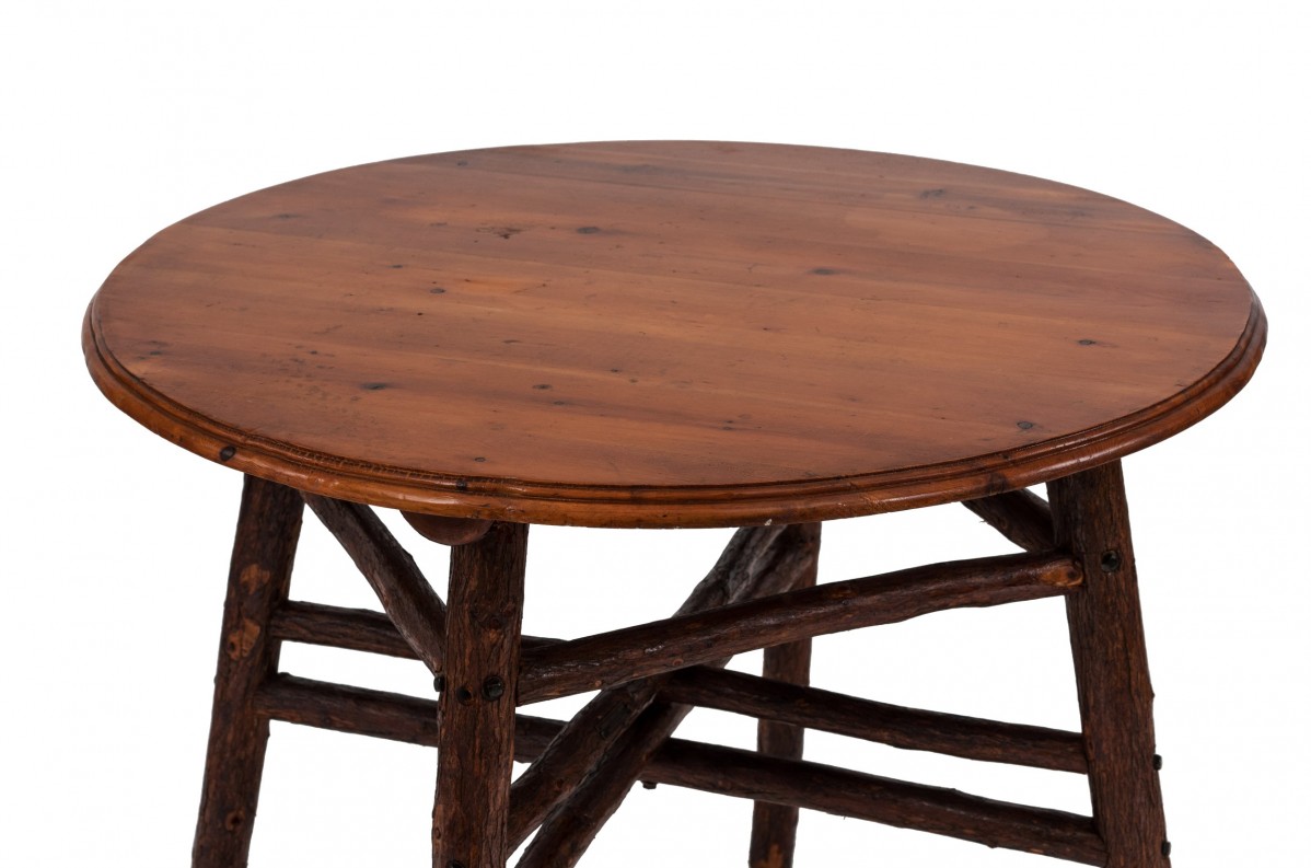 Rustic American Old Hickory-style (2nd Quarter 20th Century) side / end / cafe table with a round pine top and having a double box stretcher