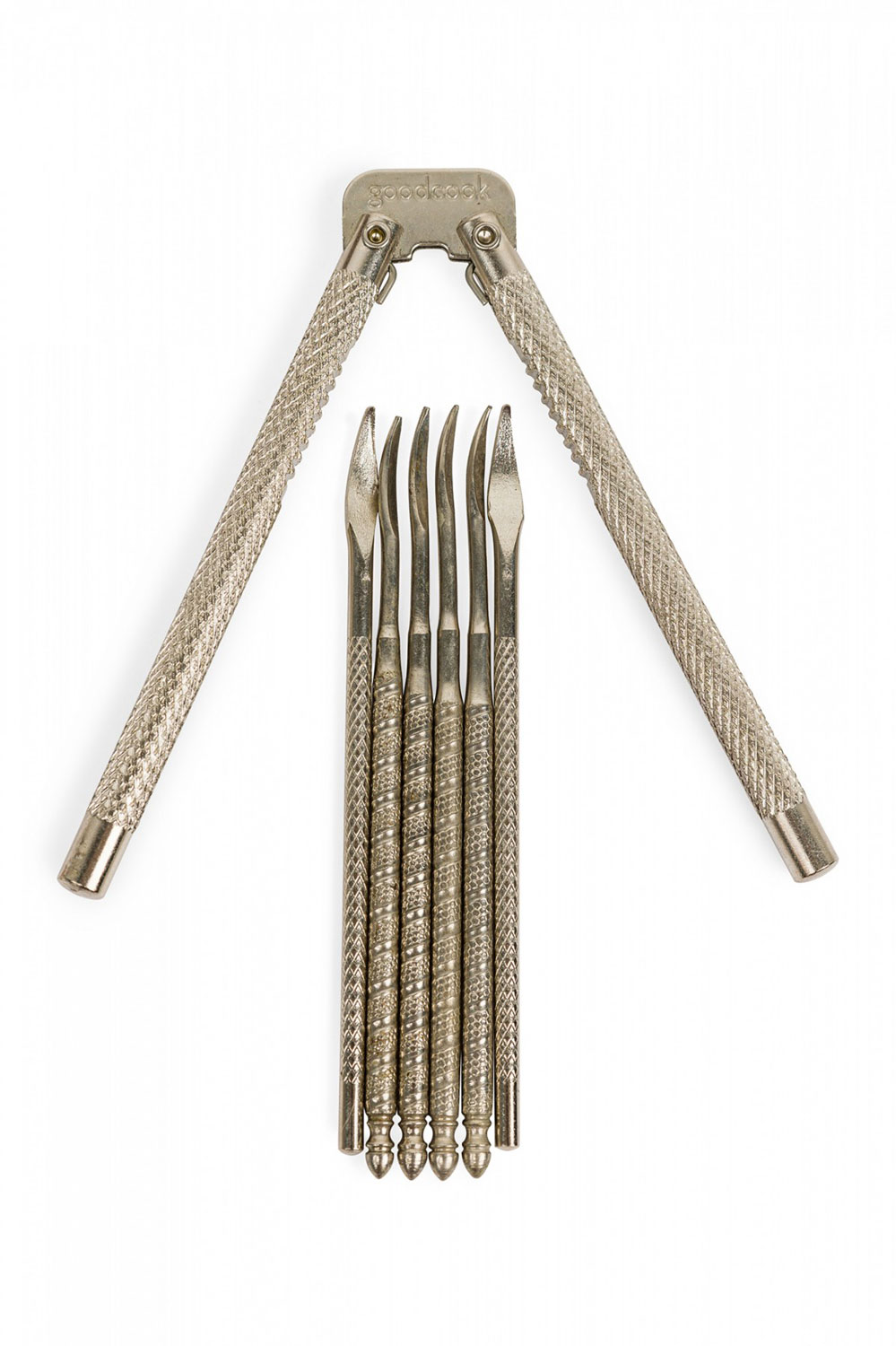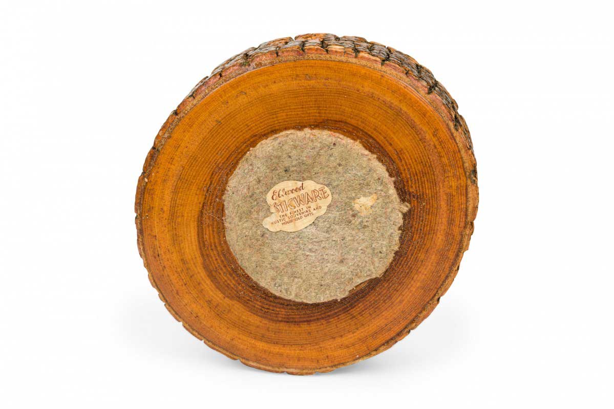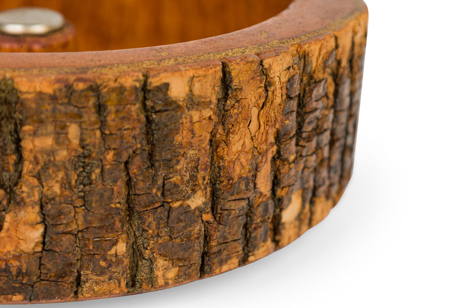 Rustic carved wooden nut cracker bowl with a bark exterior, wooden mallet, and various metal nut picks.