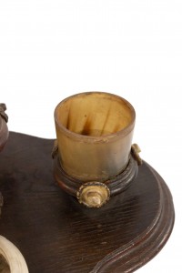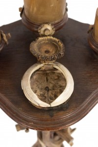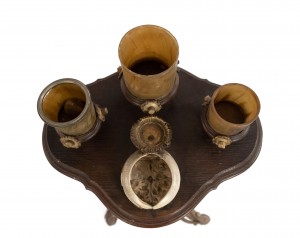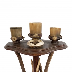 Rustic Continental (possibly German, 19th Cent) oak and antler design pedestal base smoking stand with 3 round horn containers on top