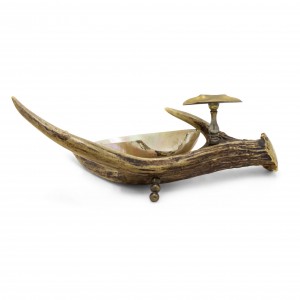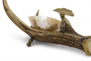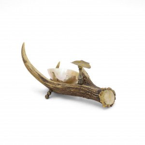 Rustic Continental style pearl ashtray cradled in animal horn base with brass cigarette stand (as is-break in pearl)