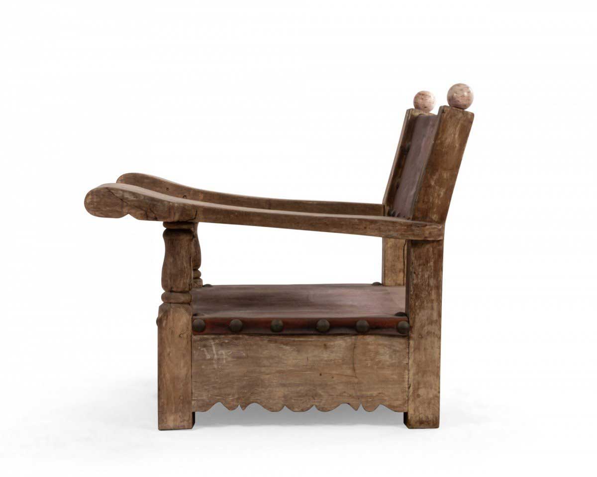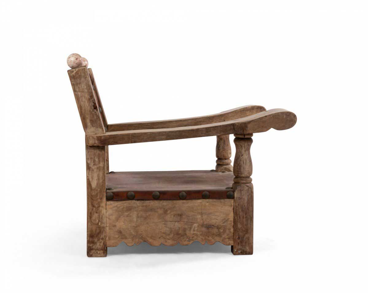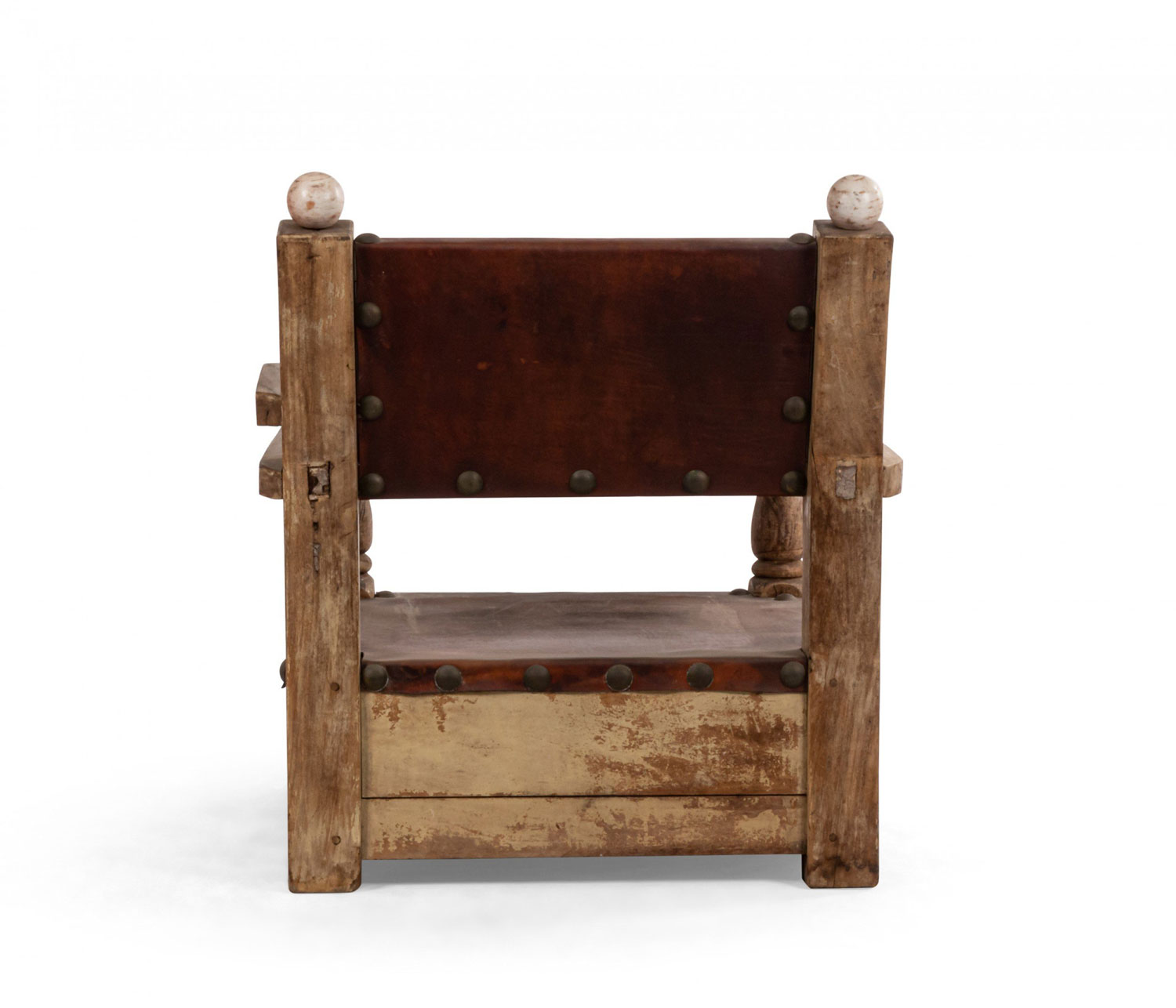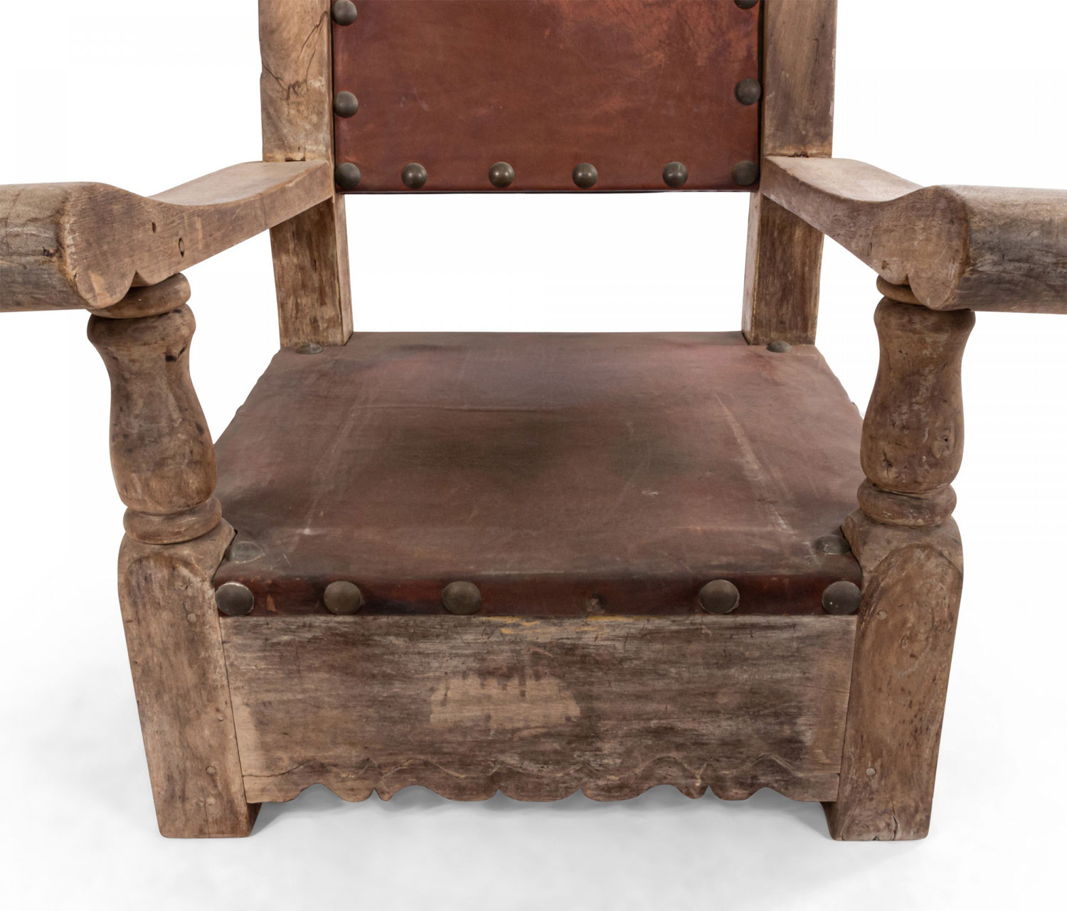 2 Rustic (probably Mexican 1920s) Country style weathered oak and pine over scale arm chairs with brown leather seat and back with large nail head trim (PRICED EACH).