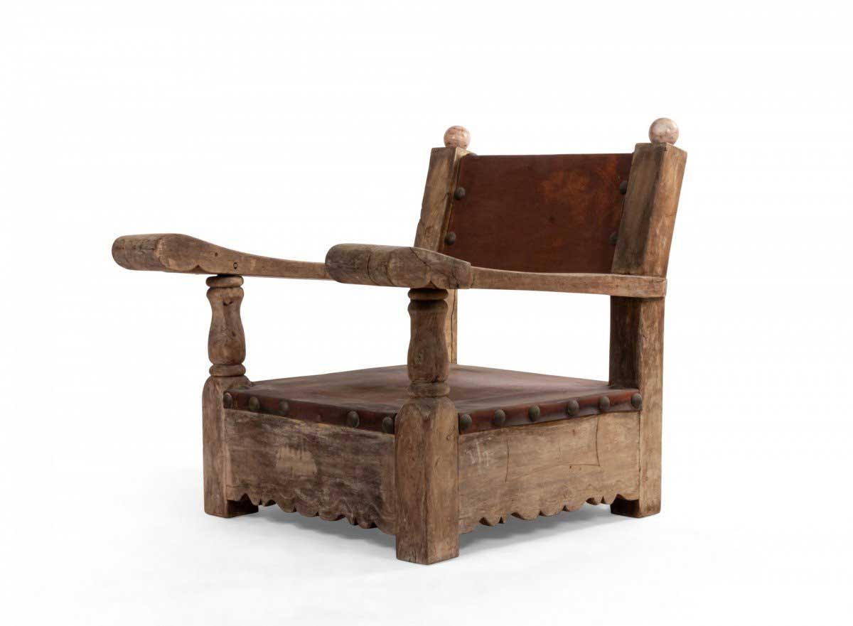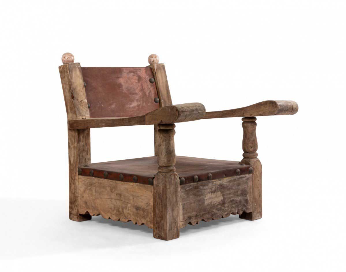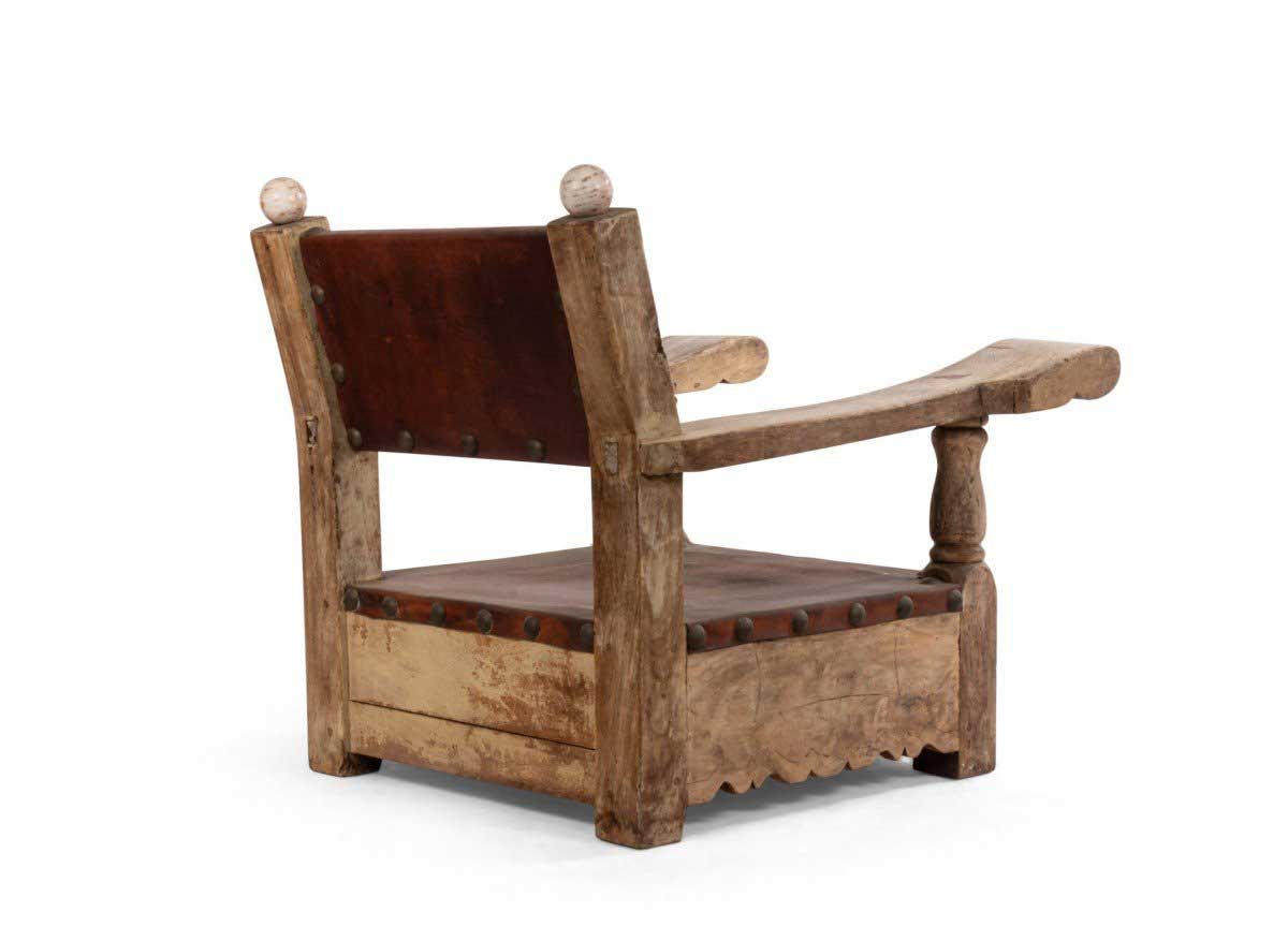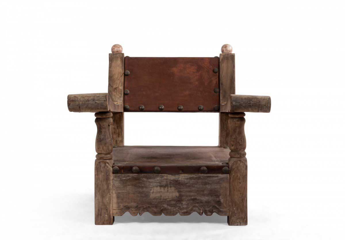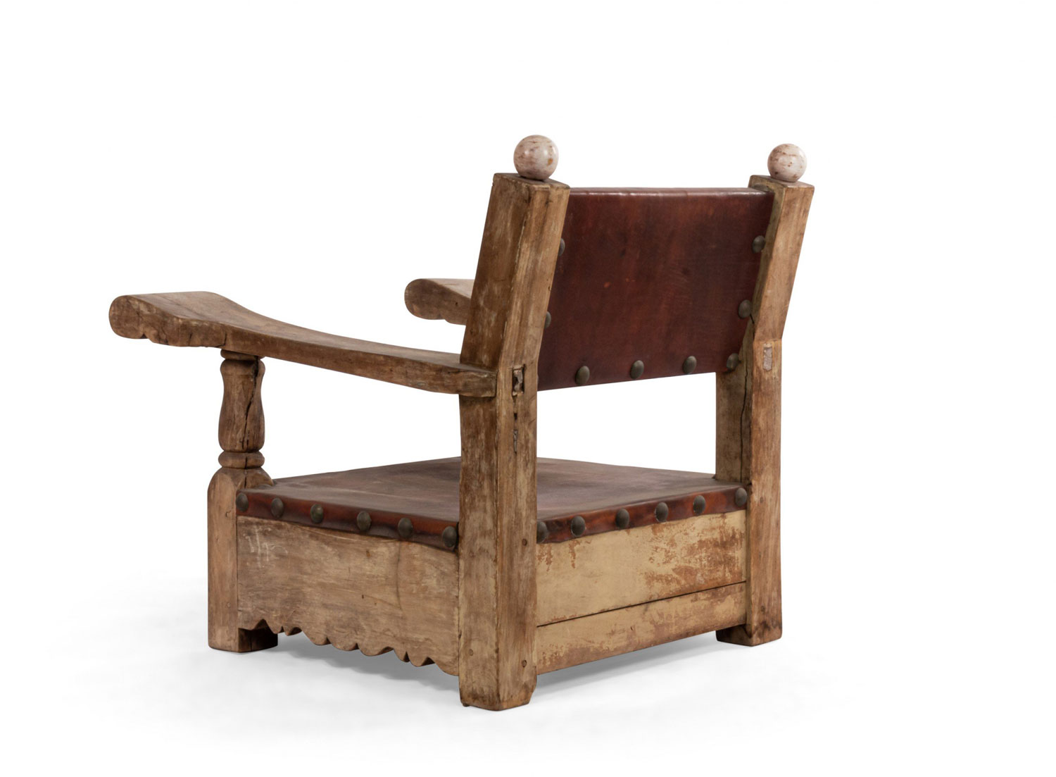 2 Rustic (probably Mexican 1920s) Country style weathered oak and pine over scale arm chairs with brown leather seat and back with large nail head trim (PRICED EACH).