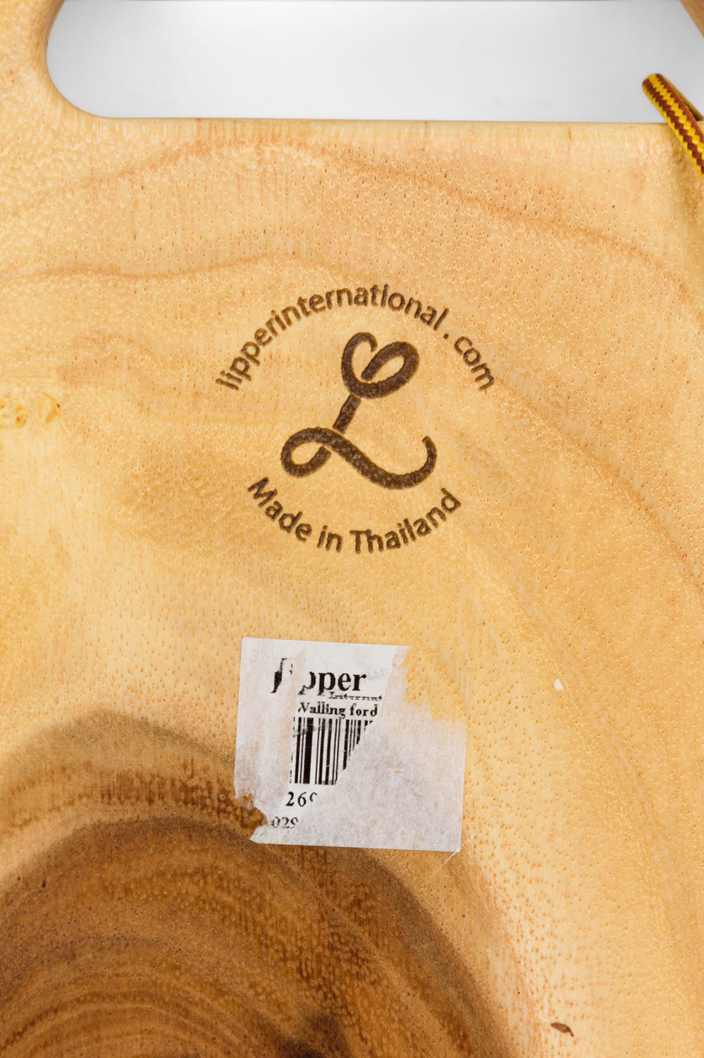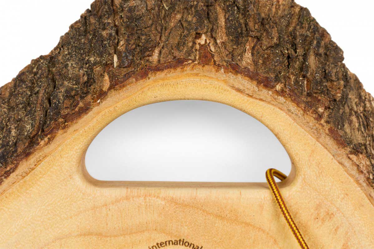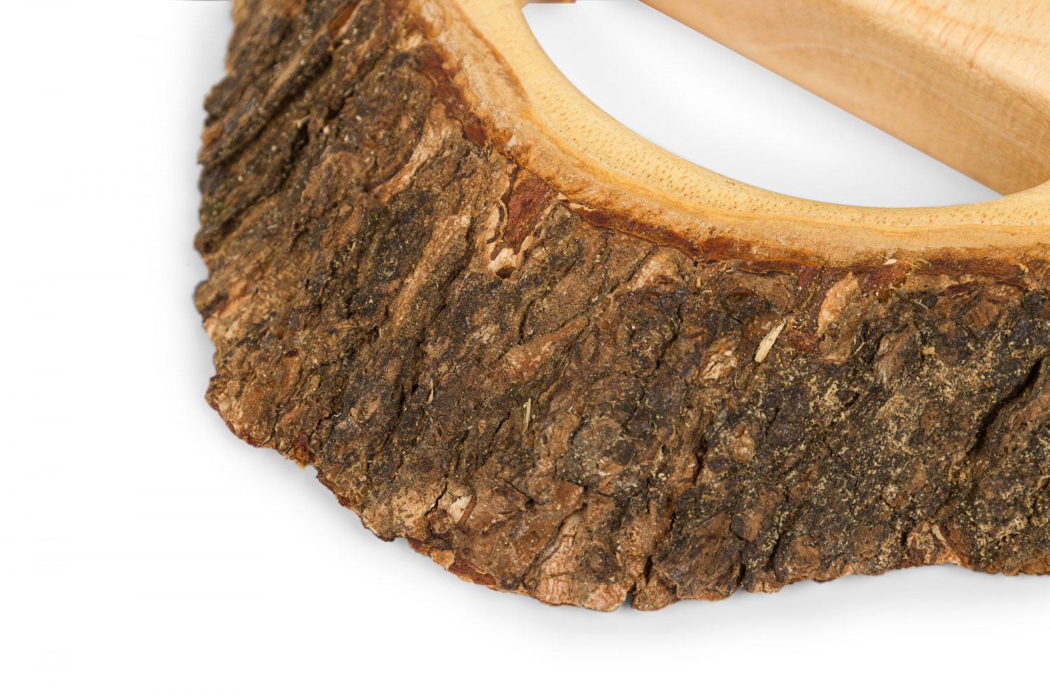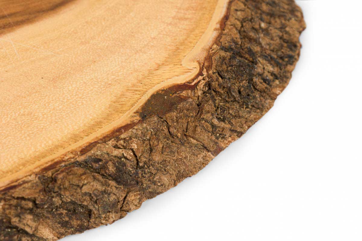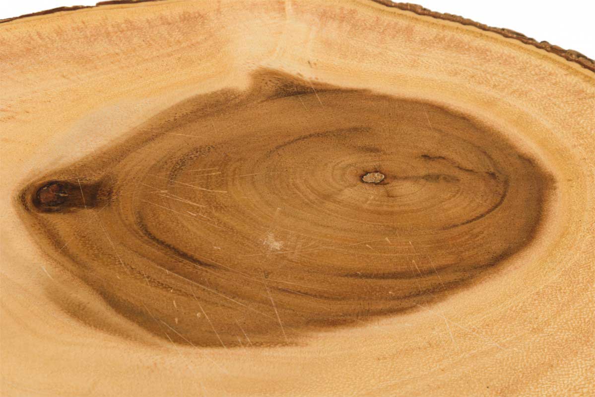 Contemporary Rustic cutting board tray with a dark knot in the center and a bark exterior edge.