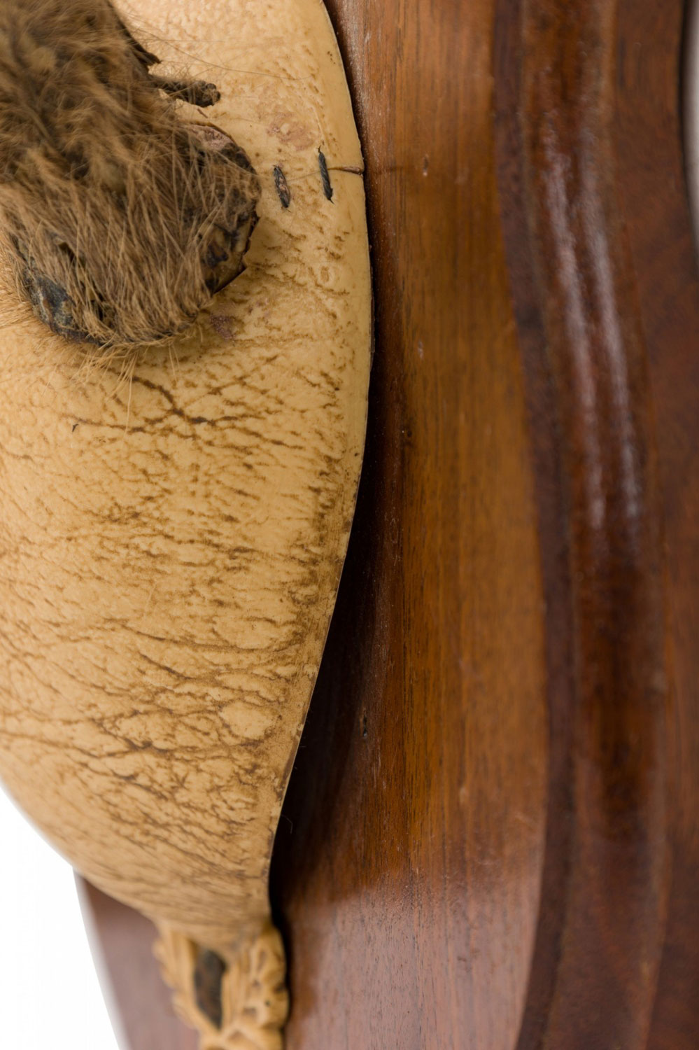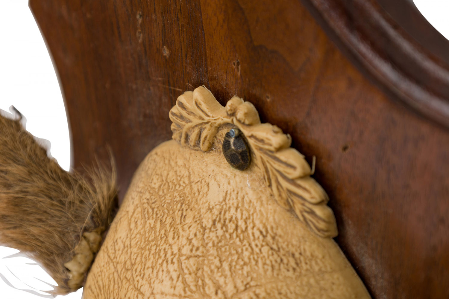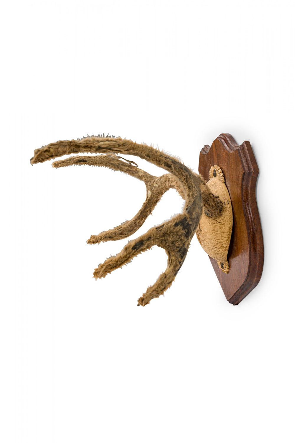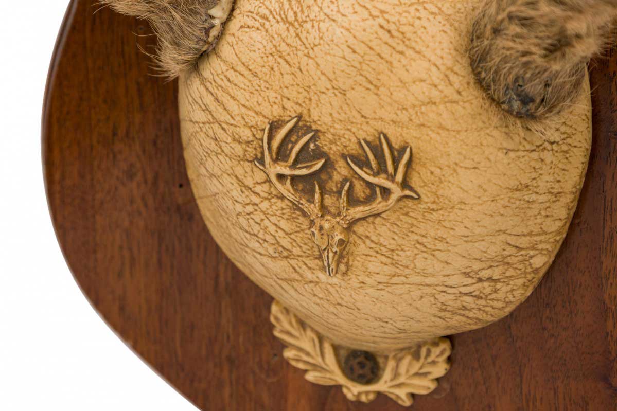 Rustic decorative adolescent deer antlers with velvet, mounted in a hide block stamped with the image of a skull with antlers and mounted on a shield-shaped wooden plaque.