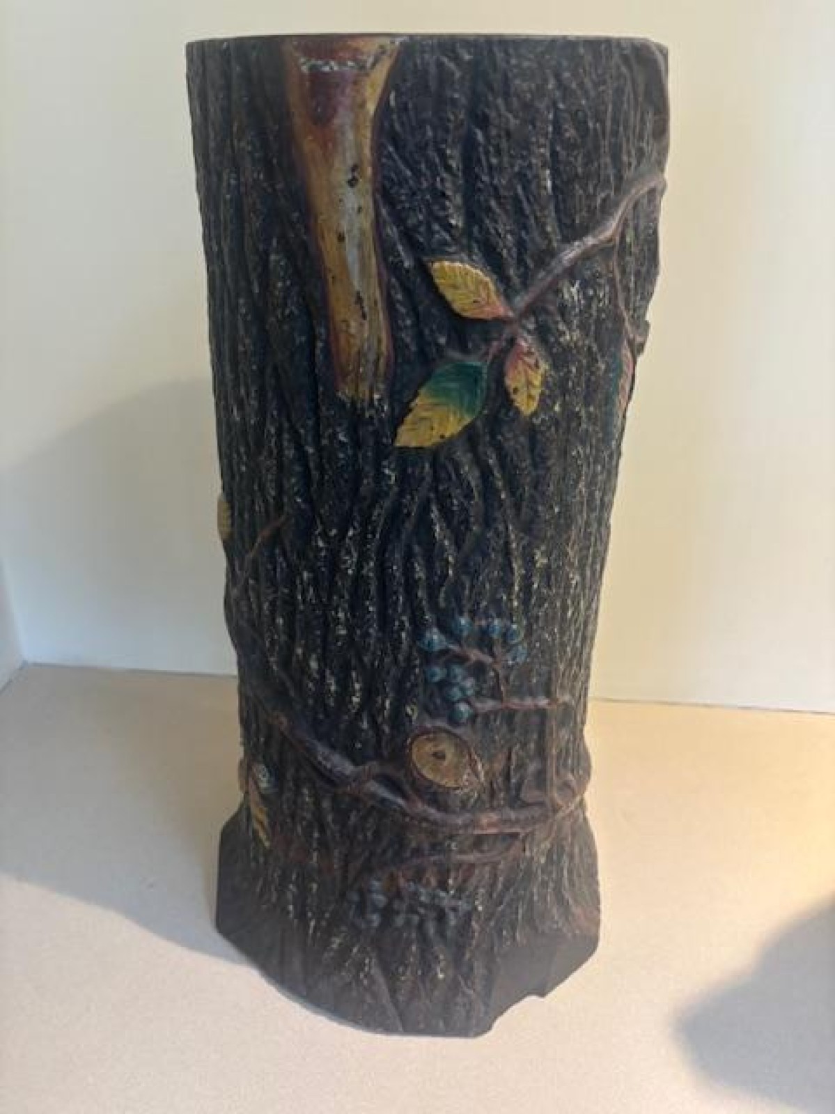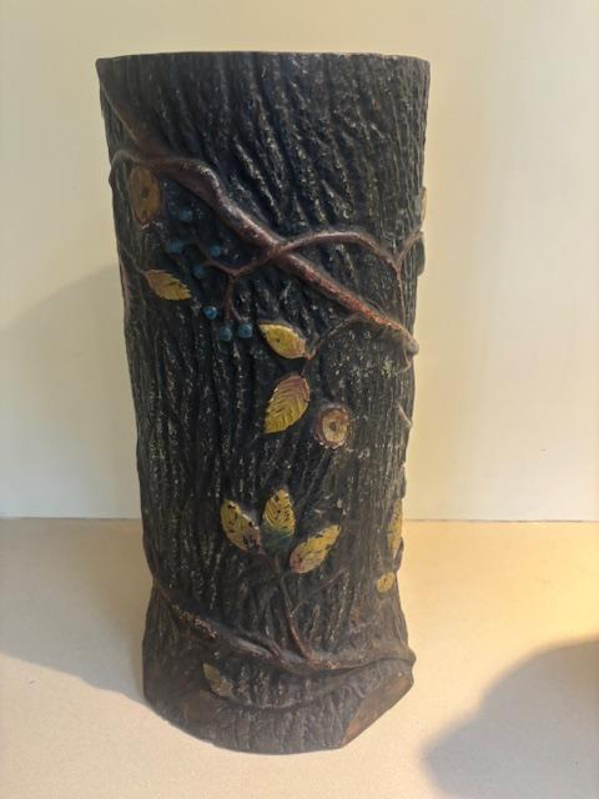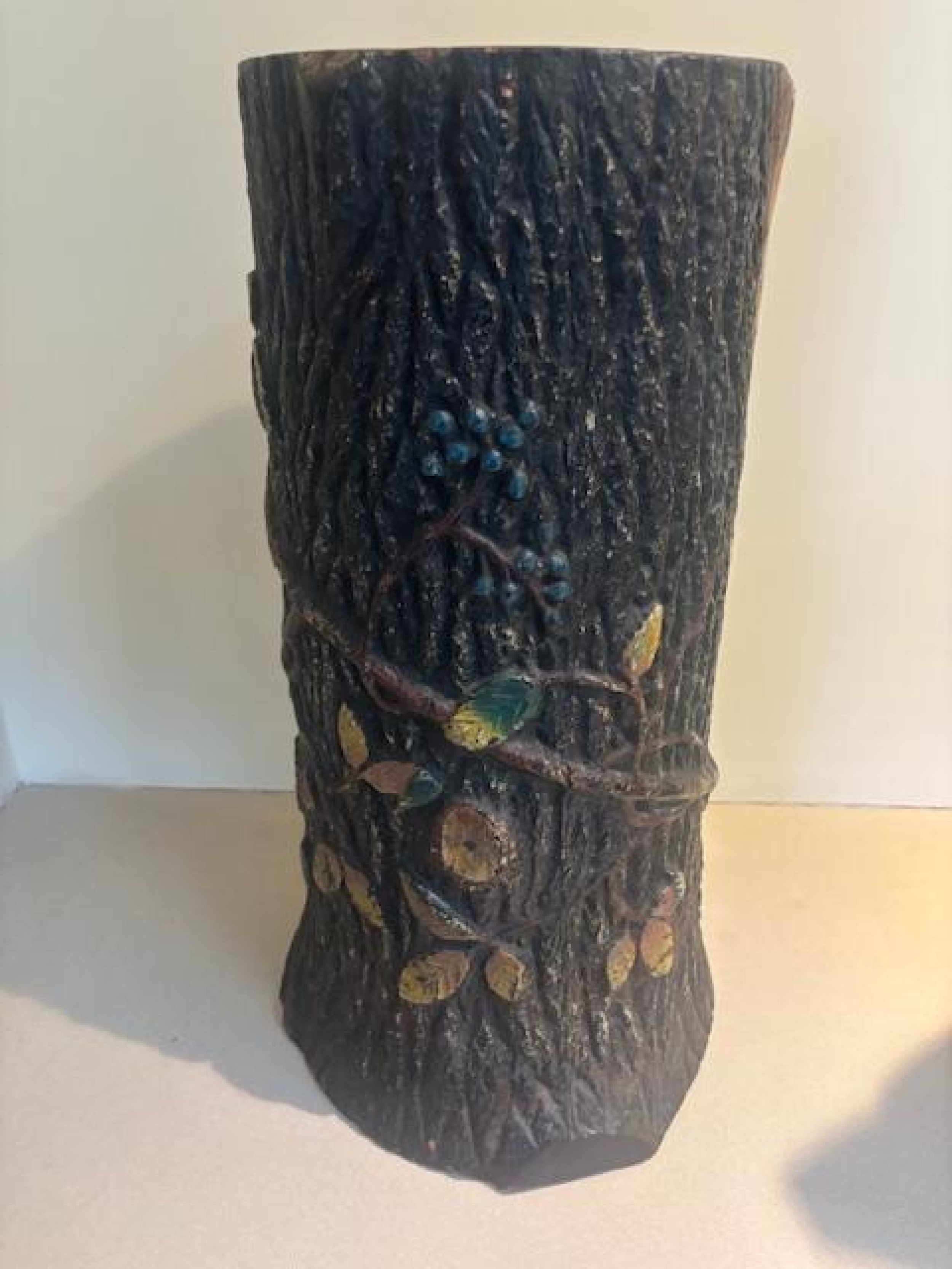 American Country Rustic Adirondack style ceramic faux tree trunk form umbrella stand with a bark and floral vine design