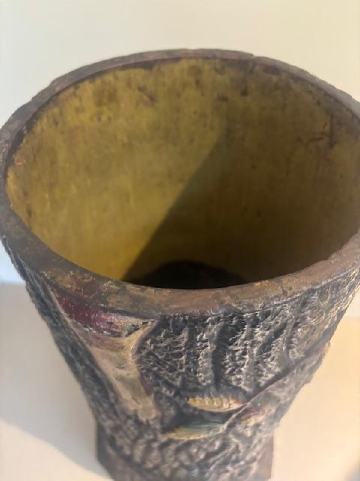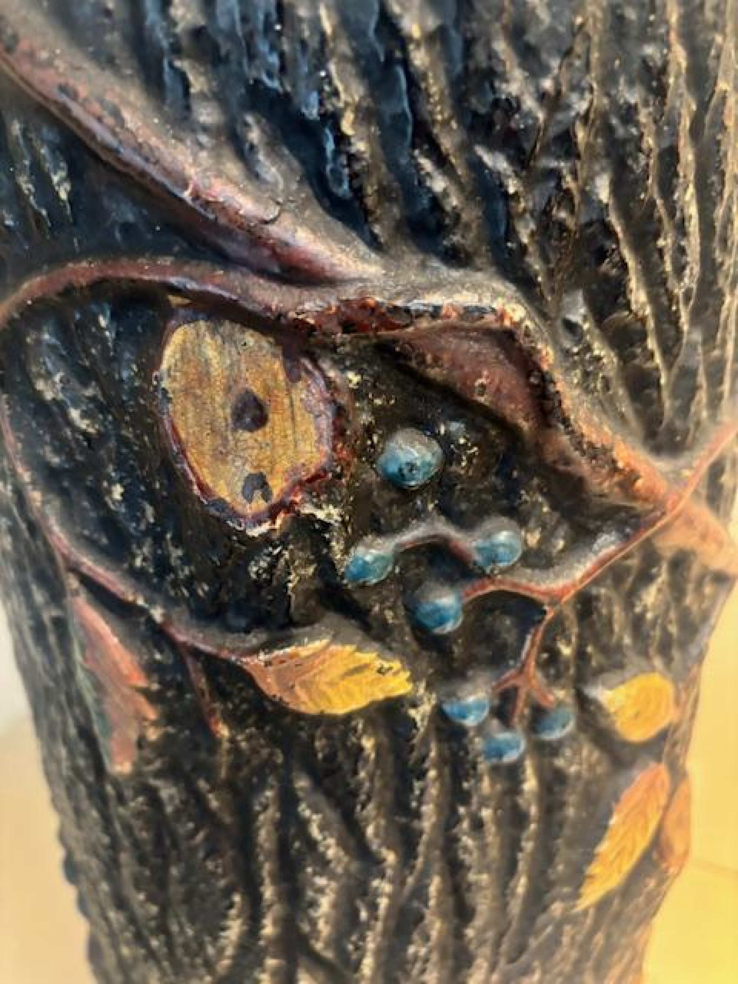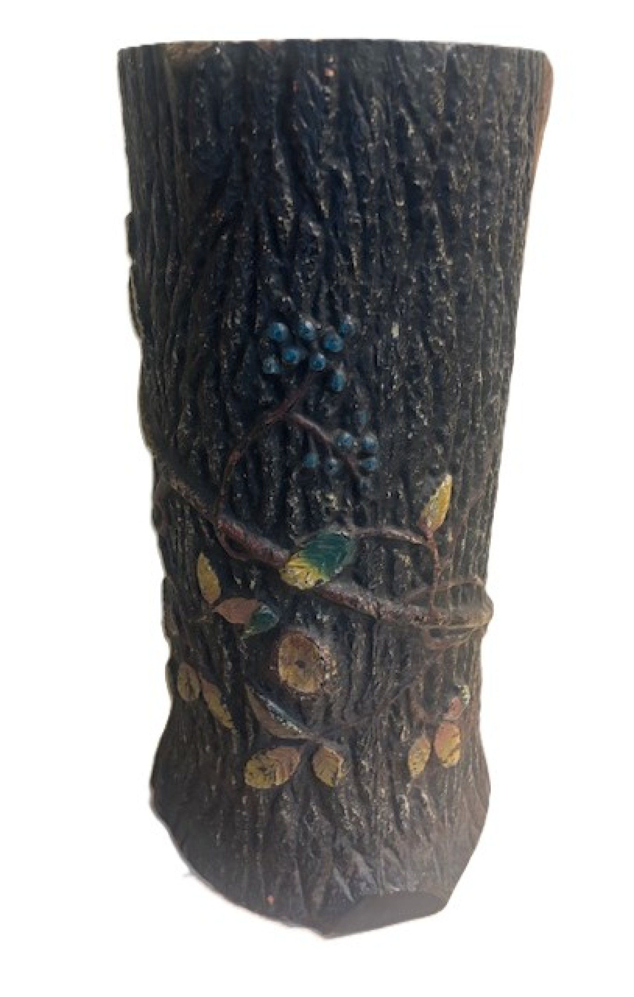 American Country Rustic Adirondack style ceramic faux tree trunk form umbrella stand with a bark and floral vine design