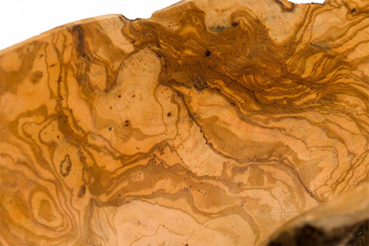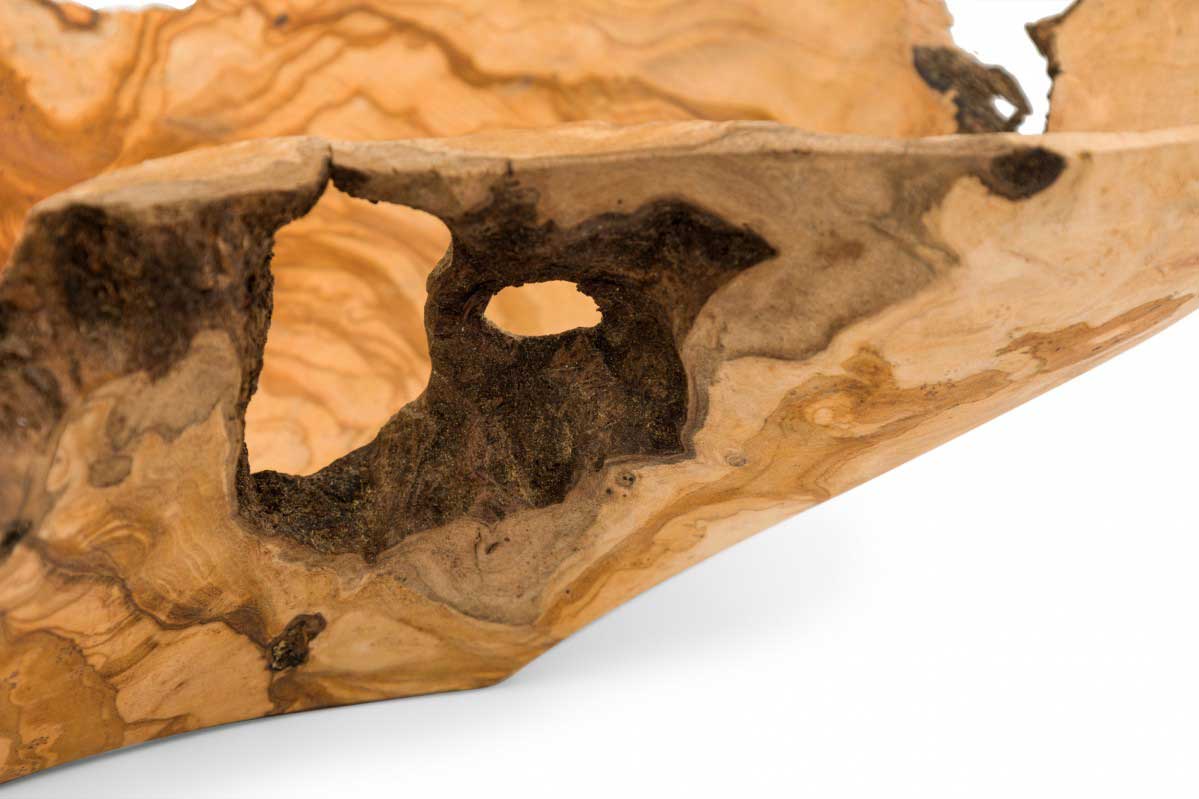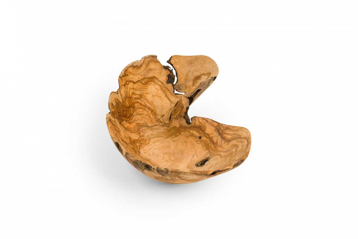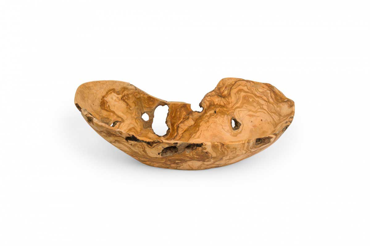 Rustic decorative bowl with an organic curved kidney shape, made of carved and polished olivewood.