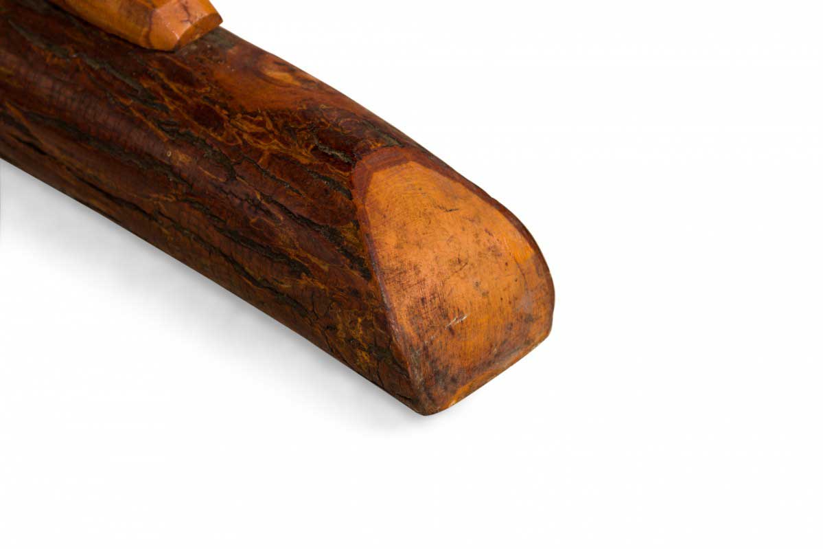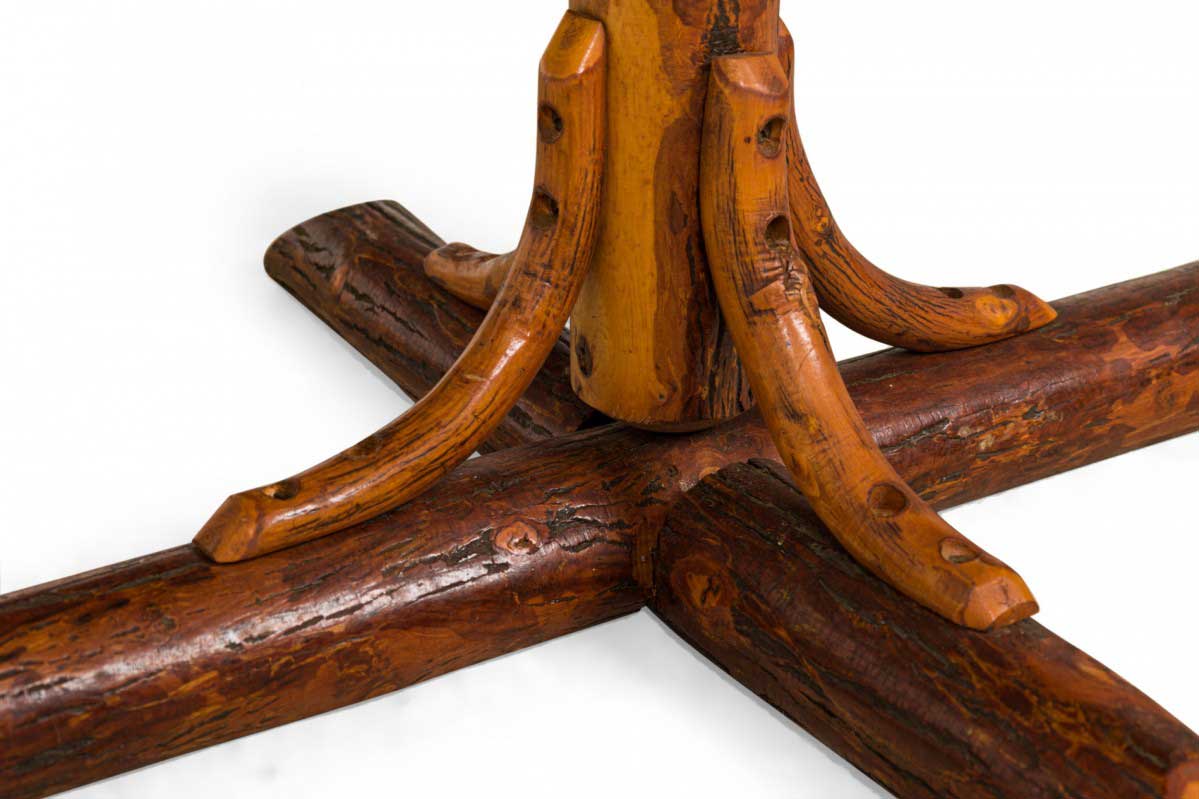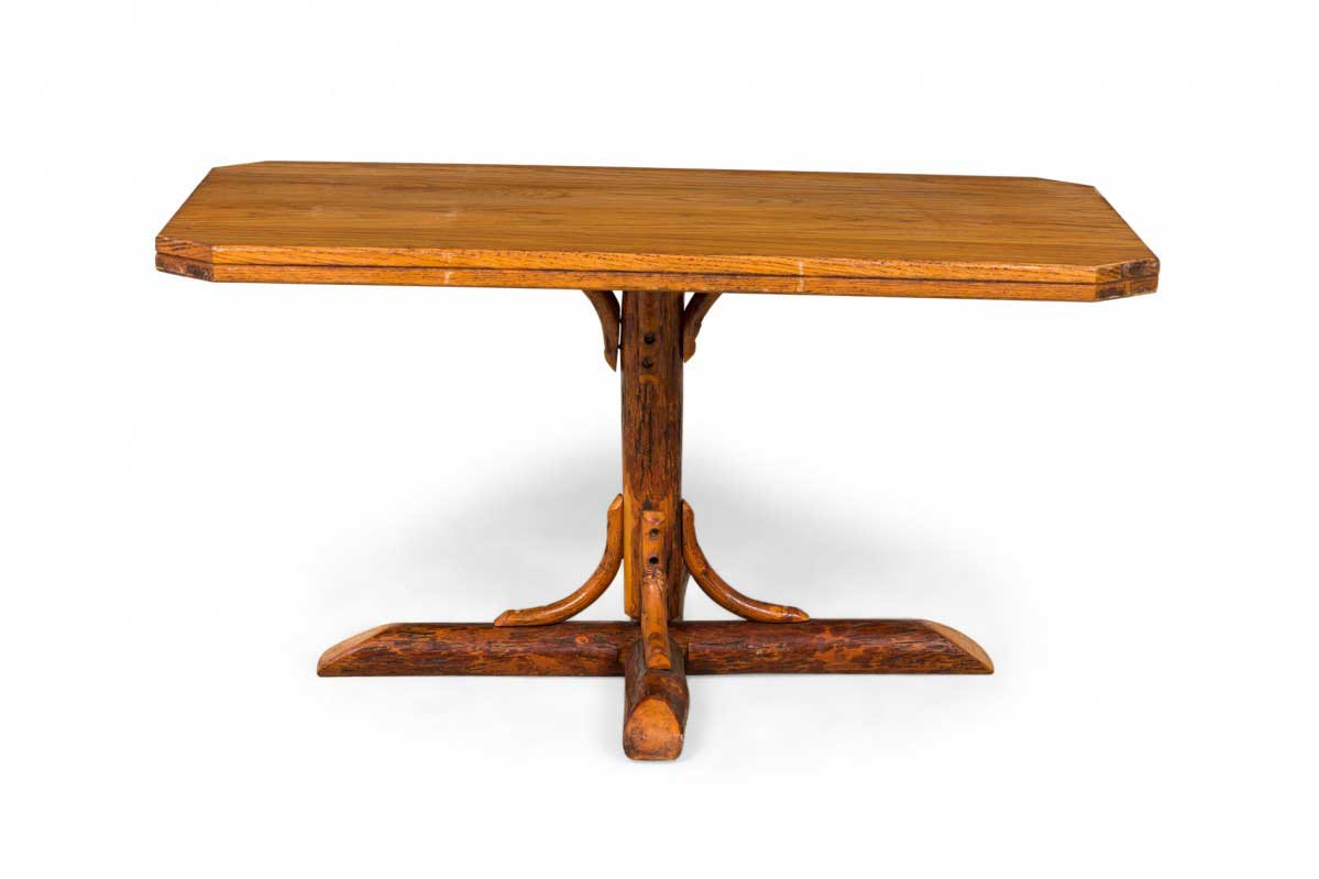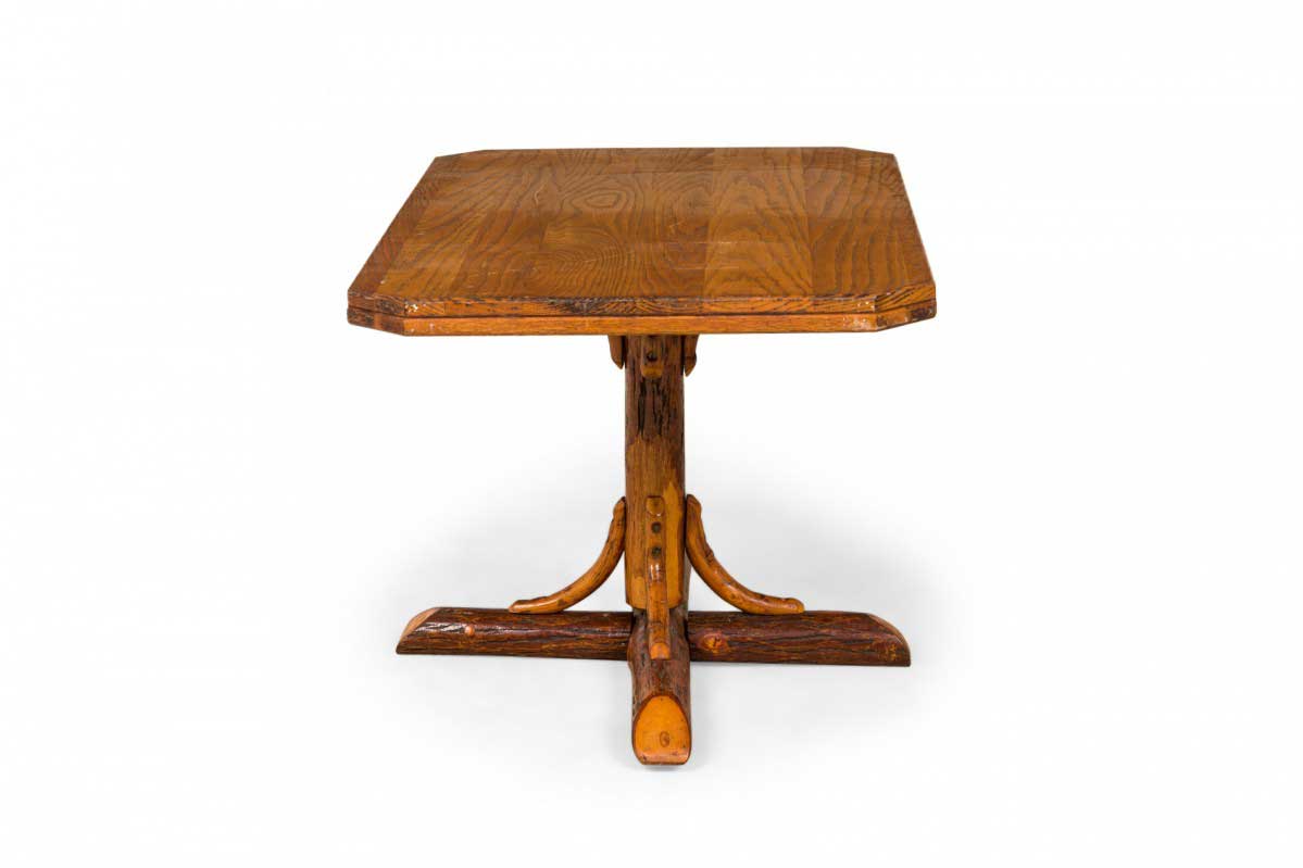 Rustic Old Hickory coffee table with a rectangular oak top with canted corners supported by a pedestal base ending in an x-shaped log foot with bentwood supports.