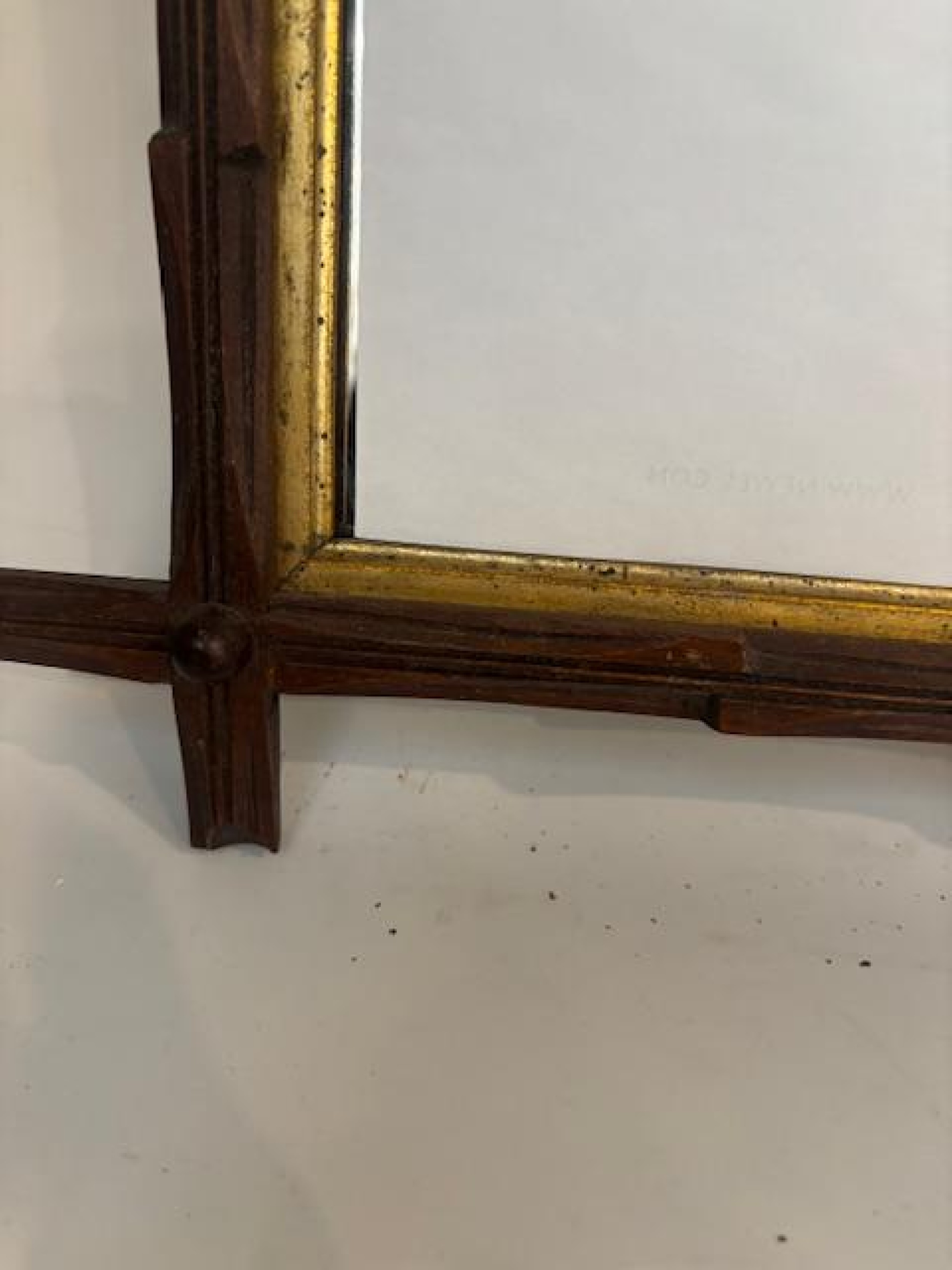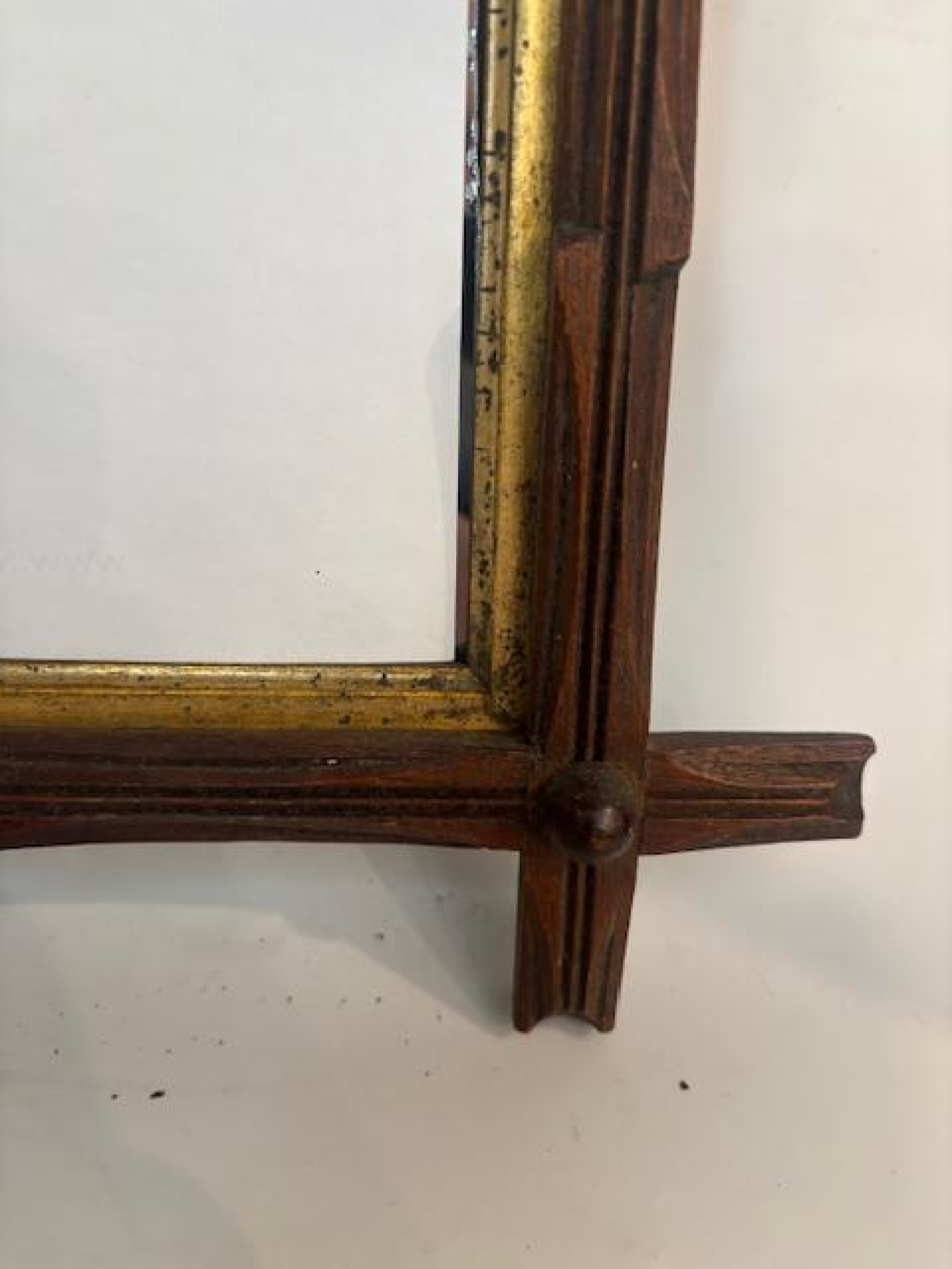 Rustic Adirondack style small mirror with a walnut and gold trimmed frame with a carved faux twig design