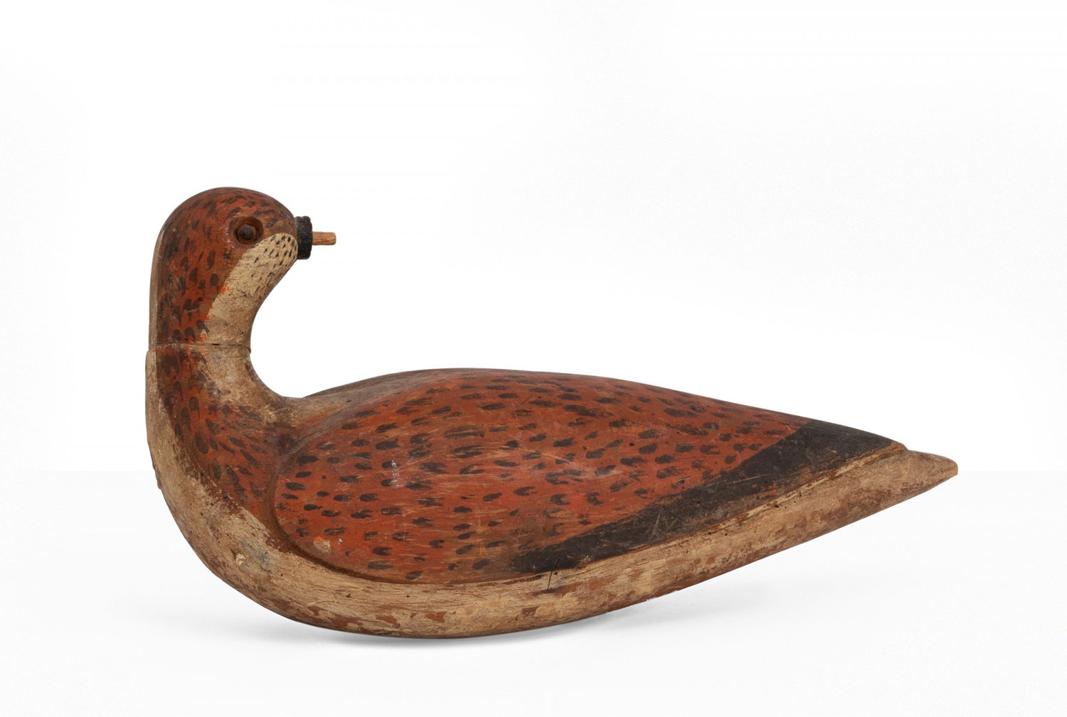 Rustic wooden duck decoy with painted brown, orange and green detail (missing beak)