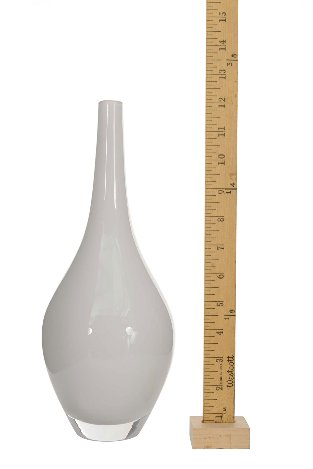 Scandinavian Mid-Century ovoid shaped base white case glass bud vase with a long, tapered neck
