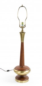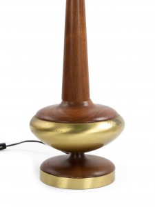 2 Post-War design Scandinavian teak table lamps with a bulbous base and long tapered neck with a brass edge and trim (PRICED EACH)