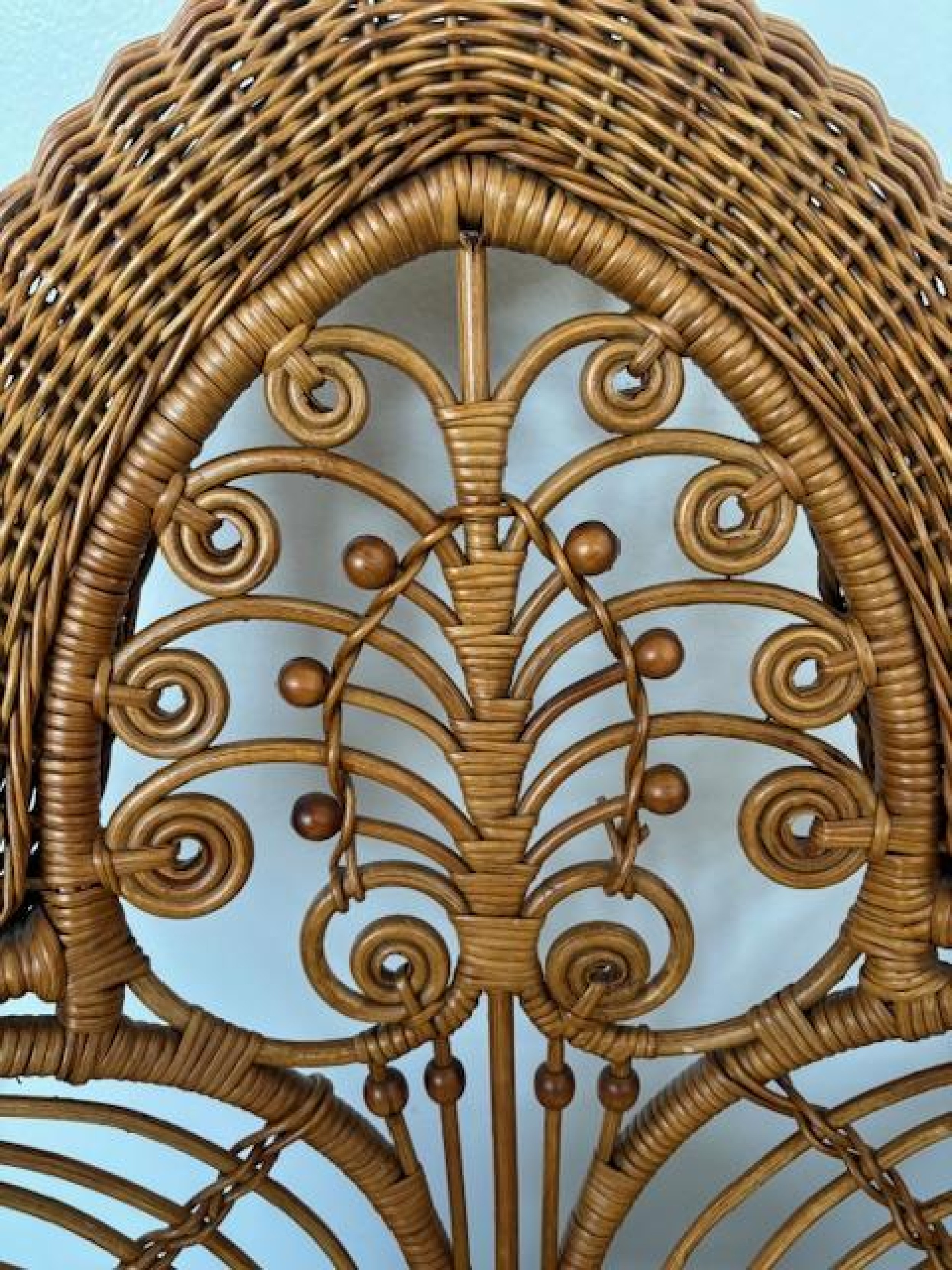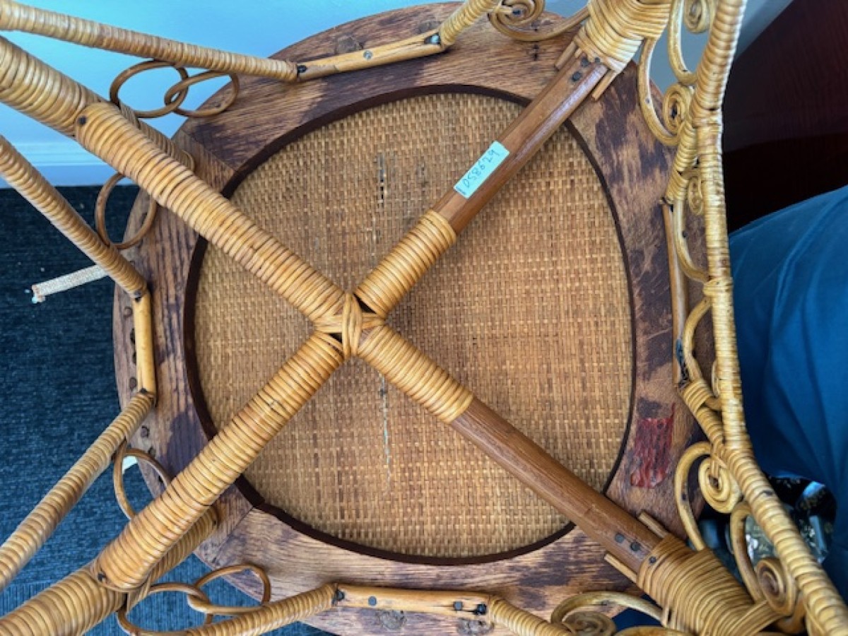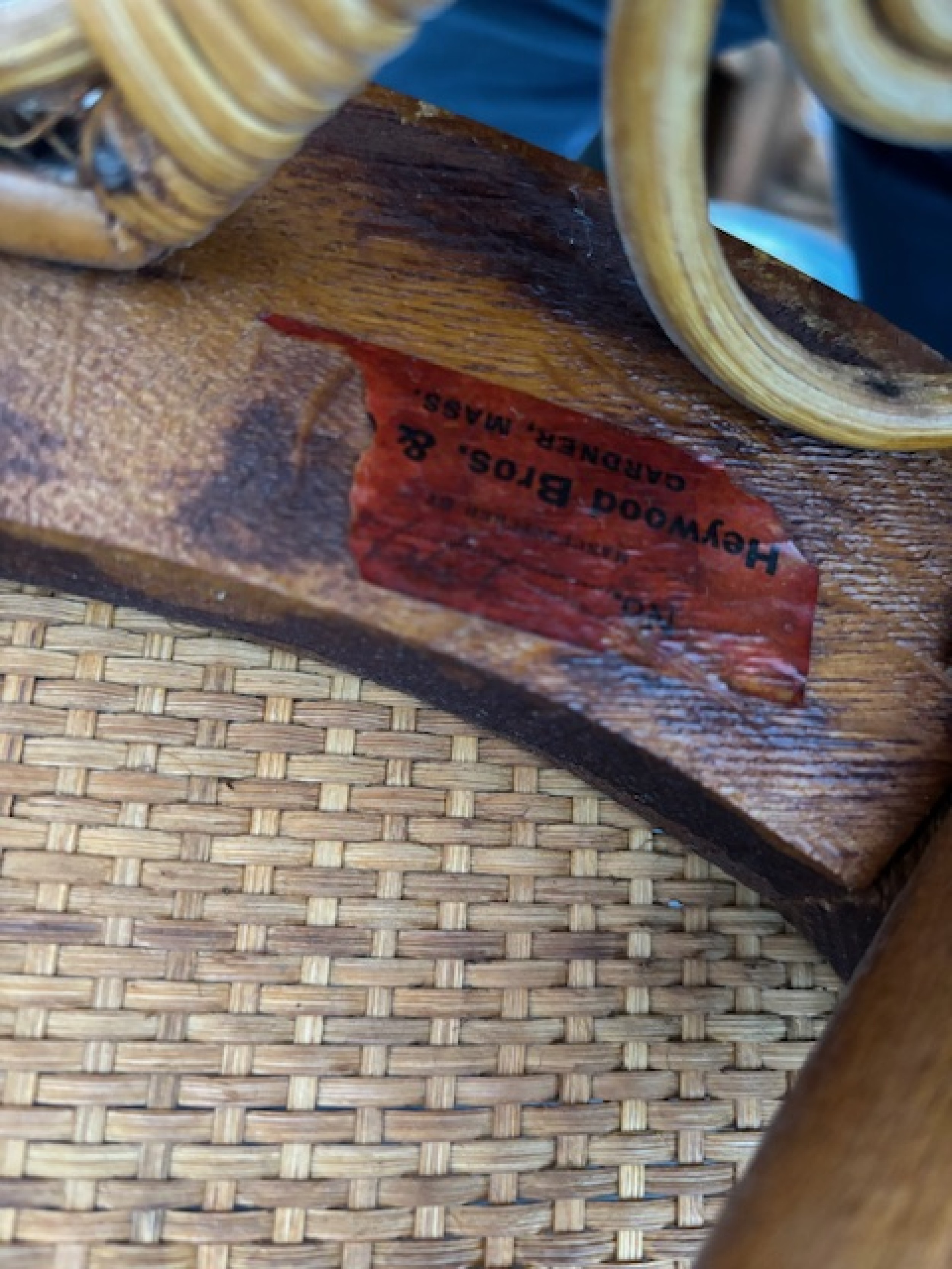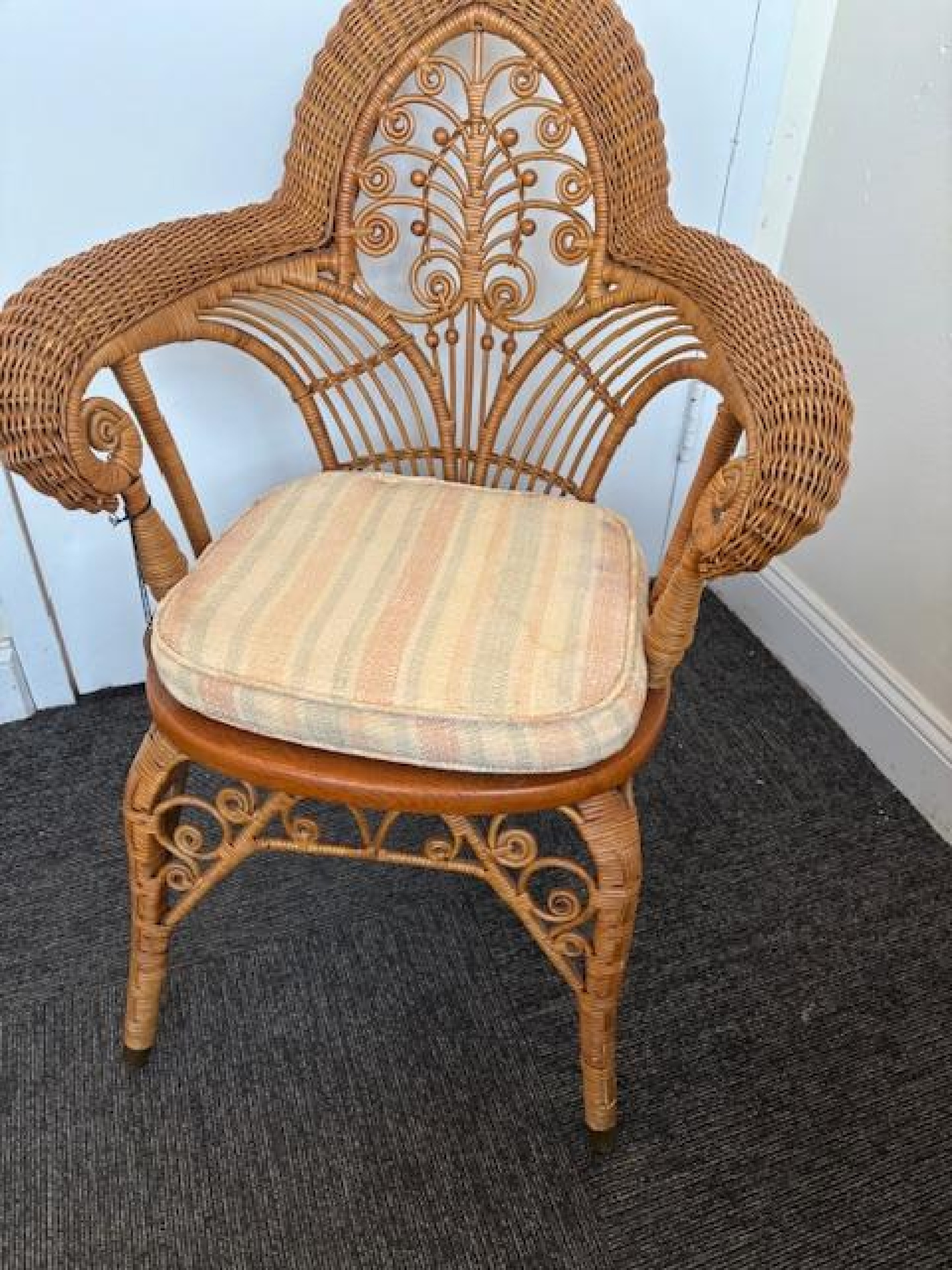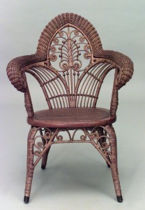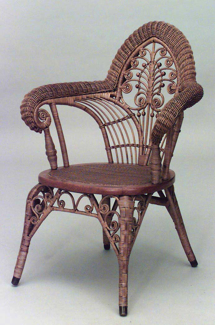 American Victorian natural wicker arm chair with woven roll arms and filigree & scroll deorated arch design back (Heywood Wakefield label)