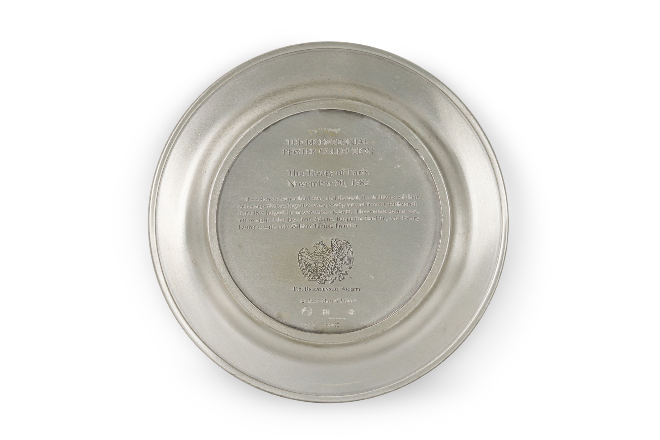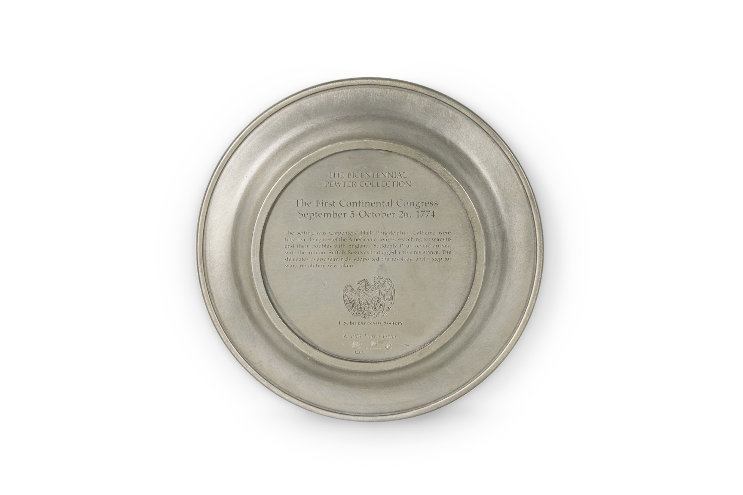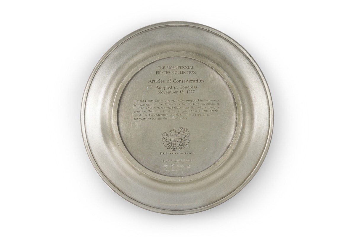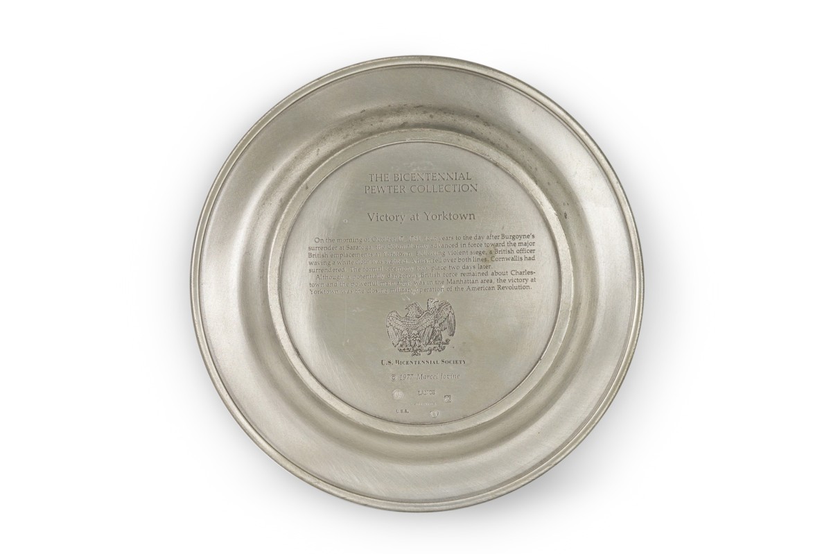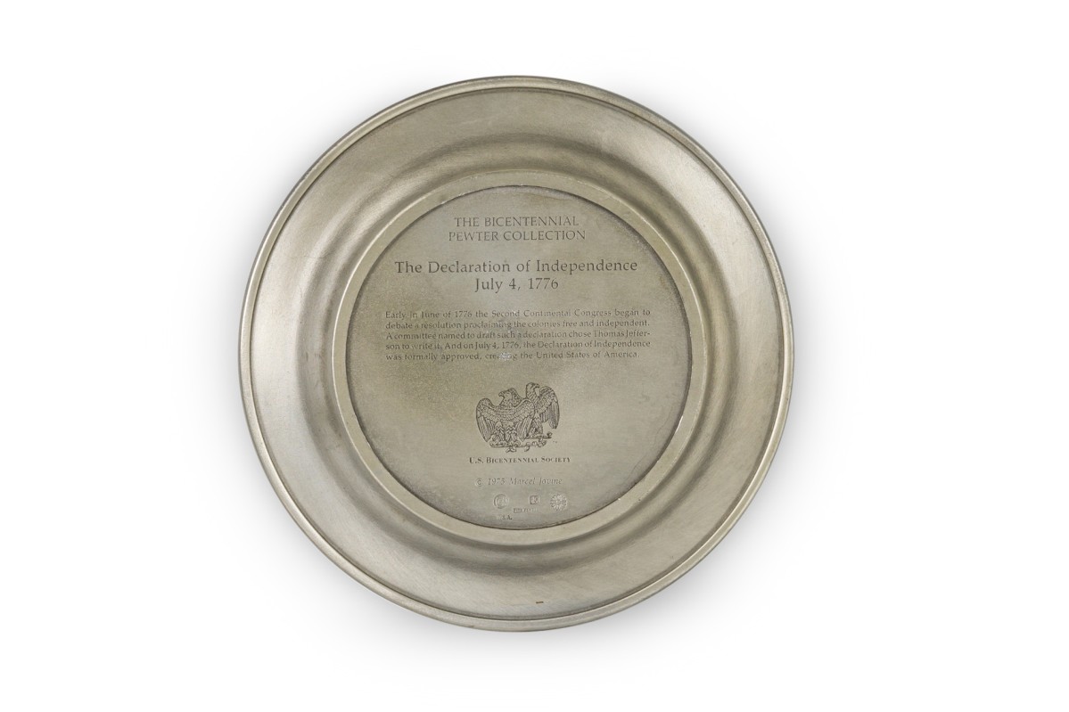 10 American American Mid-Century pewter Bicentennial plates of historical moments each having a different scene in relief (PRICED EACH