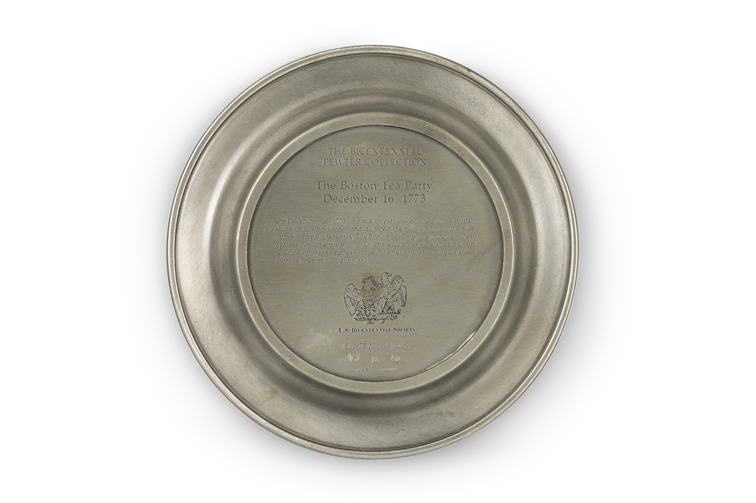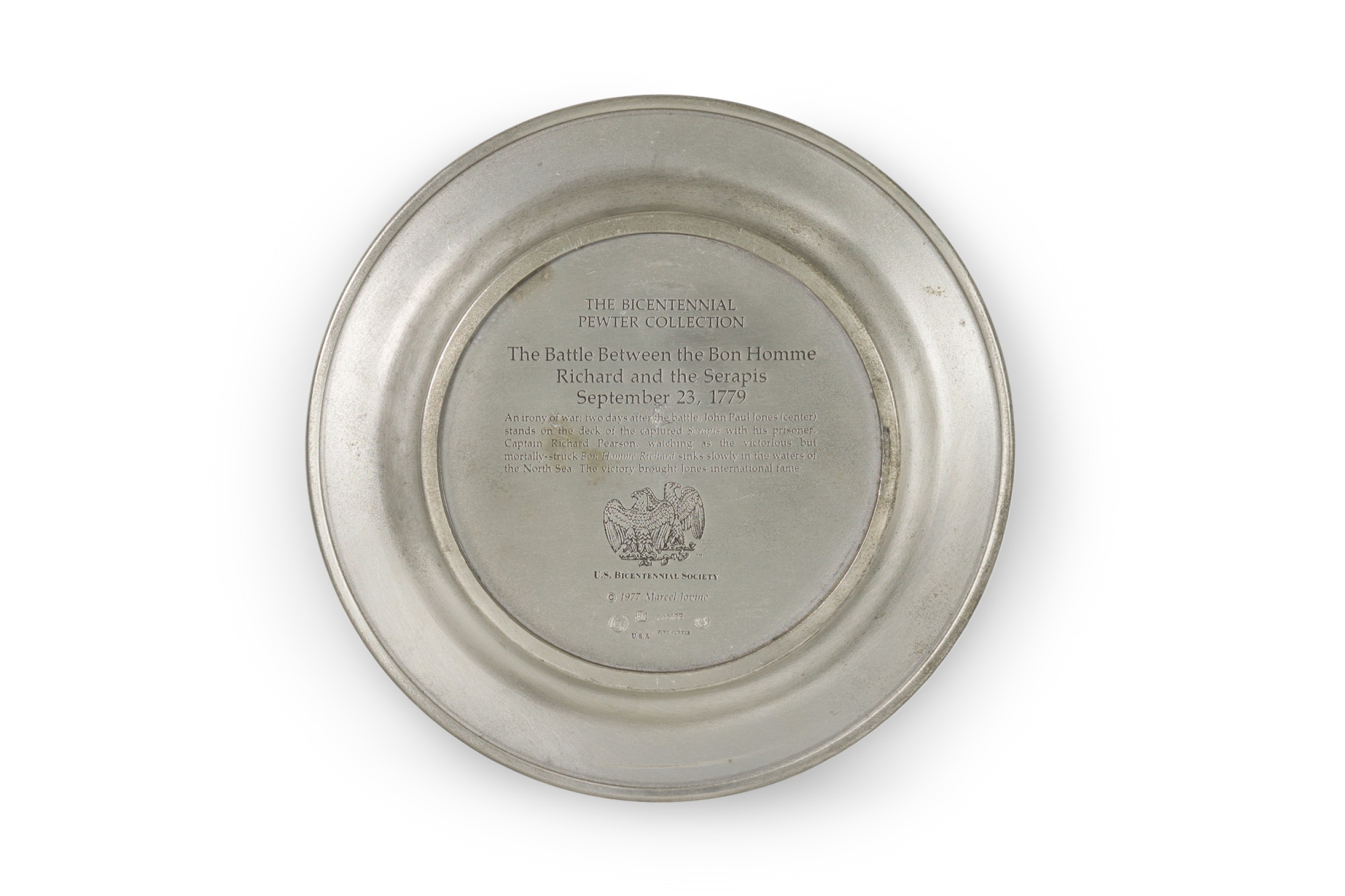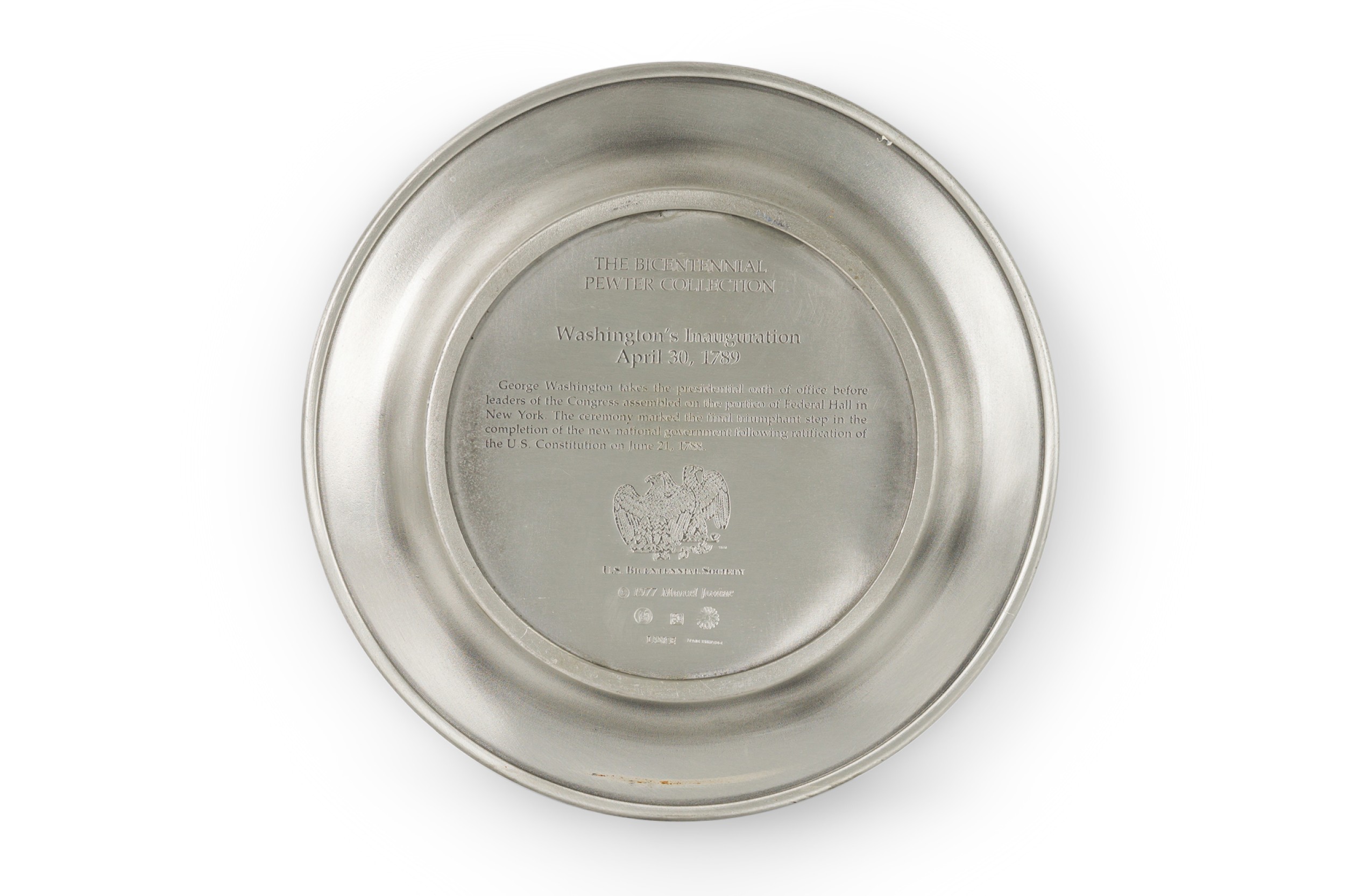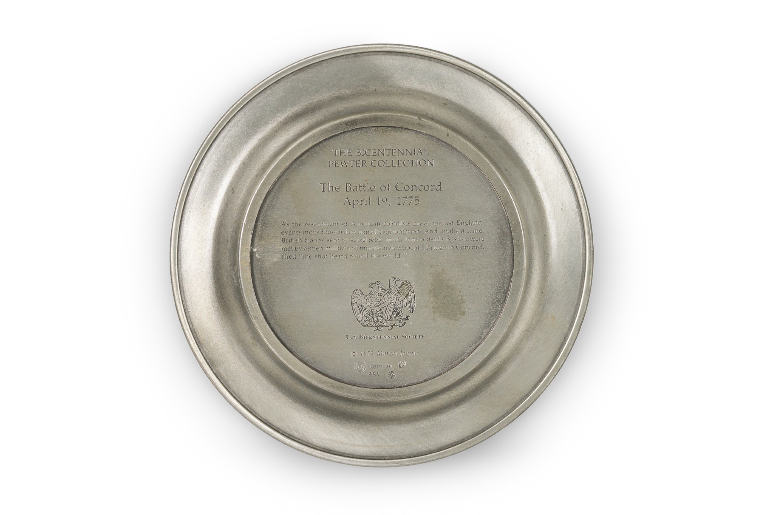 10 American American Mid-Century pewter Bicentennial plates of historical moments each having a different scene in relief (PRICED EACH
